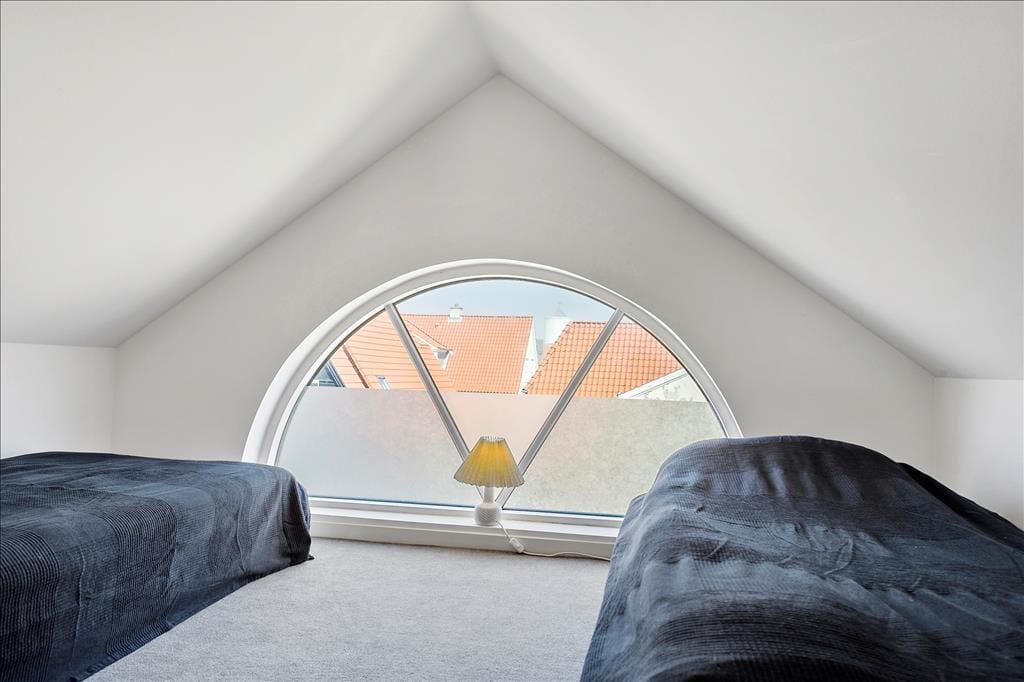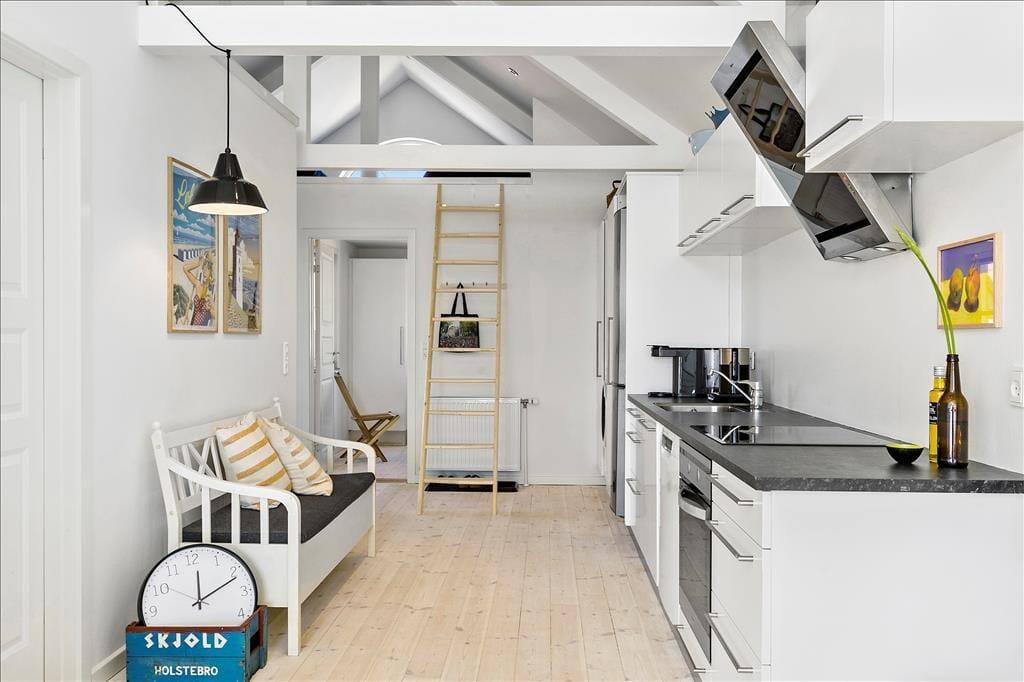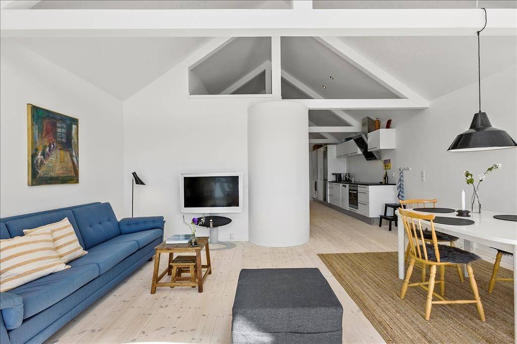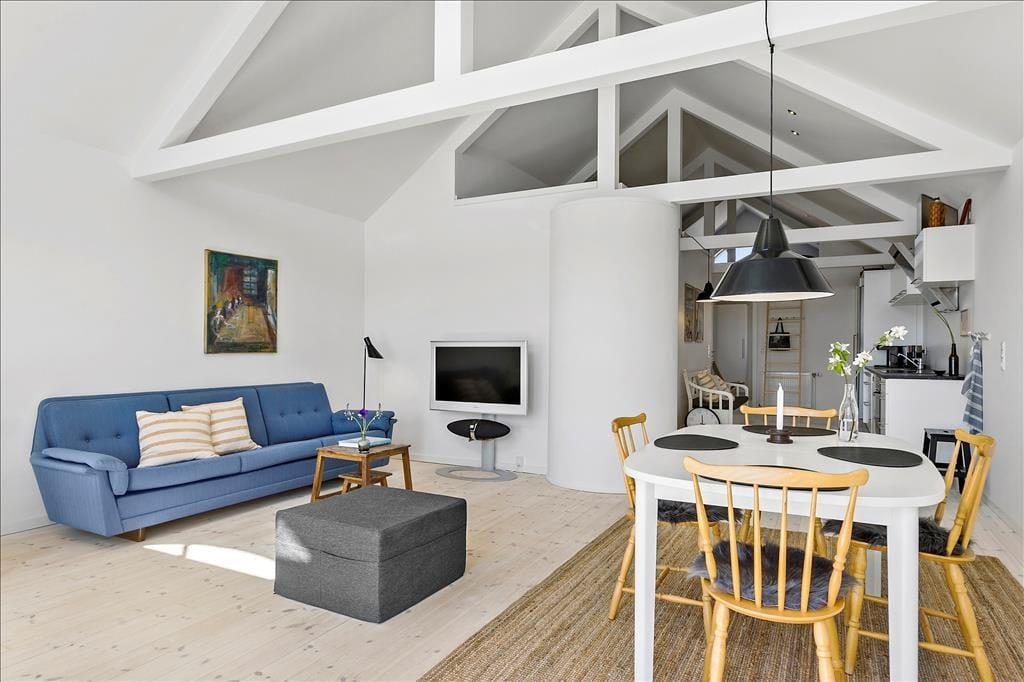 Lejligheden er lys og indbydende med loft til kip og en åben planløsning, der gør det til en god oplevelse at opholde sig inden døre. De synlige tagbjælker er sammen med de lyse trægulve og de smukke vinduespartier med til at sætte en helt særlig stemning, som virkelig får denne feriebolig til at skille sig ud fra mængden. Køkken og stue ligger i åben forbindelse, og opholdsrummet er indrettet med både spisebord og sofaafdeling. Herfra er der udgang til den hyggelige terrasse, som bliver en naturlig udvidelse af opholdsarealet, når sommersolen skinner. Lejligheden indeholder herudover to soveværelser, samt en hems med ekstra plads at brede sig på. Endelig er der et badeværelse med muret bruseniche.