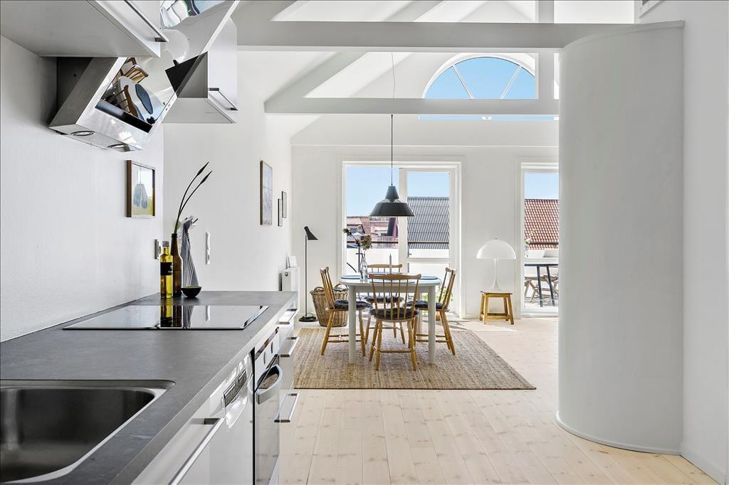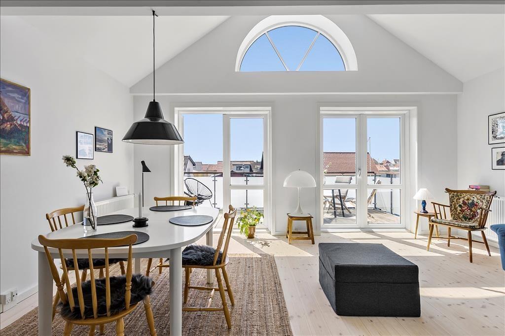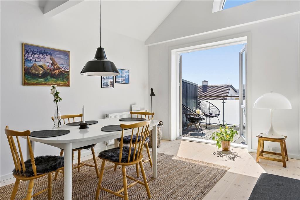 Der er et fantastisk lysindfald i denne flotte ferielejlighed i Løkken, som også byder på en skøn terrasse med udsigt over klitterne og det gamle fiskerleje. Med blot 250 meter til vandet får I her det perfekte udgangspunkt for at nyde både strand- og bylivet i en af Danmarks mest efterspurgte feriebyer.