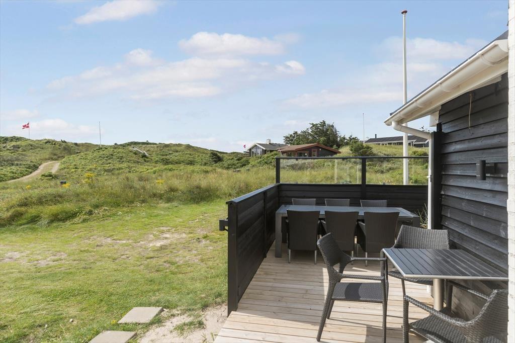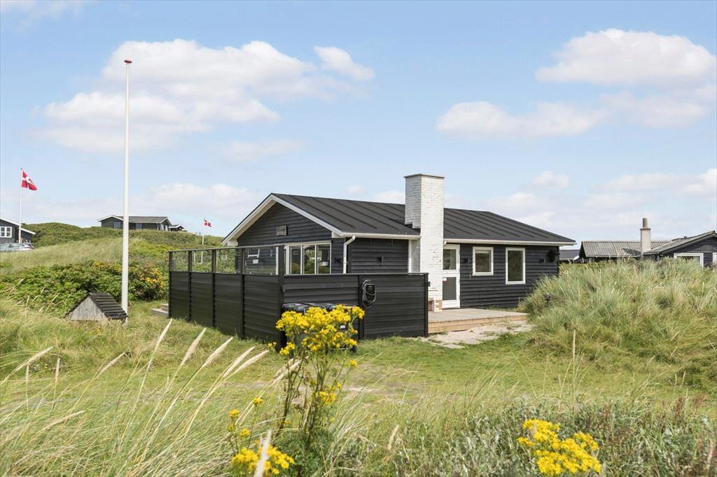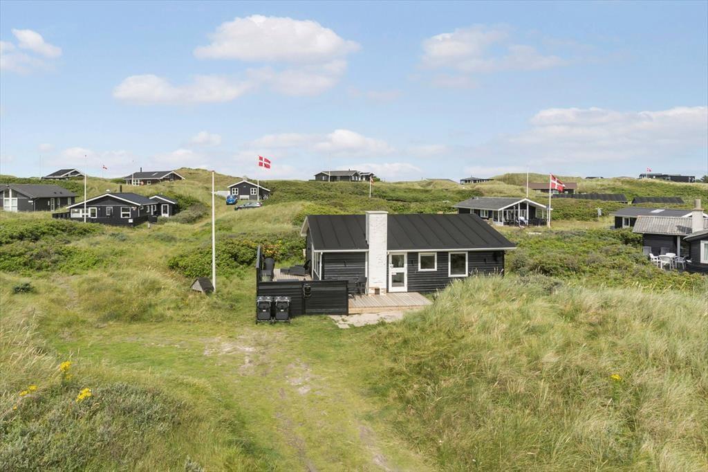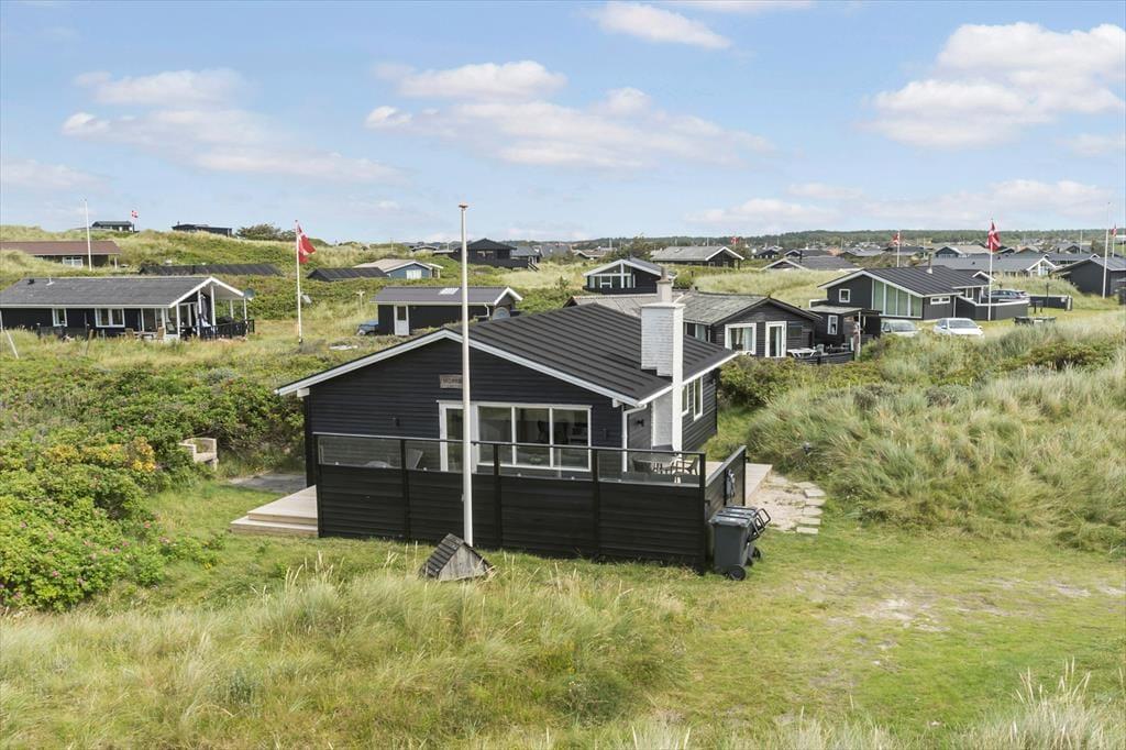 Dette dejlige sommerhus ligger i det kuperede kystlandskab på den lille, lukkede Bentevej tæt på Løkken. Går I over klitterne, er der kun 150 meter til den hvide sandstrand, men der er nu også god grund til at bruge en stor del af ferien inden døre i den hyggelige stue eller ude på sommerhusets solterrasser.