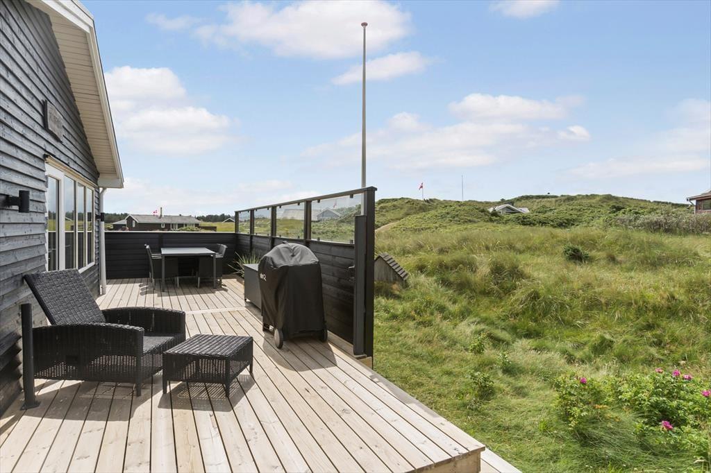 Feriestemningen er også helt i top, når I slapper af ude i det fri på klitgrunden. Her kan I slænge jer på husets store solrige terrasse, der er delvist afskærmet – så der er mulighed for at finde læ selv på en dag med vestenvind. For at I kan have det komfortabelt, er der både havemøbler og liggestole til rådighed, og I kan også finde grillen frem, hvis I får lyst til at tilberede aftensmaden ude i det fri.