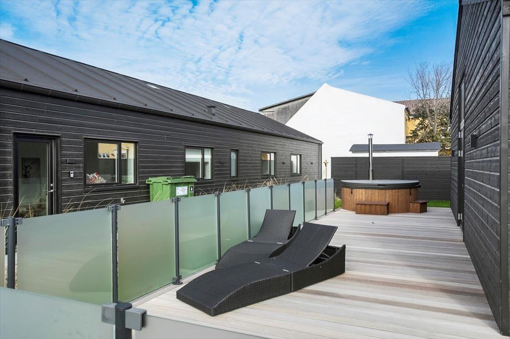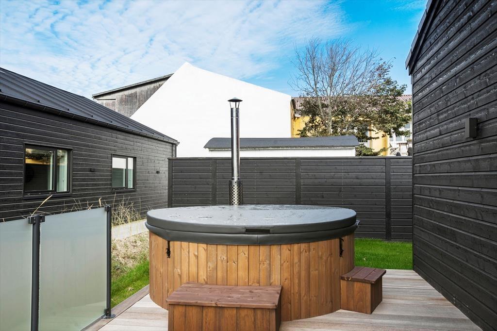 Afslapningsstunderne kan også passende foregå ude i det fri – for eksempel i det skønne vildmarksbad, hvor I kan sidde med udsigt til stjernehimlen i det varme vand. Er det nærmere vejr til at flade ud i en god liggestol, kan det også sagtens lade sig gøre på den store og delvist overdækkede og afskærmede terrasse. Ved huset er der for øvrigt en udendørs bruser og et græsareal, hvor I kan spille bold eller lege med hunden, hvis I har sådan en med på ferie.