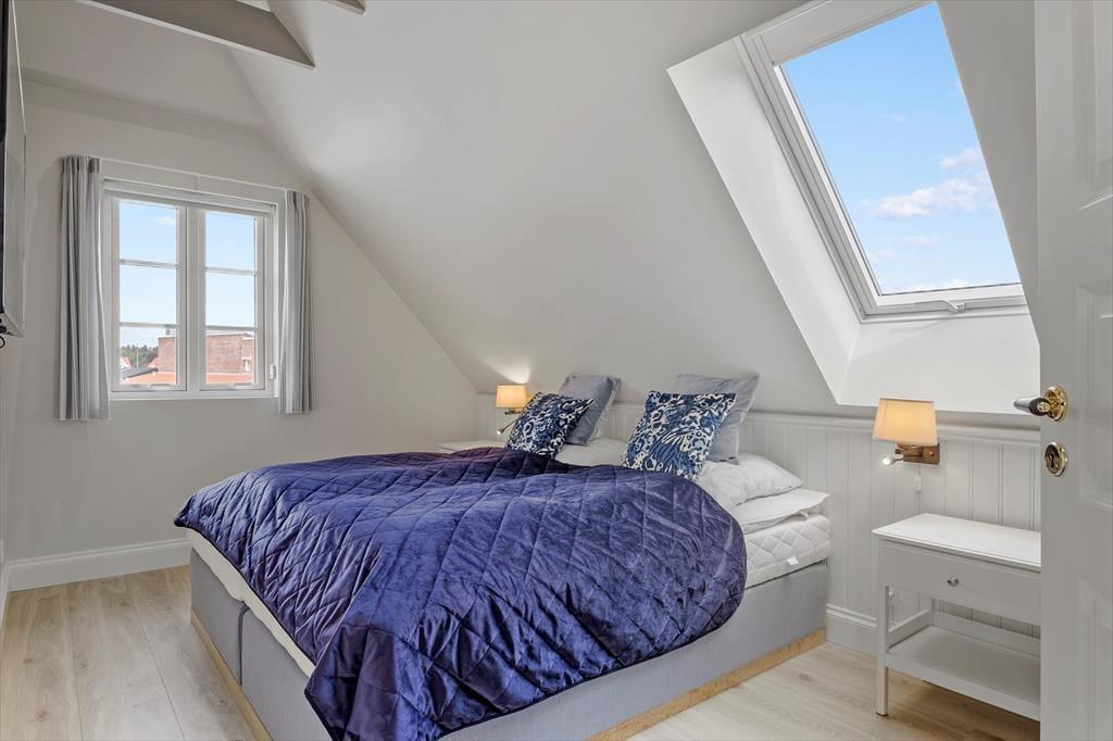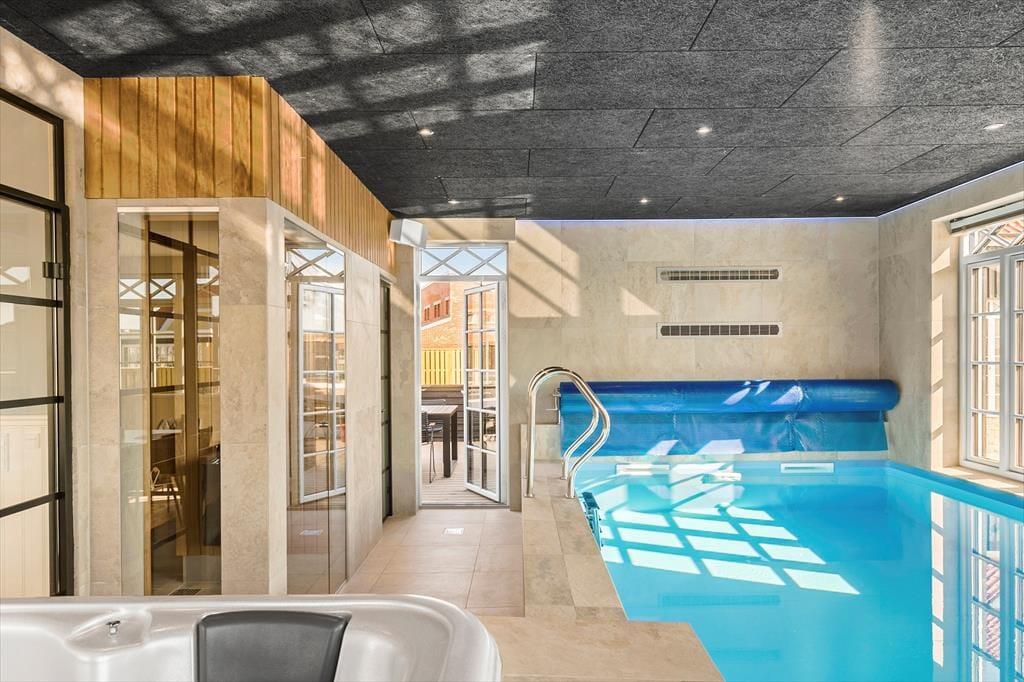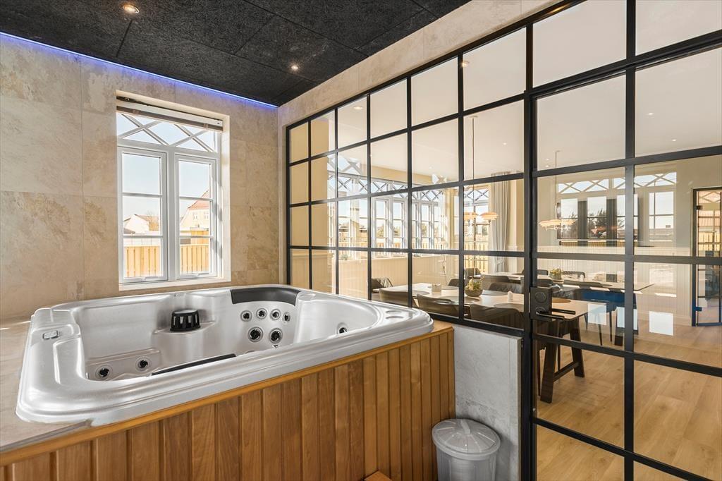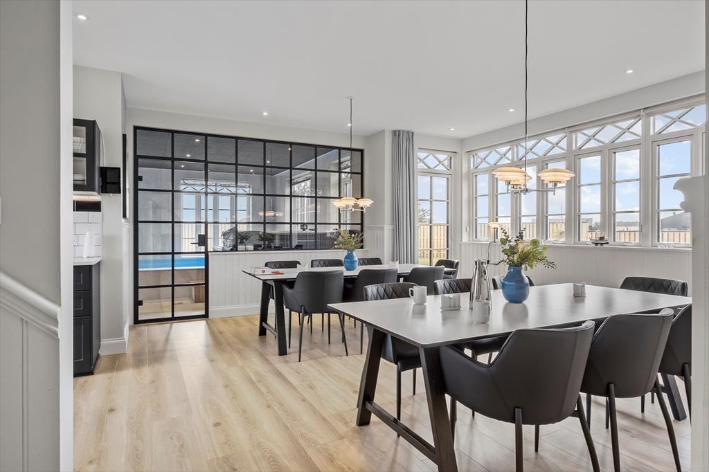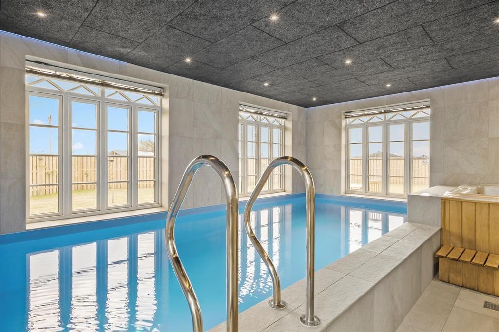I får en særdeles stilfuld og rummelig ramme om ferielivet i det 238 m2 store sommerhus, der er indrettet efter alle kunstens regler. Stilmæssigt balancerer rummene perfekt mellem det klassiske og moderne, og det gør virkelig noget særligt for atmosfæren. Sommerhusets seks soveværelser er fordelt mellem stueplan og førstesalen, og der er også badeværelse både oppe og nede. Husets tredje badeværelse ligger som del af wellnessafdelingen, hvor I kan svømme i swimmingpoolen, slappe af i spabadet og blive varmet helt igennem i saunaen. En stor del af ferien kan oplagt bruges på wellness, men det er nu også herligt at samles til udsøgte måltider i det tilstødende køkken-alrum, og selv madlavningen kan blive en leg, når I har så gode arbejdsforhold. Hyggestunderne kan også udspille sig i førstesalens stue, der er indrettet med komfortable siddemøbler og har direkte adgang til en vestvendt altan.