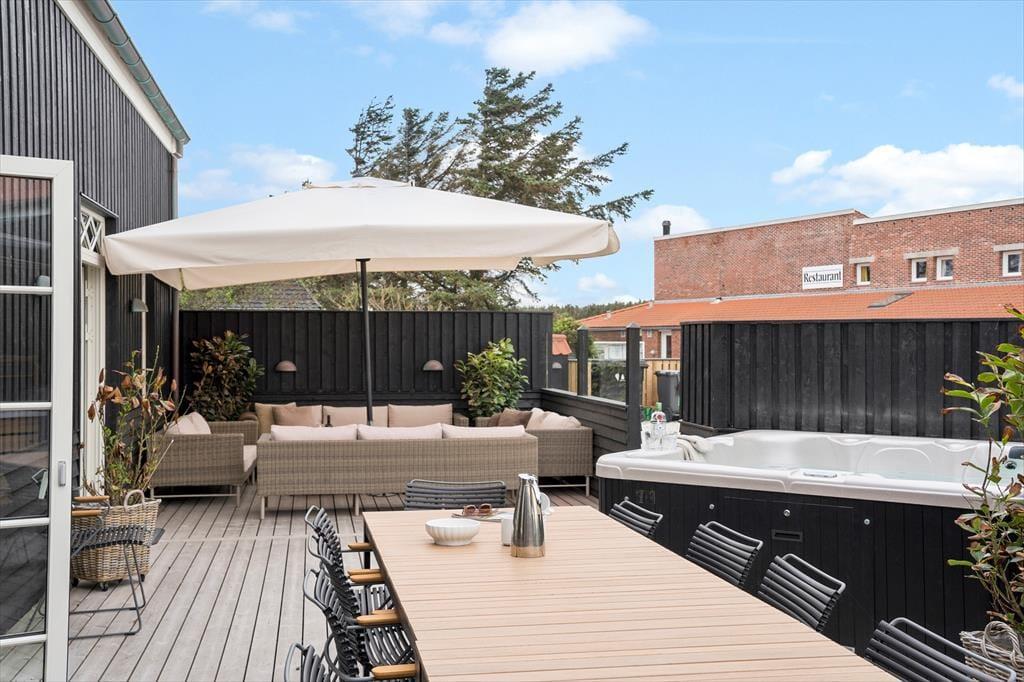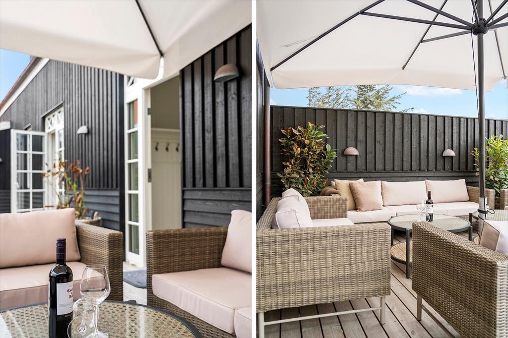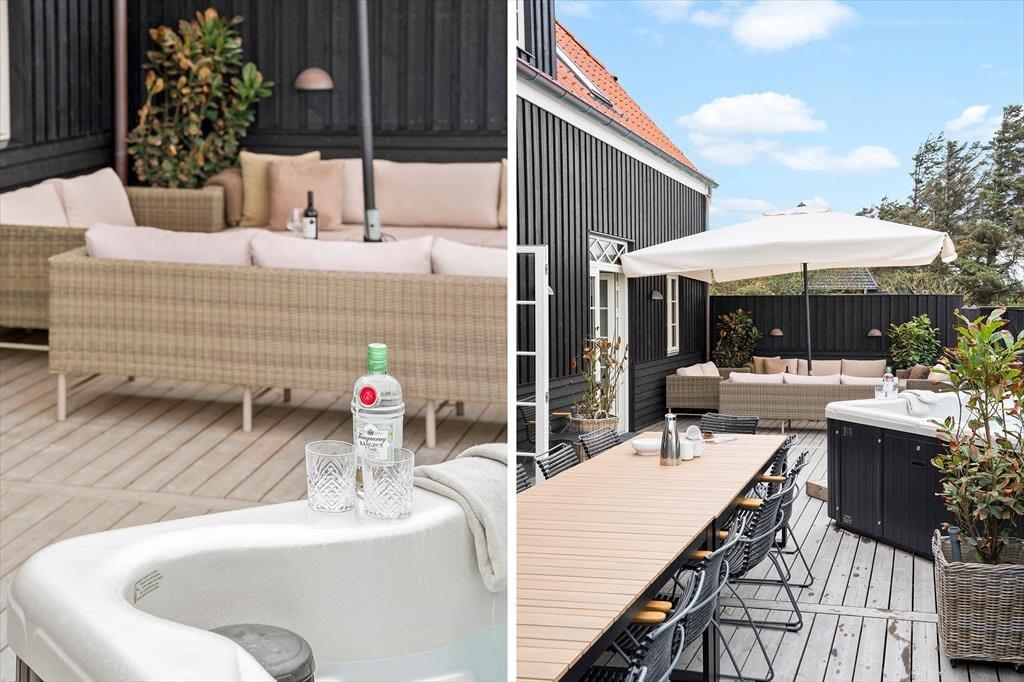 En stor og godt afskærmet terrasse breder sig på sommerhusets østside. Her har I god plads til at nyde livet, uanset om I vil spise frokost i solen, hygge jer med en aperitif i loungeområdet eller sidde under stjernehimlen i det lækre spabad.