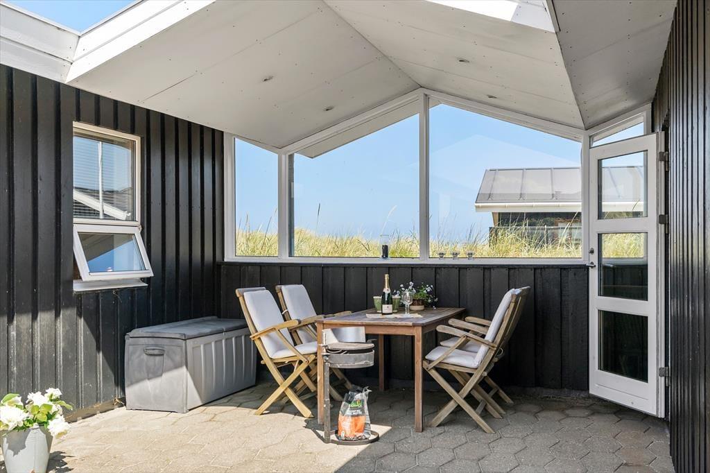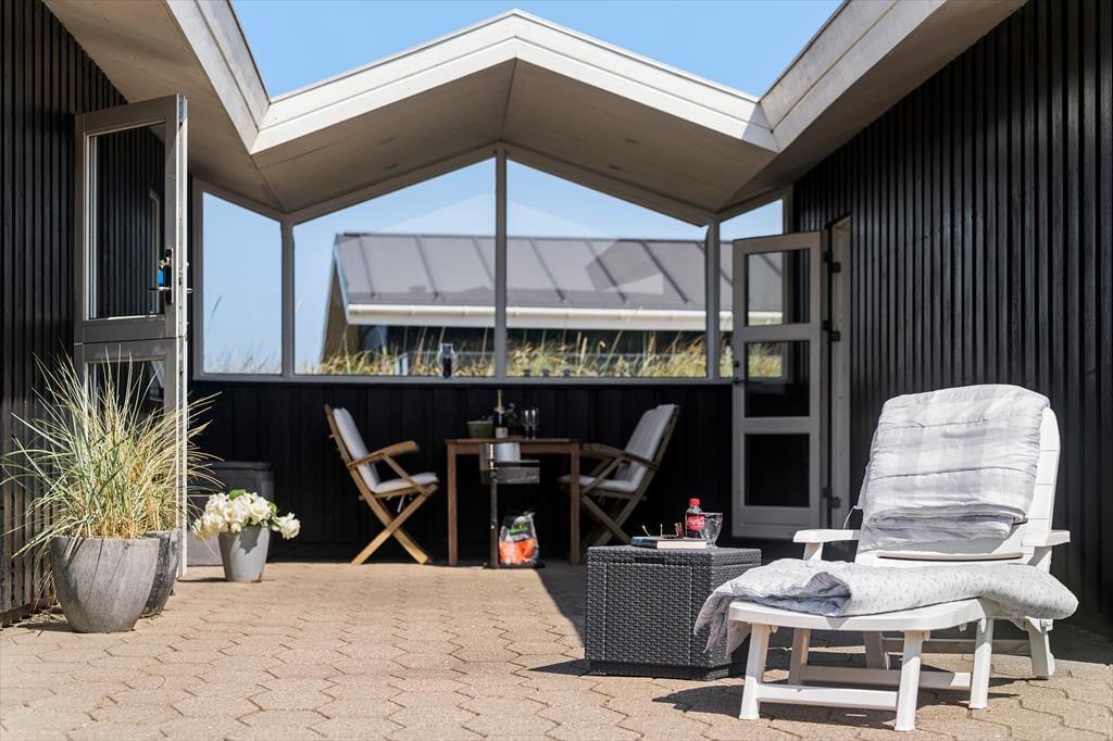 Et flisebelagt og delvist afskærmet terrassemiljø breder sig mod syd og mellem huset og annekset, så I får rig mulighed for at finde en opholdsplads med læ og sol. Fra den overdækkede terrassekrog kan I endda se havet bag klitterne, men vil I for alvor nyde havudsigten, skal I tage turen op til klitgrundens udsigtsbænk, hvorfra I har et flot panoramavue over stranden og det åbne vand.