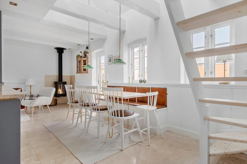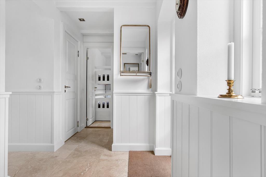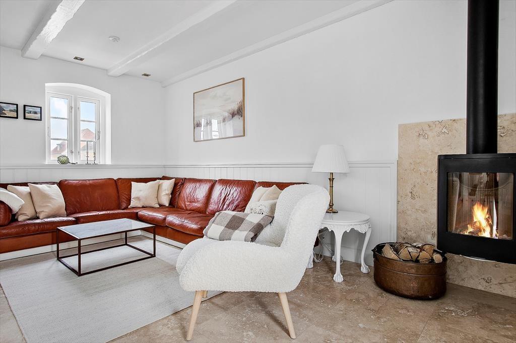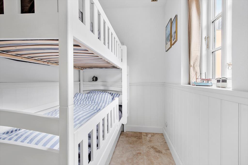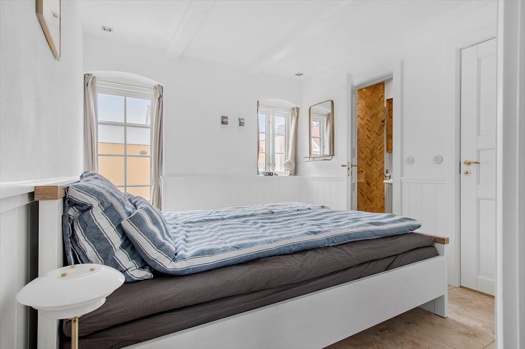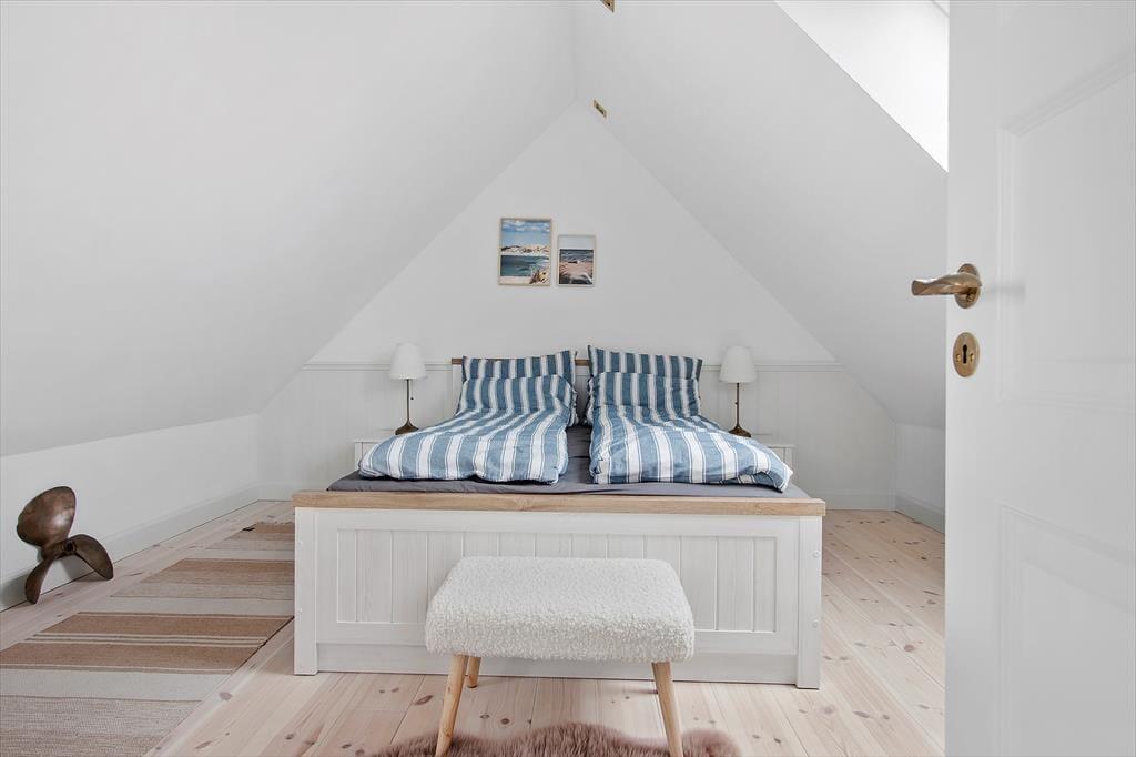 Sommerhuset er mere præcist et klassisk fiskerhus med gul facade og rødt tegltag, og allerede før, du træder indenfor, er det tydeligt at se, at ejendommen fremstår særdeles velholdt. Samme indtryk gør sig gældende inde døre, hvor et lyst og indbydende feriehjem åbenbarer sig: Alt, lige fra de smukke gulve og høje vægpaneler til det elegante køkken og den væghængte brændeovn bidrager til helhedsindtrykket, så du kan straks føle dig godt tilpas i stuen. Ikke bare her, men også på de fire soveværelser og på førstesalens gennemgangsrum minder maritime nipsgenstande og billeder dig om, at du befinder dig meget tæt på stranden – og det giver også rummene et skær af badehotel, som understreger luksusfornemmelsen af ro og hygge. Huset er godt isoleret og velegnet til udlejning hele året.