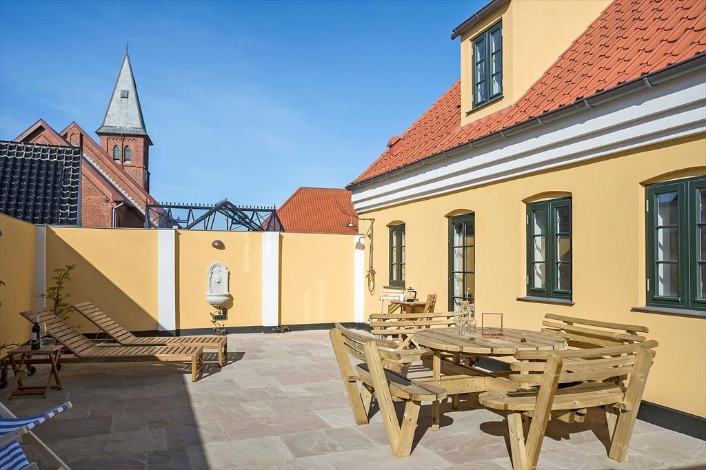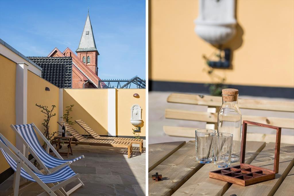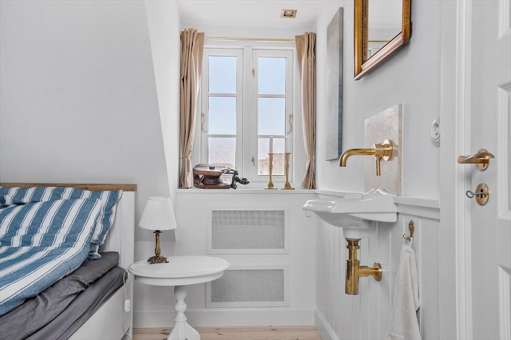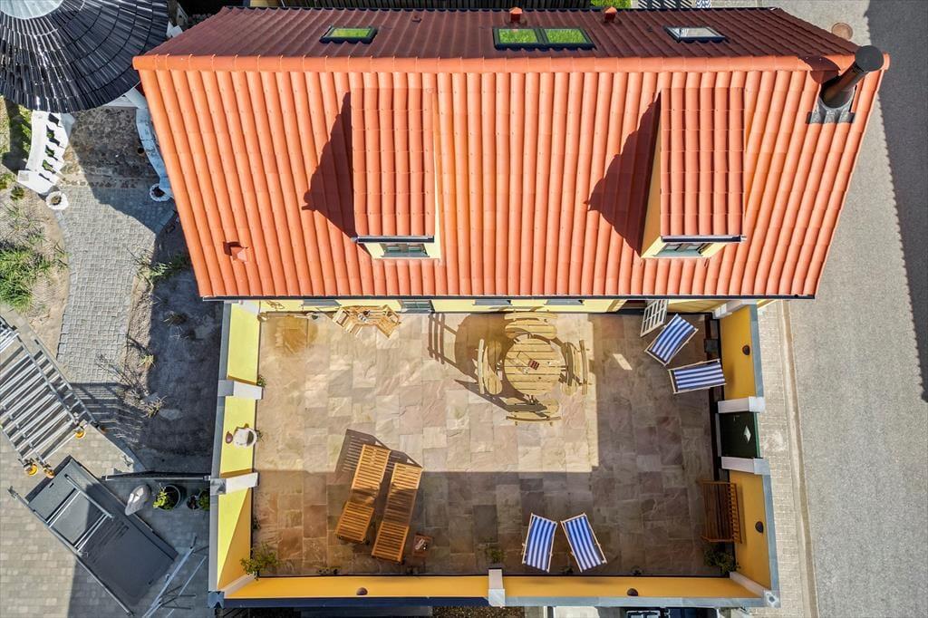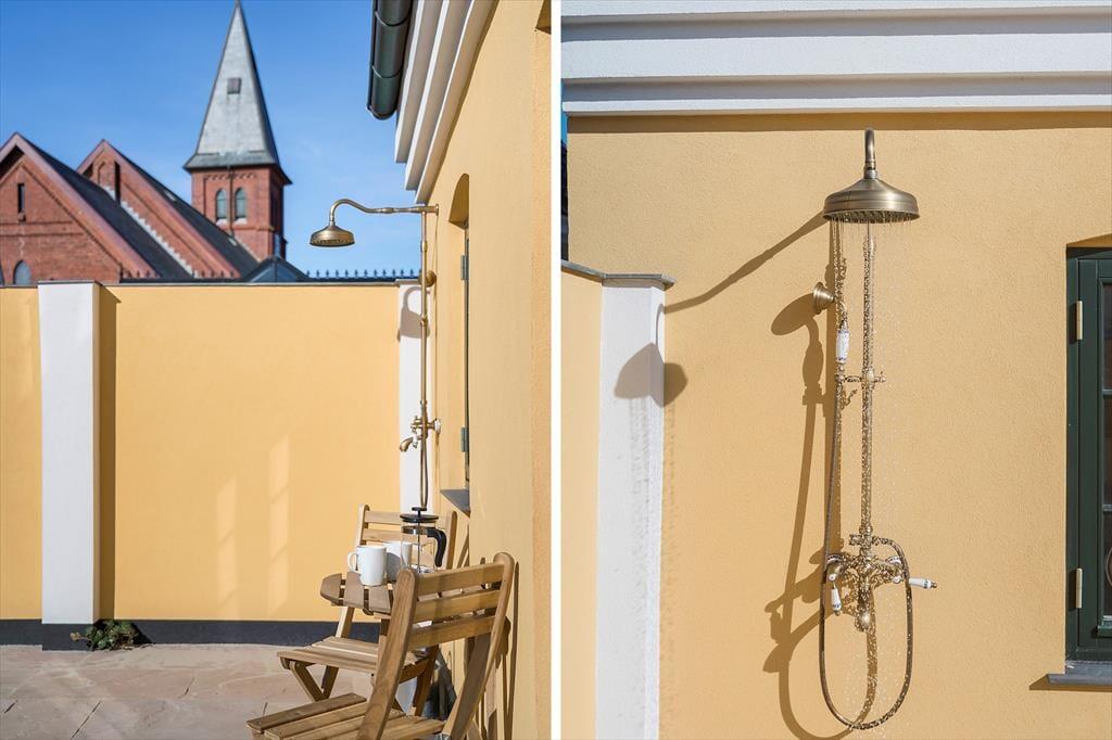 På sommerhusets flotte badeværelser er det skønt at bruse sig, men hvis du lige er vendt hjem fra en strandtur og dagens første dukkert, vil du måske hellere skylle sand og saltvand af under udebruseren. Her kan du stå og bruse dig i husets lukkede solgård, der også fungerer som en skøn ramme for sommerens øvrige udeliv – uanset om du vil drikke morgenkaffe ved havebordet, have en middagslur i en af liggestolene eller nyde de stille aftener med familien, mens tusmørket langsomt sænker sig. Den omsluttende mur skærmer gården godt af, men Løkkens kirketårn og den høje himmel er selvfølgelig til frit skue.