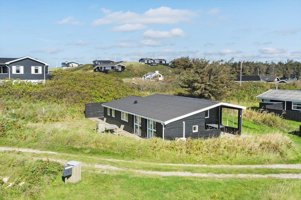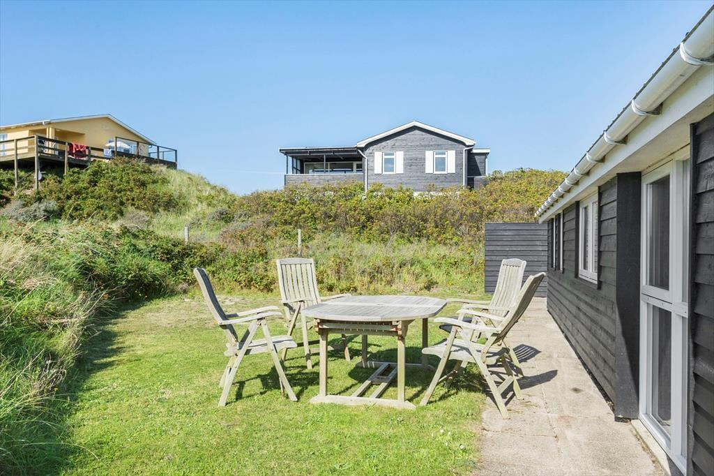 På den hyggelige naturgrund er der flere dejlige opholdspladser at vælge imellem, så der er god chance for at finde en solstråle at drikke kaffe eller spise frokost i. Når aftenen nærmer sig, er det måske græsplænen på vestsiden af huset, der skal danne rammen om familiehyggen – og der er også mulighed for at sidde under overdækningen på den sydvendte terrasse, hvor I kan finde både læ og ly for duggen. Grunden ligger lavt i det kuperede landskab, og takket være hybenbuskene og en skærmende vold ud mod vejen føles det nærmest som at bo i en gryde i klitterne.