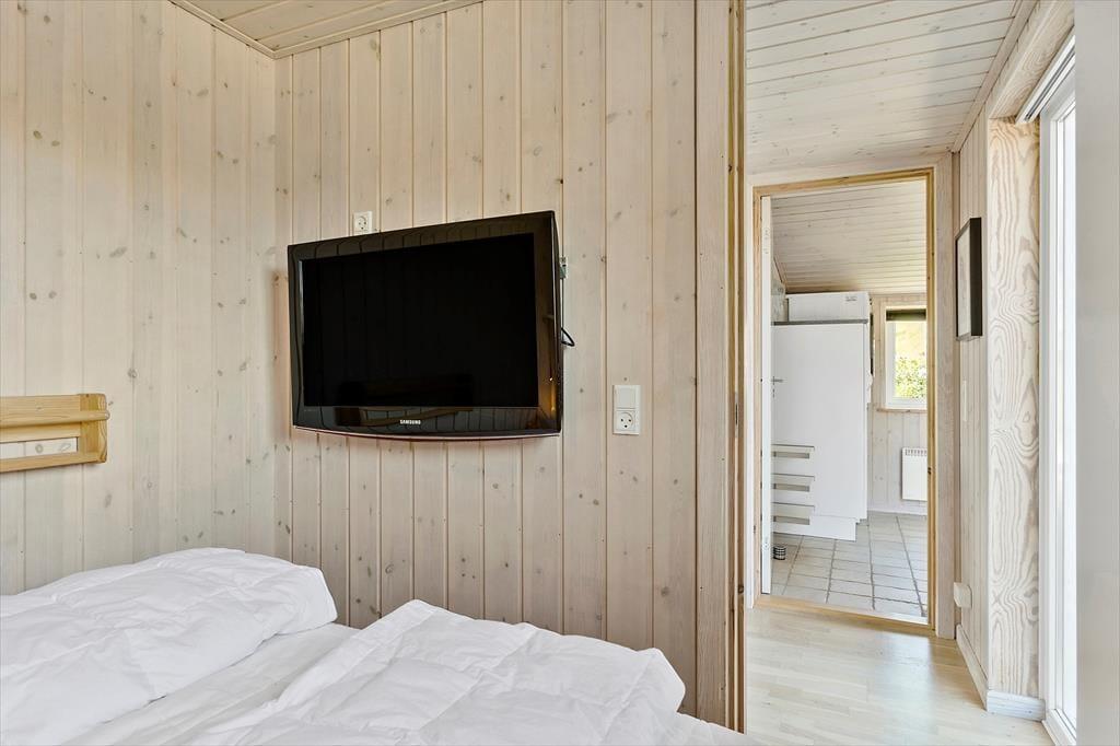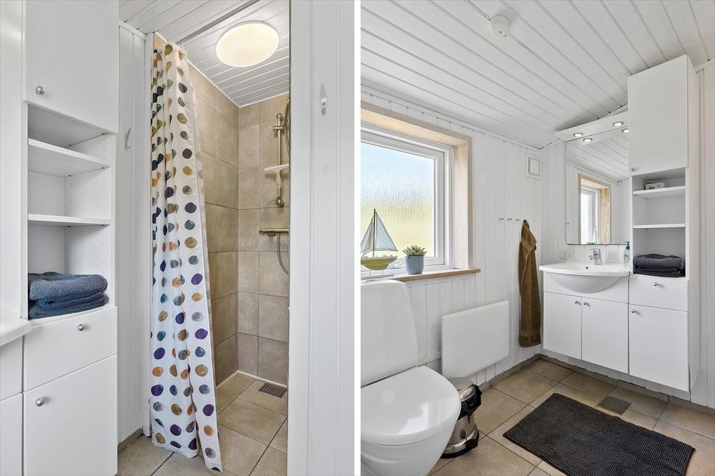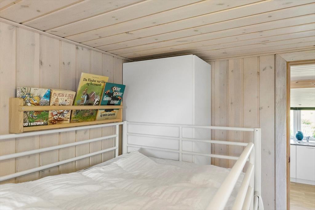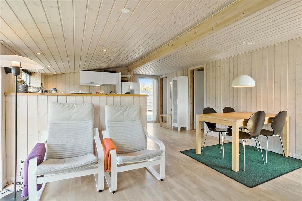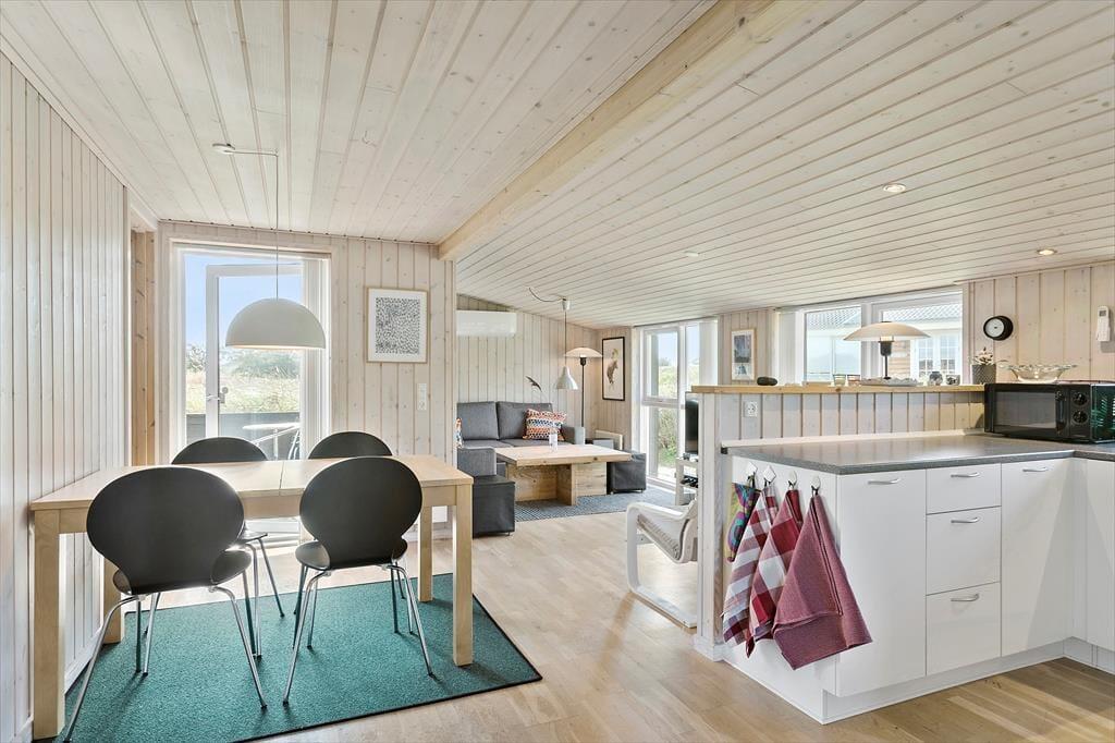 Sommerhusets rum har et lyst og indbydende indtryk – det gælder både de tre soveværelser, badeværelset og entréen, men især opholdsrummet, hvor stuen og køkkenet er forenet. En halvmur skærmer køkkenet af, så alt efter humøret kan du stå og hygge dig med madlavningen i dine egne tanker eller hyggesnakke med resten af selskabet. Spisebordet er et oplagt samlingspunkt, hvis ikke det er sofaen, der inviterer til en tilbagelænet stund med en spændende film og en stak magasiner at bladre i. Og hvis solskinnet ser alt for tillokkende ud, kan du i stedet åbne terrassedøren og flytte driverlivet ud i det fri.