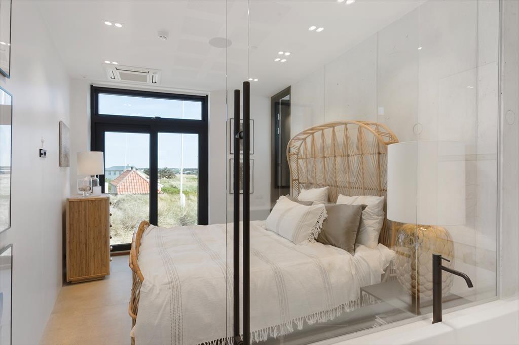 Sommerhuset er bygget ind i klitterne, og med sin stilrene facade i hvid beton spiller det smukt sammen med omgivelserne. Bemærk også, hvordan havet og marehalmen spejles i panoramavinduerne – det er blot én af detaljerne, der viser, at der virkelig er tænkt over at forene arkitekturen med naturen. Inden døre får du selvfølgelig også rig mulighed for at beundre landskabet, navnlig i opholdsafdelingen i husets øverste plan, hvor et kæmpe panoramavindue udgør hele den vestlige væg i opholdsafdelingen. Alt, lige fra det moderne Hanstholm køkken til det hvide sofaarrangement og den smukke spiseplads demonstrerer husets høje kvalitet, og samme niveau gør sig naturligvis også gældende i de øvrige rum. Fordelt på de to etager finder du blandt andet tre soveværelser og to badeværelser, hvoraf det ene er med lækkert badekar. Overalt er der gulvvarme og et behageligt indeklima, så huset fungerer som en skøn feriebolig både sommer og vinter.