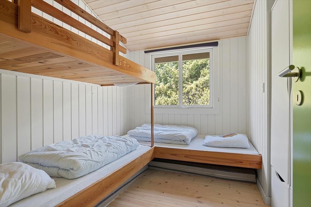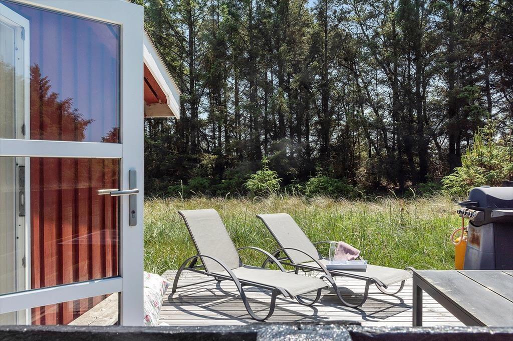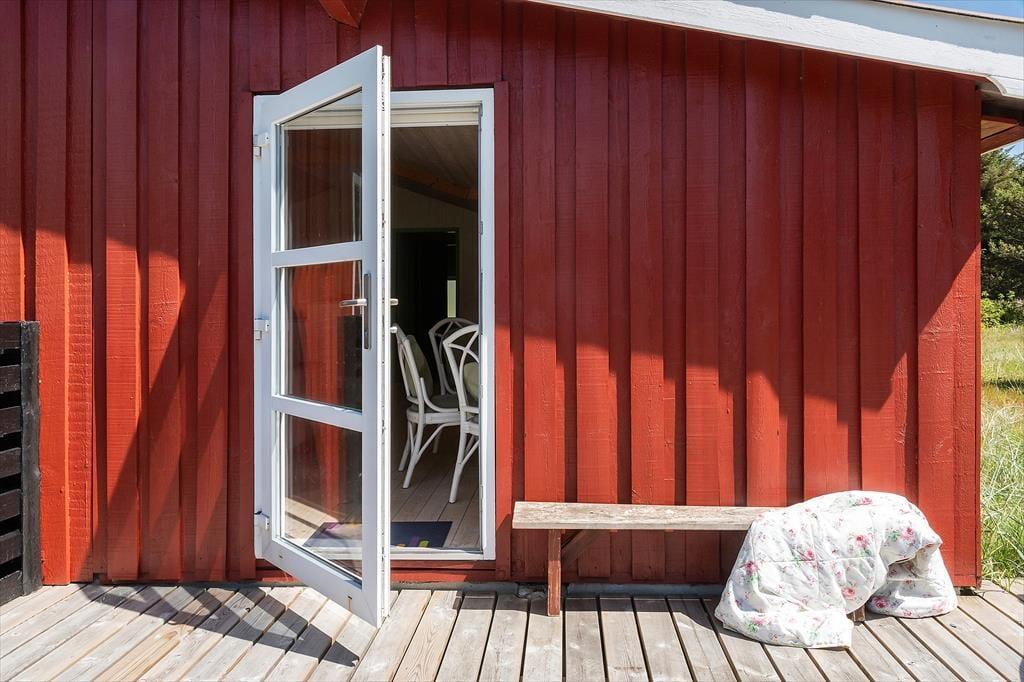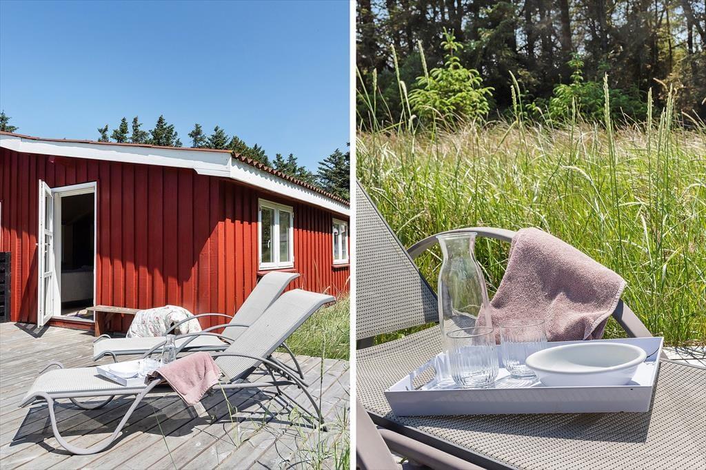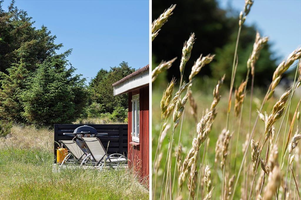 En dejlig træterrasse ligger i forlængelse af stuen, og den er udstyret med et hegn mod nord og vest, som skærmer af ud mod den lille vej og giver læ, hvis der kommer en brise fra havet. Har du børn med på ferie, vil de sikkert elske, at der er en trampolin på grunden – og de voksne vil sikkert også blive glade, for takket være den skulle der gerne være tid til at tage en ekstra kop kaffe i solen, mens ungerne brænder energi af. Naturgrunden er stor, så her er der god plads til at lege, også med hunden, hvis du har medbragt sådan én. Og hele familien, inklusiv de firbenede medlemmer, vil sikkert nyde freden og roen her i bunden af den lukkede vej.