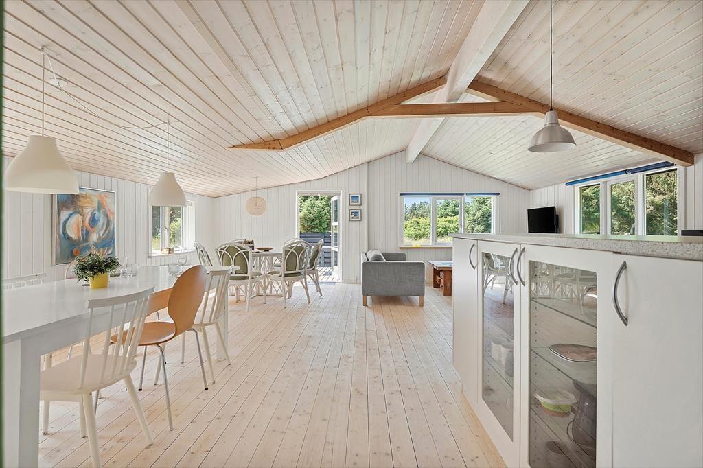 Efter den seneste renovering fremstår sommerhusets rum lyse og pæne – så du befinder dig i dejlige rammer, lige fra du slår øjnene op om morgenen på et af de to soveværelser. Brusebadet kan foregå på det rummelige badeværelse, og bagefter kan du gå i gang i det åbne køkken med at brygge kaffe eller måske ligefrem diske op med en fyldig brunch. Skal dagen ikke bruges ude i Løkken og omegn, men hjemme i huset, kan du tænde op i brændeovnen og tage strikketøjet og dine medbragte magasiner frem, og hvis fladskærms-tv’et skal sørge for underholdningen, kan du læne dig tilbage i sofaen og finde noget godt at streame.