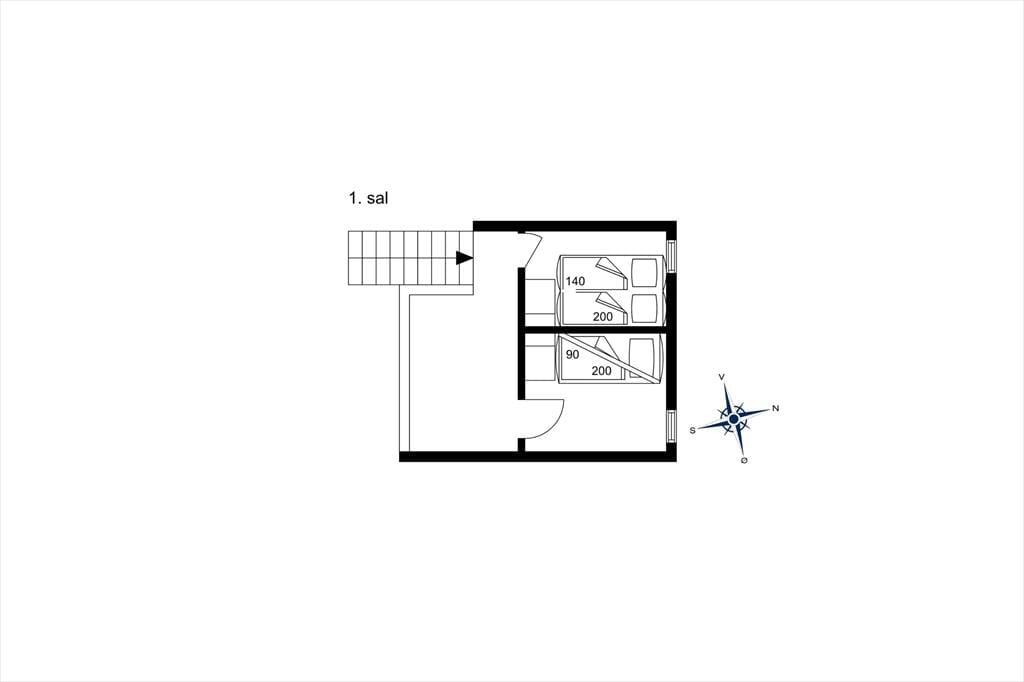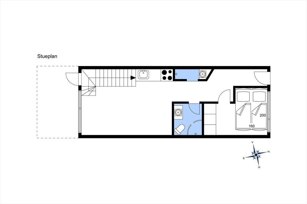 Når du bor så tæt på både bymidten og stranden i Løkken, kan badeture, shopping, galleribesøg og surfing sikkert hurtigt komme til at fylde en god del af tiden – men det er nu også fristende bare at tage det med ro derhjemme i sommerhuset. Planløsningen breder sig over to plan, og to af soveværelserne ligger på første sal, mens det tredje er placeret i stueplan lige ved entréen. Badeværelset er opdelt, så der er separat bad og toilet, og et lille, men funktionelt køkken er integreret med stuen, så det er nemt at smutte hen for at brygge mere kaffe eller starte på at forberede aftensmaden. Både spisebordet og sofaafdelingen er hyggelige steder at samles, og hvis du trænger til en rolig stund, kan du slå dig ned med en god bog i en lænestol på førstesalens repos.
