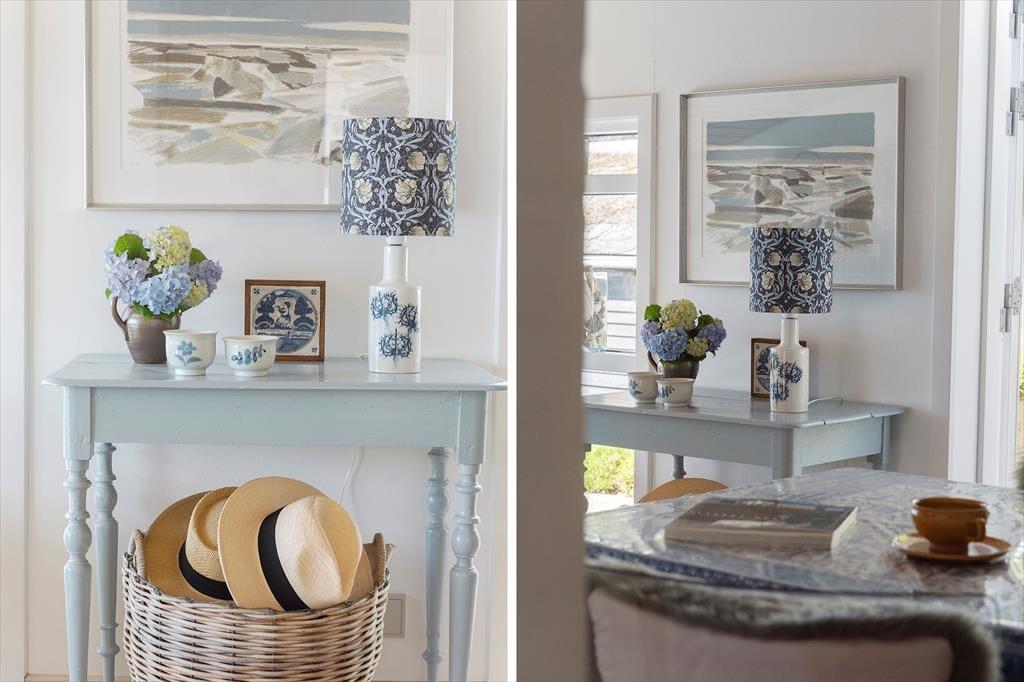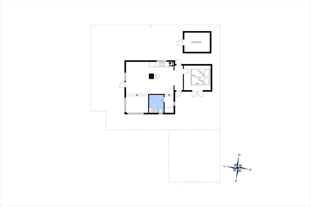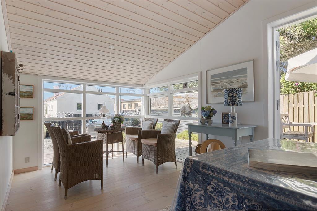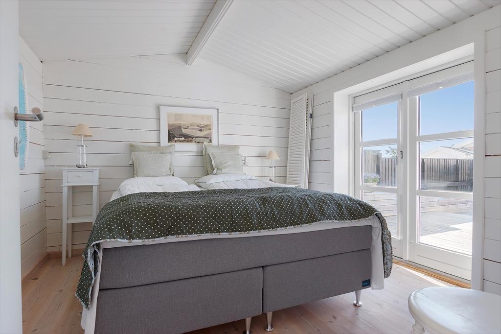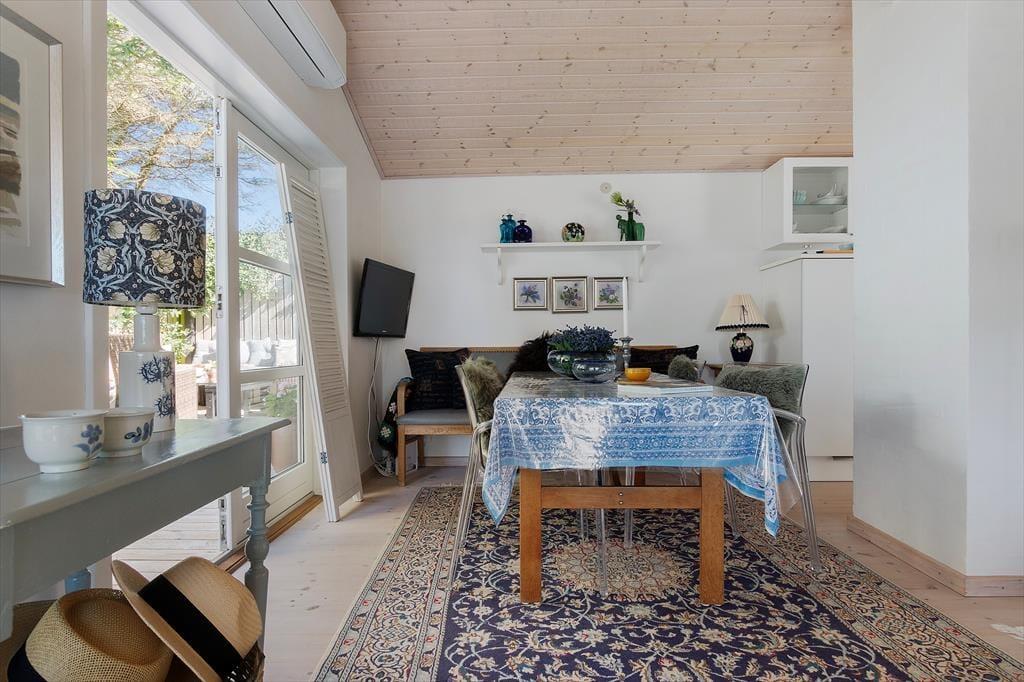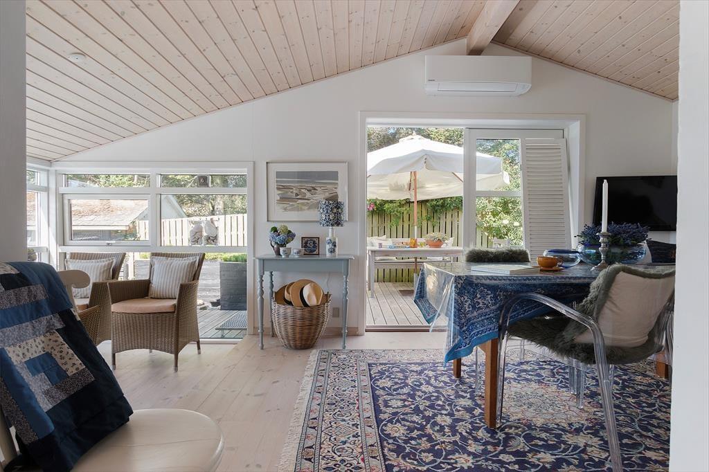 Når du træder ind i dette flot indrettede sommerhus, mødes du af et lyst og åbent rum med store vinduespartier, der lukker dagslyset ind og skaber en indbydende atmosfære. Sommerhuset rummer et hyggeligt soveværelse og en stue med en varmende brændeovn, der indbyder til afslappende aftener med en god bog eller en hyggelig film. Køkkenet er veludstyret og åbent, så du kan nyde samværet med familien, selv når du står og laver mad. De store vinduer giver en smuk udsigt til haven og de grønne omgivelser, mens den udendørs vandhane er praktisk til at skylle sandet af efter en tur på stranden.