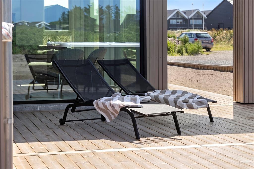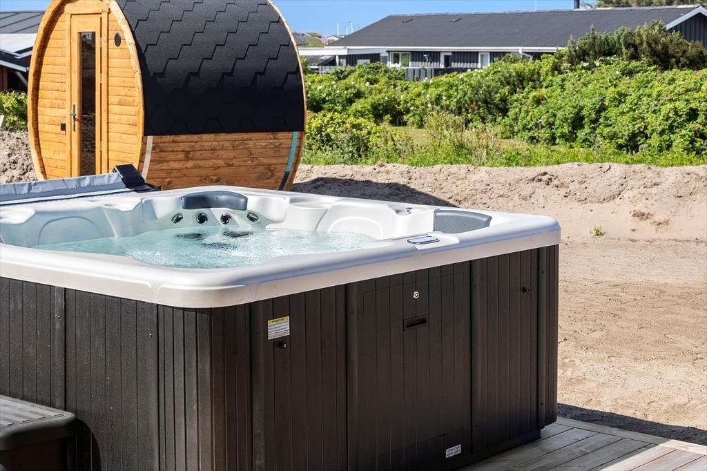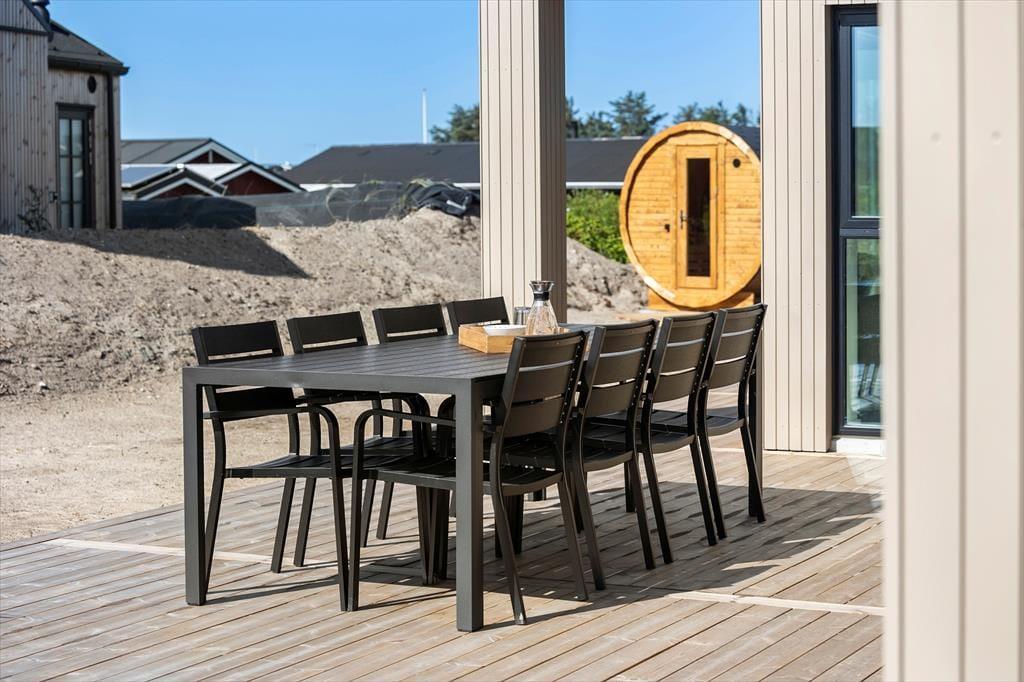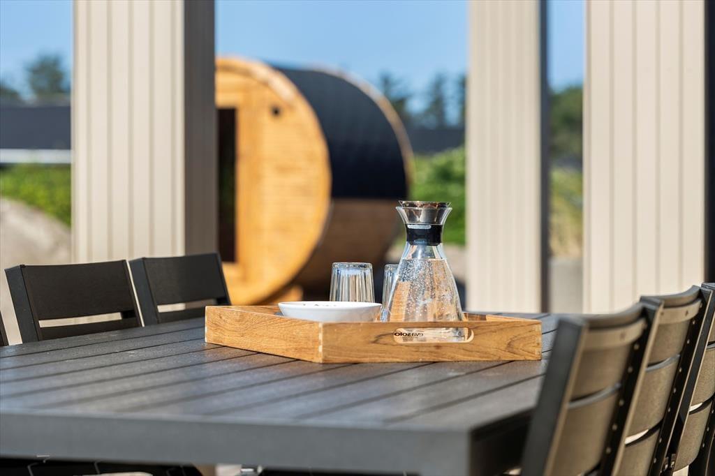 Den store terrasse er en af husets absolutte højdepunkter, hvor du kan nyde solen hele dagen. Uanset om du slapper af på den overdækkede del af terrassen eller søger solen på den åbne del, er det den perfekte base til at nyde de varme sommeraftener. Børnene kan lege på græsplænen, mens du tilbereder lækre måltider på grillen, og når mørket falder på, er der intet bedre end at samles om et glas vin under stjernerne, hvor det udendørs spabad også kan benyttes. Med terrassen tæt på huset er det let at få den bedste udsigt og samtidig være tæt på den indbydende bolig.