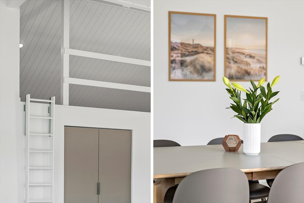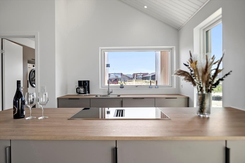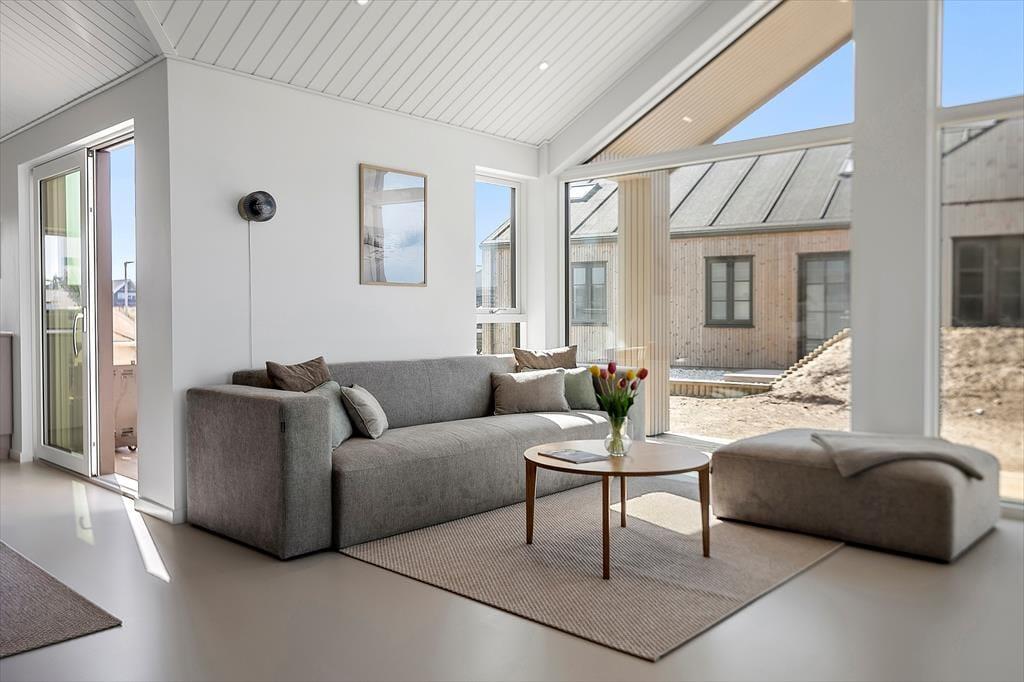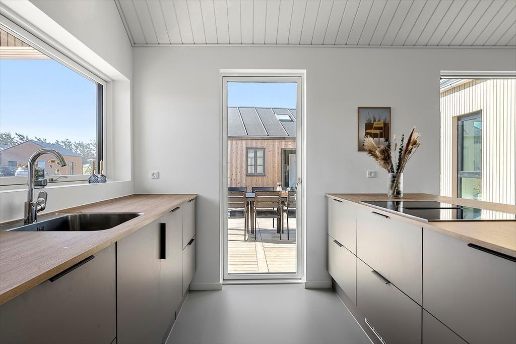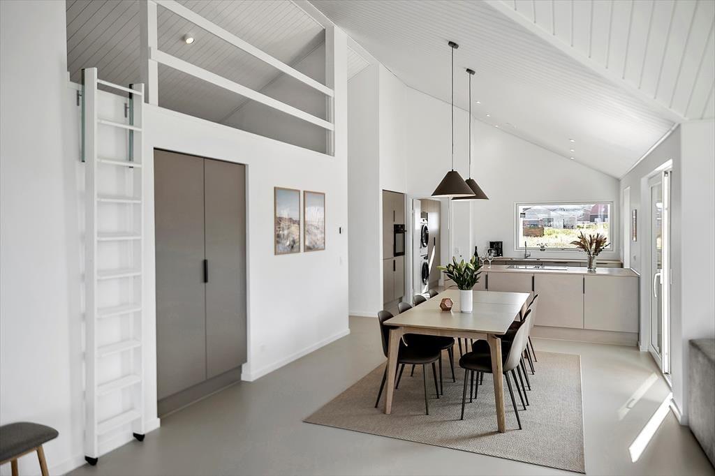 Når du træder ind i Kallehave Strand 2, mødes du af et lyst og indbydende interiør. Hele huset er bygget i høj kvalitet, og de store vinduespartier gør, at lyset strømmer ind i de åbne rum. Køkkenet er integreret med stuen, hvilket gør det muligt at være social og samtidig fordybe sig i madlavningen. Fra stuen kan du kigge ud over de naturskønne klitter, der ligger som et smukt bagtæppe til det moderne hjem. Med loft til kip og fire store soveværelser får du både plads og atmosfære. De to stilfulde badeværelser gør det nemt at være flere, og du får hurtigt følelsen af luksus og ro, når du træder ind i rummene.