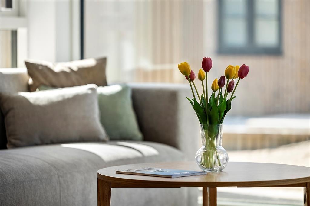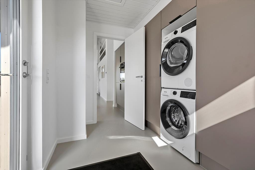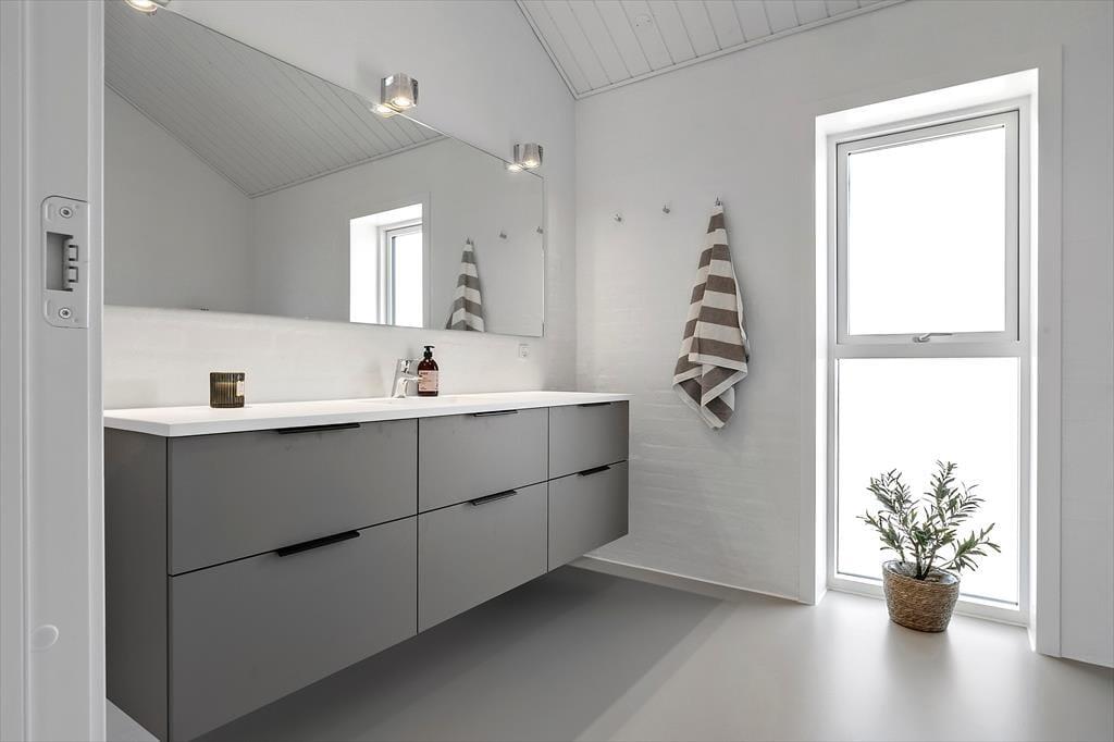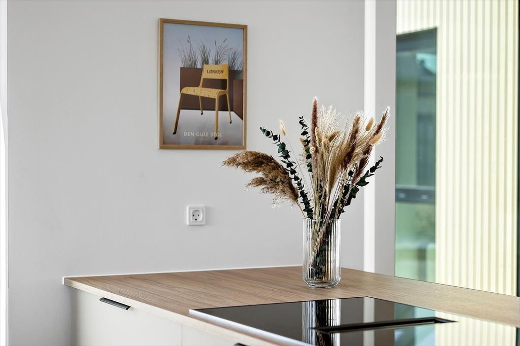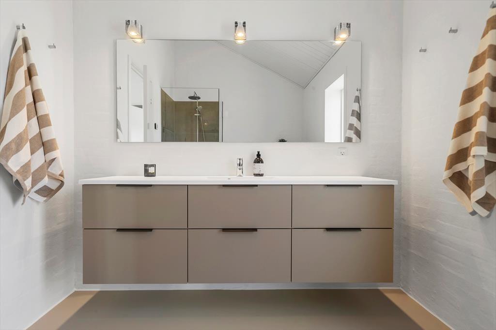 Når du træder ind i Kallehave Strand 2, mødes du af et lyst og indbydende interiør. Hele huset er bygget i høj kvalitet, og de store vinduespartier gør, at lyset strømmer ind i de åbne rum. Køkkenet er integreret med stuen, hvilket gør det muligt at være social og samtidig fordybe sig i madlavningen. Fra stuen kan du kigge ud over de naturskønne klitter, der ligger som et smukt bagtæppe til det moderne hjem. Med loft til kip og fire store soveværelser får du både plads og atmosfære. De to stilfulde badeværelser gør det nemt at være flere, og du får hurtigt følelsen af luksus og ro, når du træder ind i rummene.