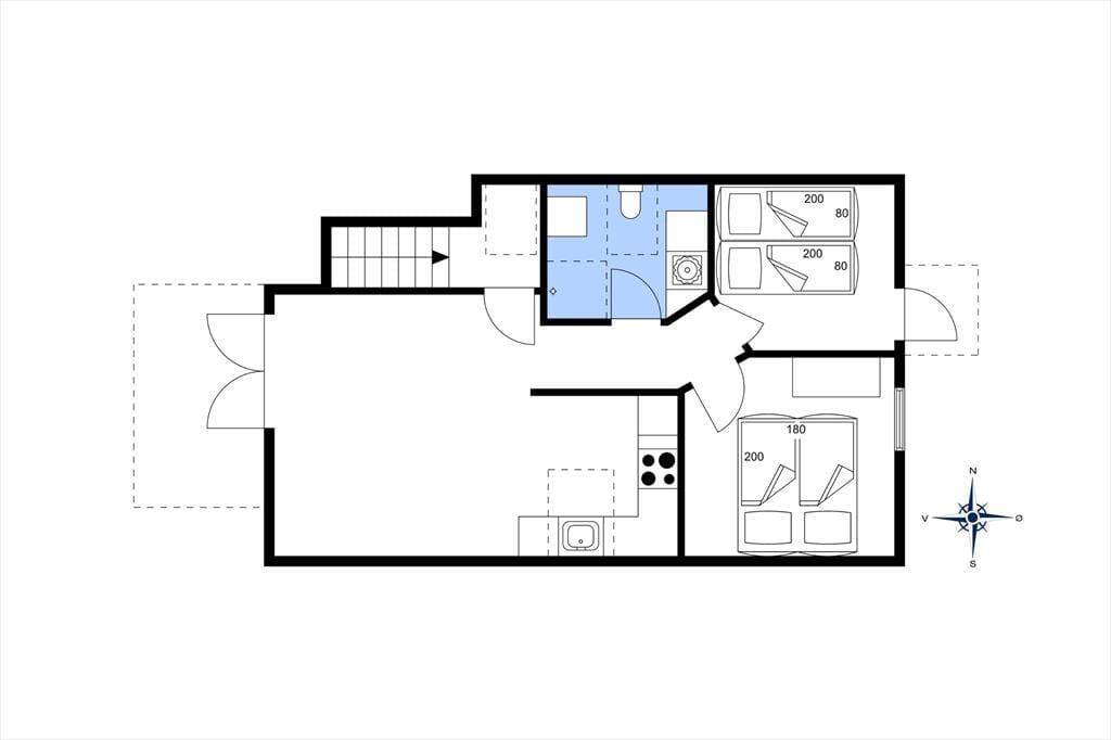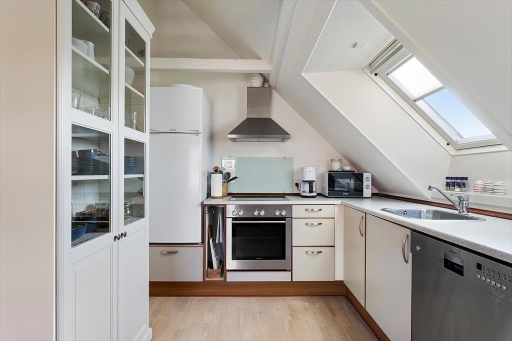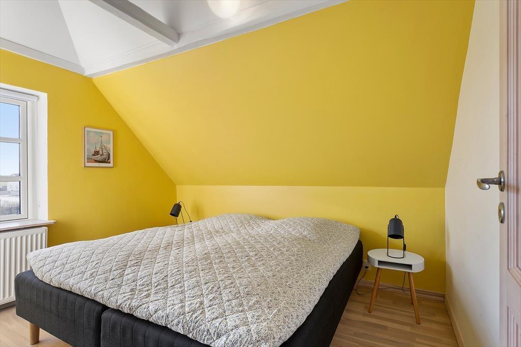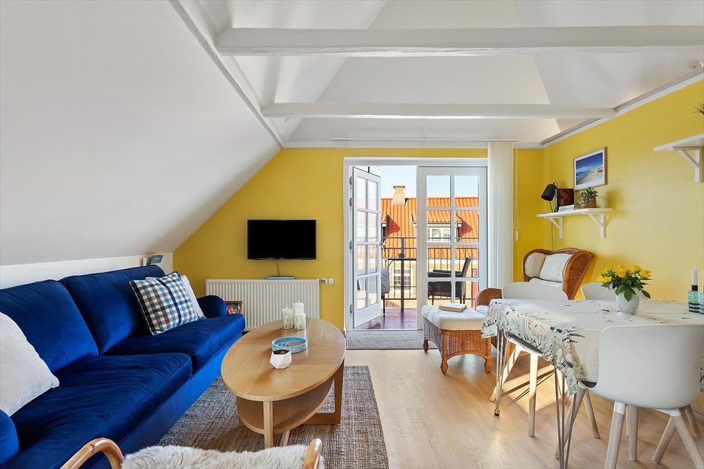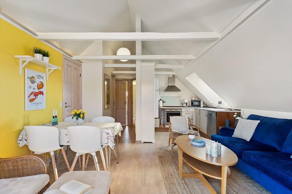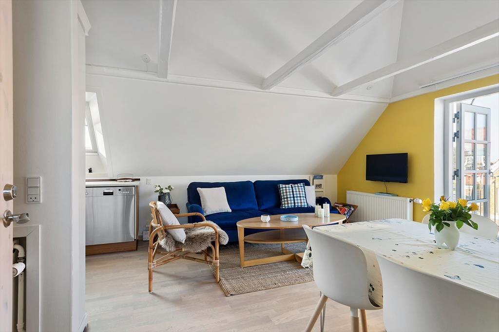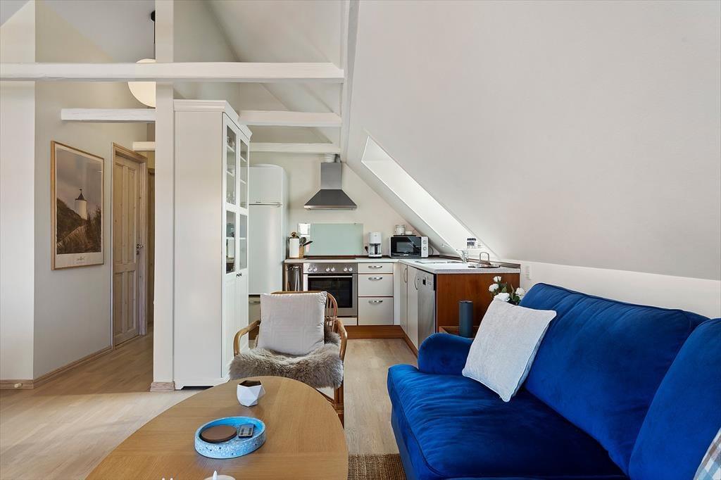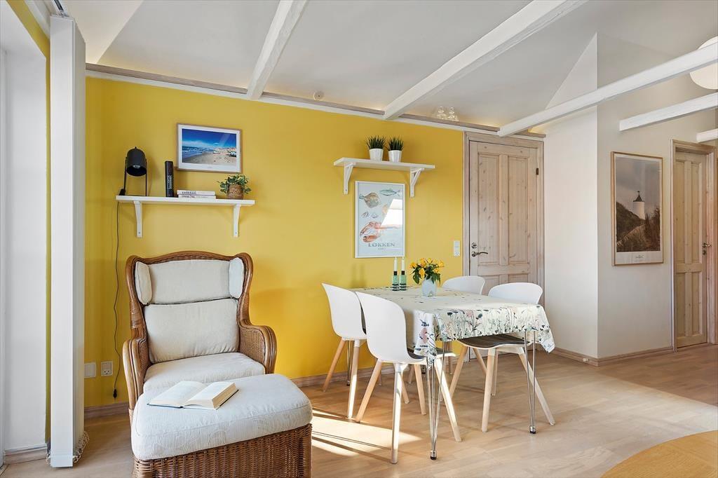Indenfor fortsætter den indbydende atmosfære, hvor lyse flader og en enkel, harmonisk indretning giver plads til ro og nærvær. Lejligheden ligger på 1. sal, men indgangen sker fra stueetagen, hvilket giver en let og bekvem adgang. De delvise moderniseringer fra 2025 mærkes tydeligt og skaber en behagelig balance mellem det klassiske og det nutidige. Her er rammerne ideelle til at starte dagen stille og roligt med morgenkaffen eller samle sig efter en oplevelsesrig dag ved Vesterhavet. Lyset strømmer ind og giver rummene en lethed, der indbyder til afslapning, uanset om ferien står på lange, morgener eller hyggelige aftener med kortspil, samtaler og feriestemning. Lejligheden føles som et trygt og behageligt helle midt i Løkkens levende ferieby.