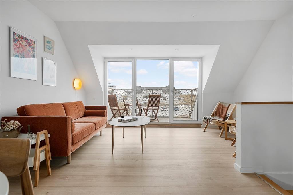 Lejligheden fremstår lys, moderne og indbydende efter en gennemført renovering, hvor der er lagt vægt på både æstetik og funktionalitet. Allerede når du træder indenfor, mærker du det dejlige lysindfald, som strømmer ind gennem vinduerne og skaber en let og afslappet stemning. På førstesalen ligger det nye køkken i åben forbindelse med stuen, hvilket giver et skønt, sammenhængende opholdsrum, hvor feriens måltider og hyggestunder naturligt samles. Her kan du stå og tilberede lækre retter med lokale råvarer, mens samtalen flyder frit i stuen. Lejligheden rummer desuden to gode værelser, der indbyder til ro og afslapning efter en dag fyldt med oplevelser, samt et rummeligt badeværelse med god plads til både morgenrutiner og aftenafslapning. De lyse materialer og den stilrene indretning understreger følelsen af nyhed og komfort og gør det nemt at føle sig hjemme fra første feriedag.