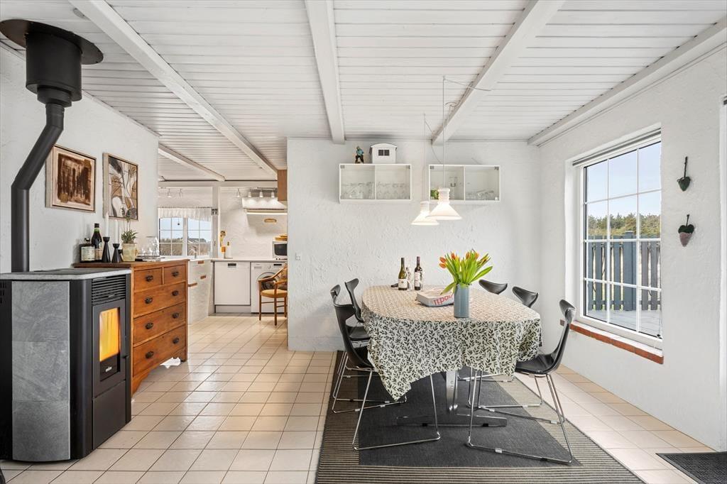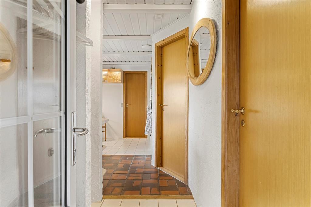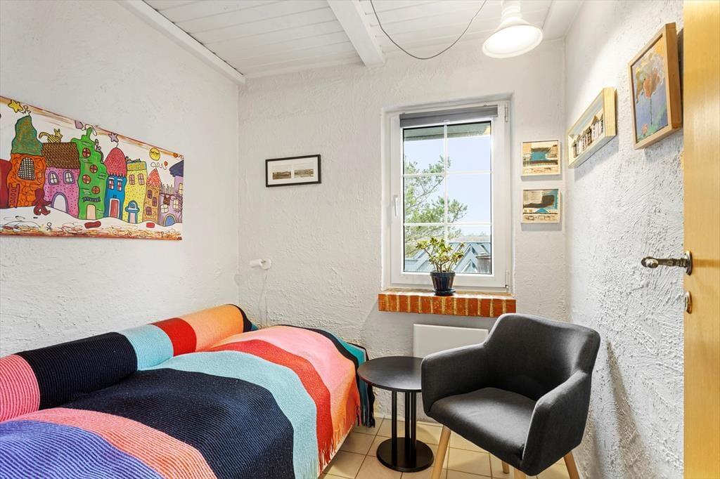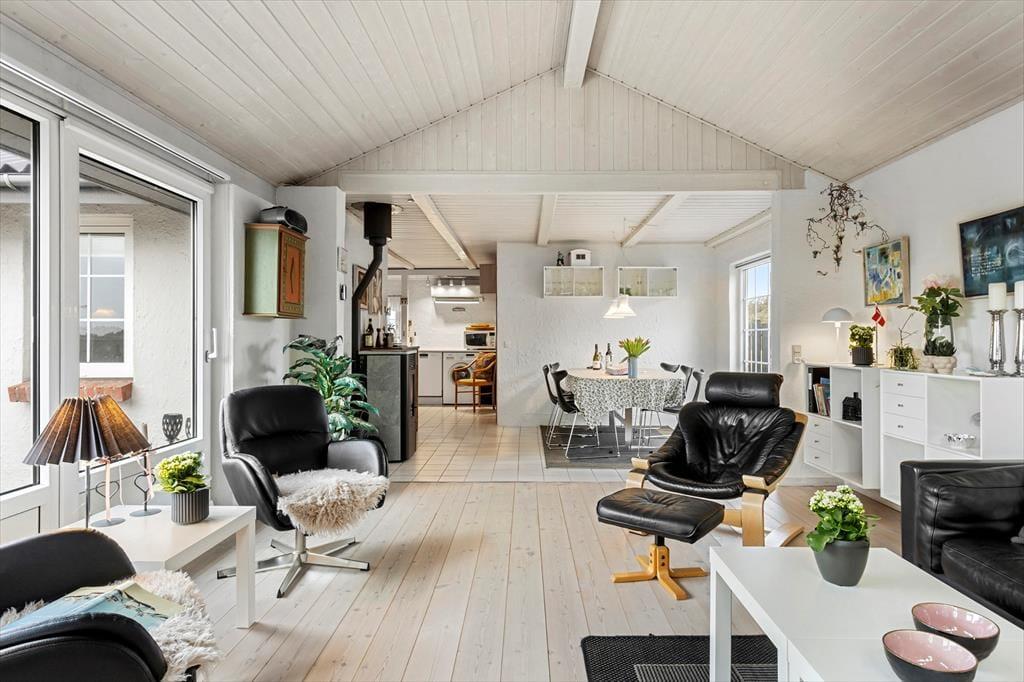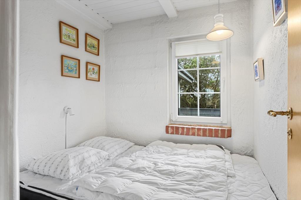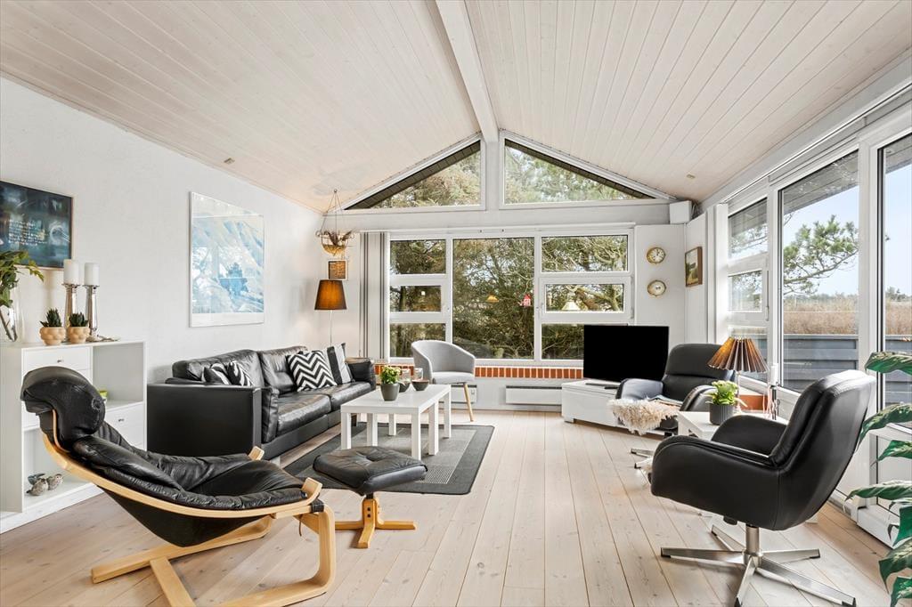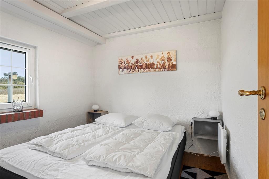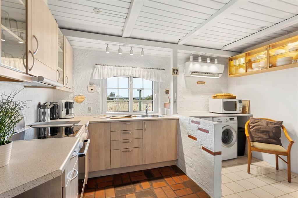 Indenfor mødes du af en lys og indbydende atmosfære, hvor de store vinduespartier giver et dejligt naturligt lysindfald dagen igennem. Køkkenet ligger i åben forbindelse med stuen, så feriens samvær kan udfolde sig på tværs af madlavning, hyggesnak og afslapning i sofaen. Her kan du dufte morgenkaffen brede sig, mens solen langsomt stiger op over klitlandskabet, og om aftenen kan I samles om et godt måltid efter en dag fuld af oplevelser. Sommerhuset rummer flere gode værelser, som giver plads til både ro og privatliv, og badeværelset byder på behagelig gulvvarme, der er ekstra skøn på kølige morgener. Hele indretningen emmer af klassisk sommerhusstemning kombineret med moderne komfort – et sted, hvor man hurtigt føler sig hjemme.