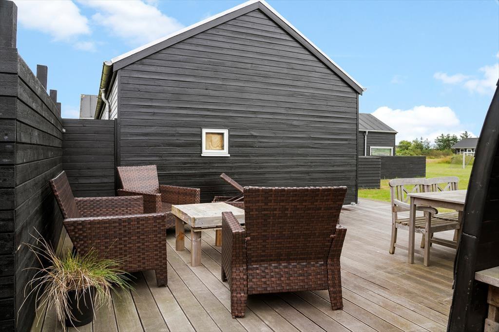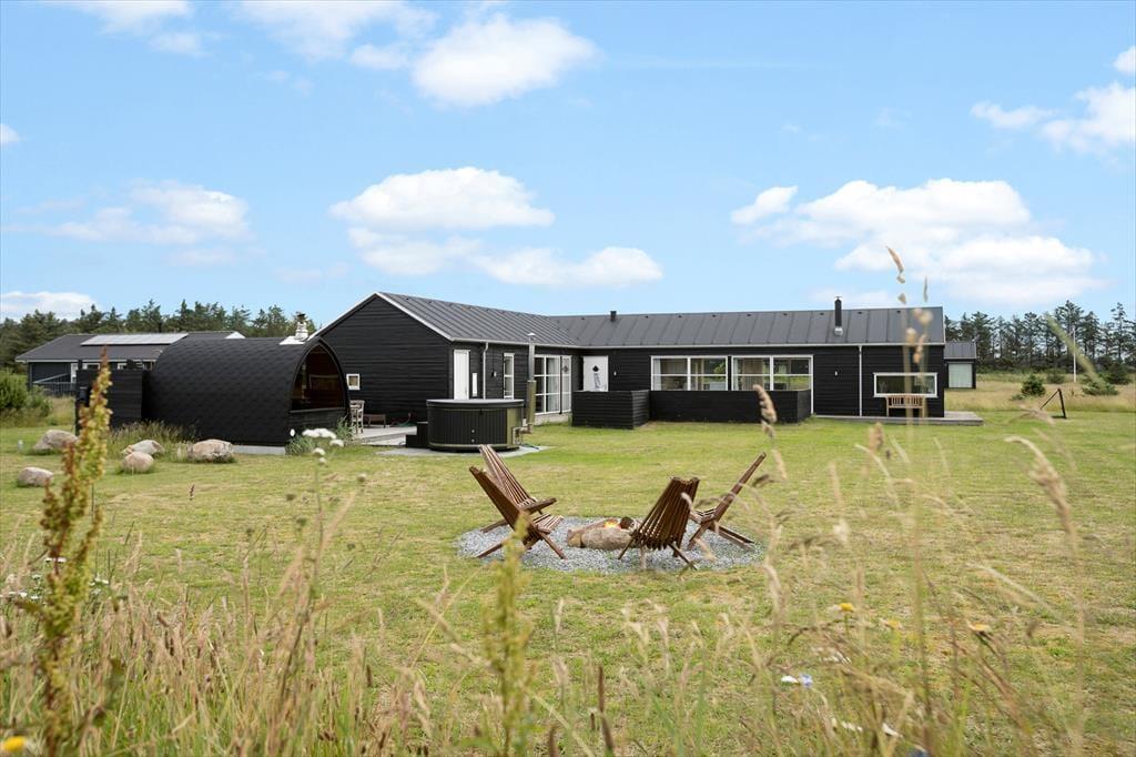 Inden døre har I hele 141 m2 at brede jer på, og med fire soveværelser og to badeværelser er planløsningen perfekt afstemt til otte personer. Trænger I til en rolig eftermiddag, er stuens sofaafdeling et skønt sted at sætte sig med sin bog eller tablet – eventuelt med ild i brændeovnen, hvis vejret er til det. Vil I spille brætspil, kan I samles omkring spisebordet, der står mellem stuens store vinduespartier og lige ved det åbne køkken. Er humøret mere til en film, kan det lade sig gøre både i stuen og i aktivitetsrummet, for begge rum er udstyret med et stort fjernsyn. På det største af husets badeværelser finder I et spabad, så wellness kan også indgå i afslapningsstunderne. Skal der være mere gang i den, er det skønt at have aktivitetsrummet, hvor I kan dyste i bordtennis og bordfodbold.