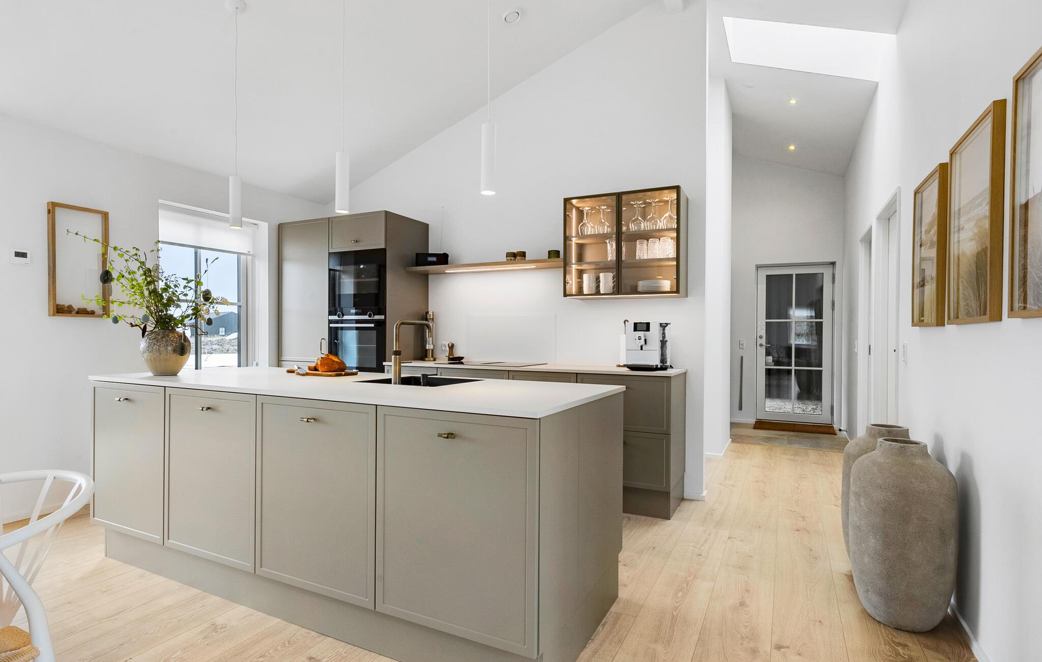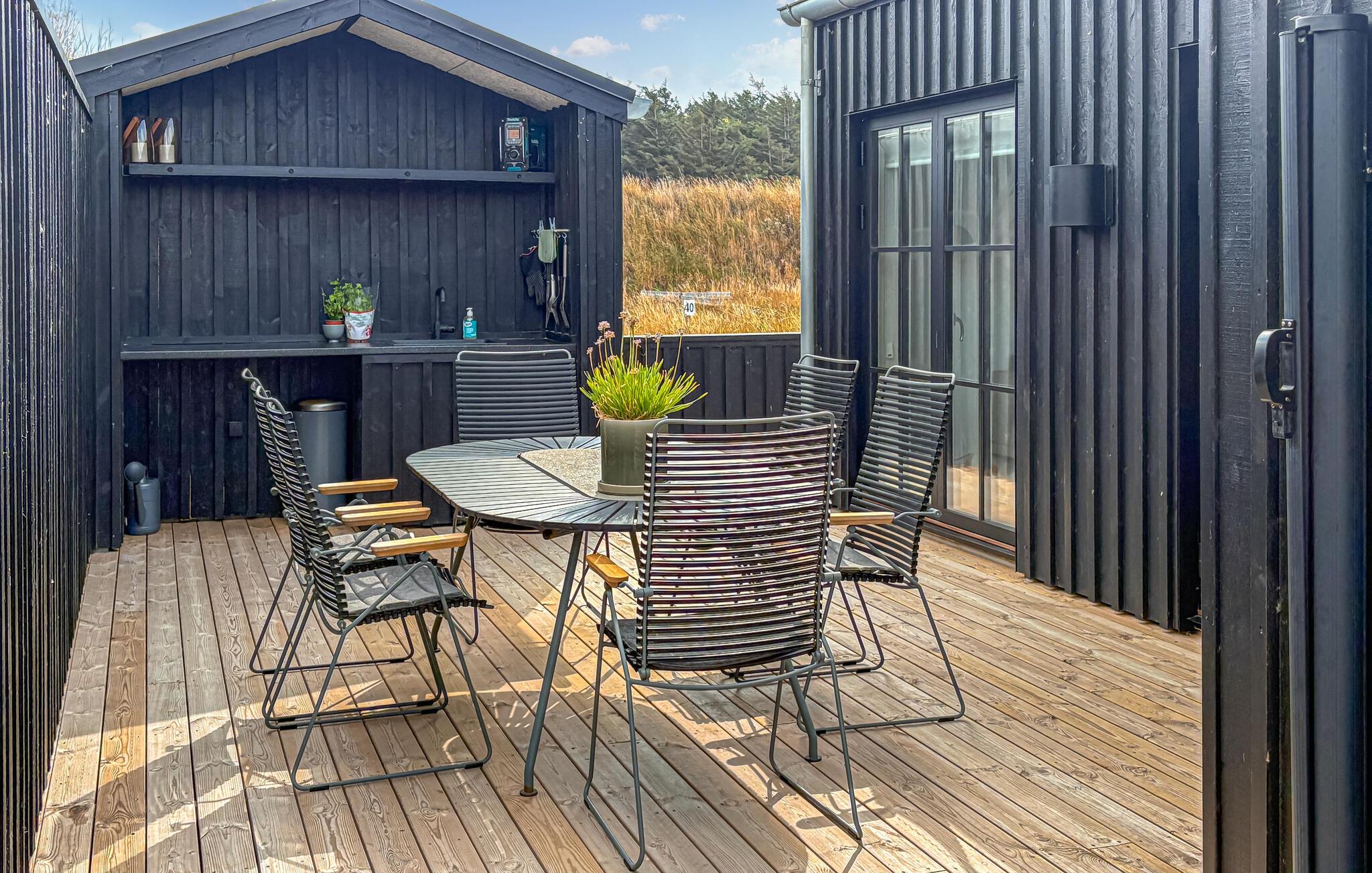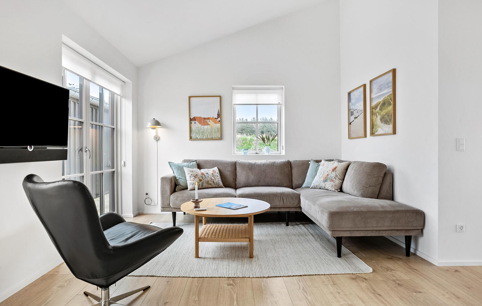 Dette moderne feriehus ligger i et roligt kvarter, kun få minutters gang fra Løkkens bymidte og den populære sandstrand. Her er der gode rammer til en børnefamilie eller to par og giver jer en skøn base i smukke omgivelser. Træd ind i den rummelige opholds- og spisestue, som får masser af lys ind gennem de store vinduespartier. Læn jer tilbage i den behagelige sofa eller planlæg feriedagen over en sen morgenmad ved spisebordet. Det åbne køkken med kogeø har lækre kvalitetsløsninger og masser af plads til at lave mad sammen. En fin detalje er den integrerede hems i stuen, som er et hyggeligt tilflugtssted for børn og voksne.