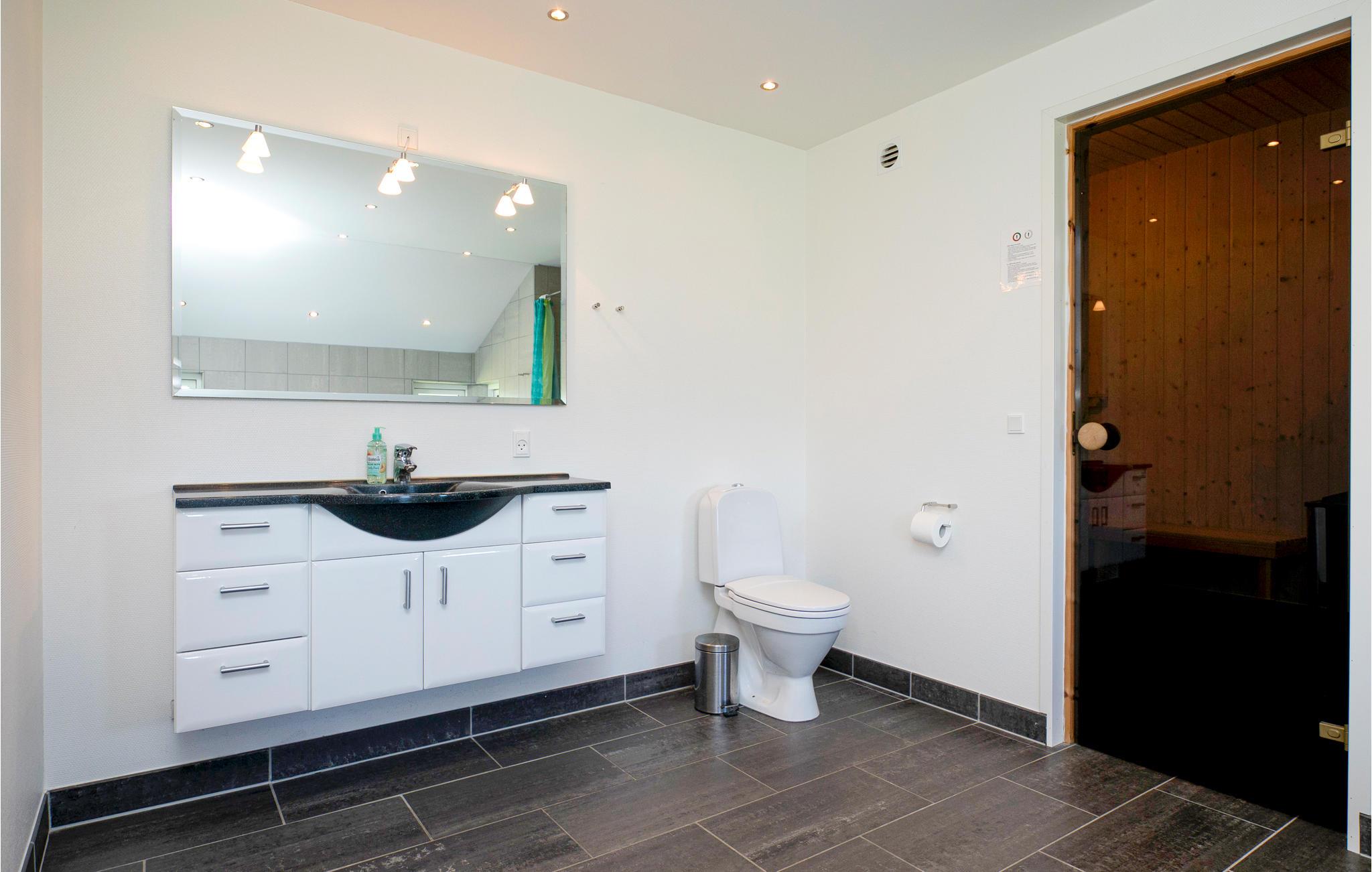 Det er et utrolig flot hus med dejlige terrasser, hvor både morgen- og aftensol kan nydes. Der er et stort bryggers med vaskearrangement. Fra bryggerset går man ind i et lækkert kvalitetskøkken med alle hårde hvidevarer, og derfra er der en utrolig smagfuld og lys stue med behagelige møbler. I huset findes en separat afdeling, hvor der er et aktivitetesrum med billiard og bordtennisbord. Her ligger også to af husets værelser og det største af de i alt to badeværelser i huset.