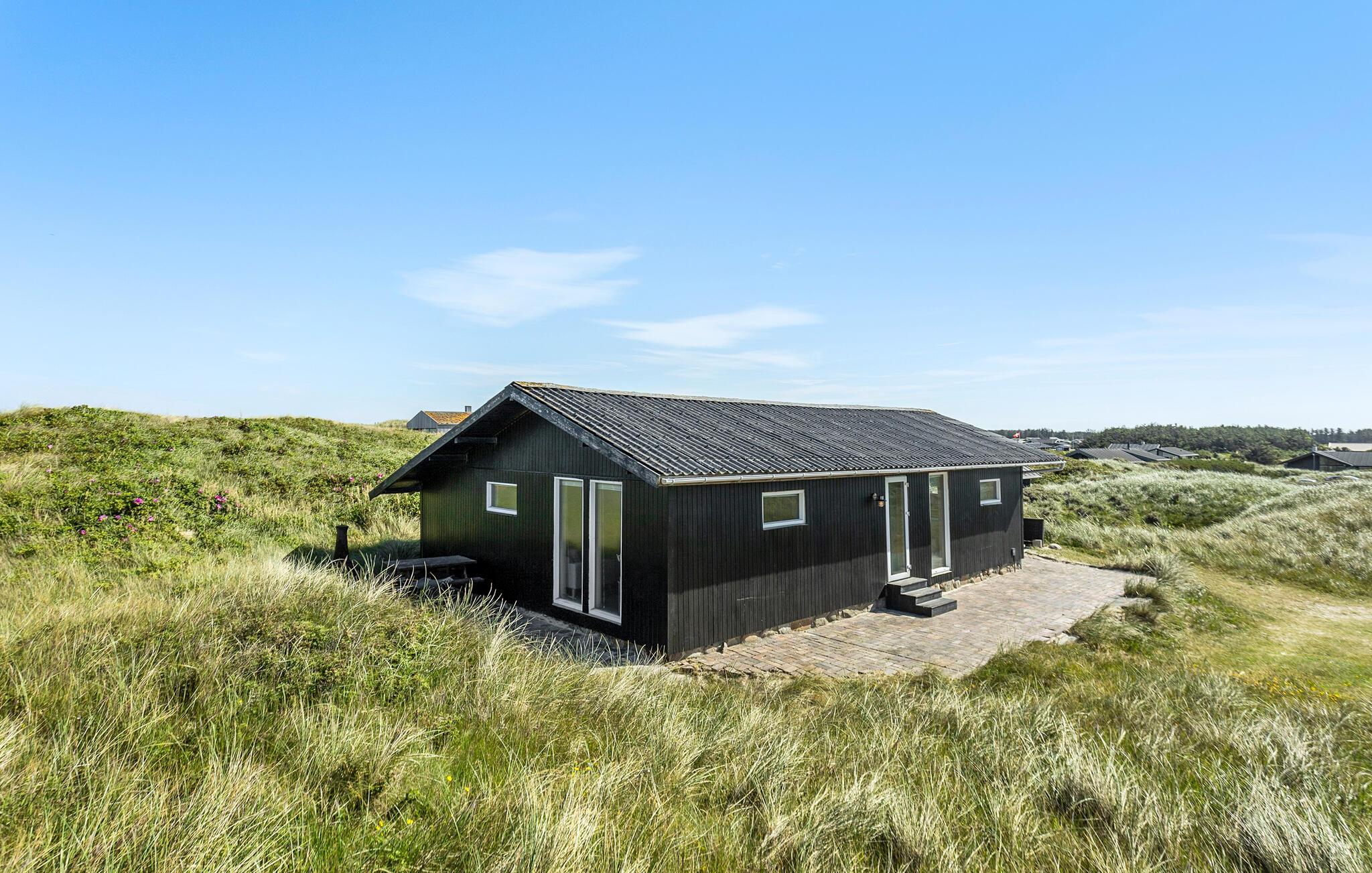 Rustikt feriehus midt i klitterne nær Vesterhavet med smuk havudsigt og moderne faciliteter.