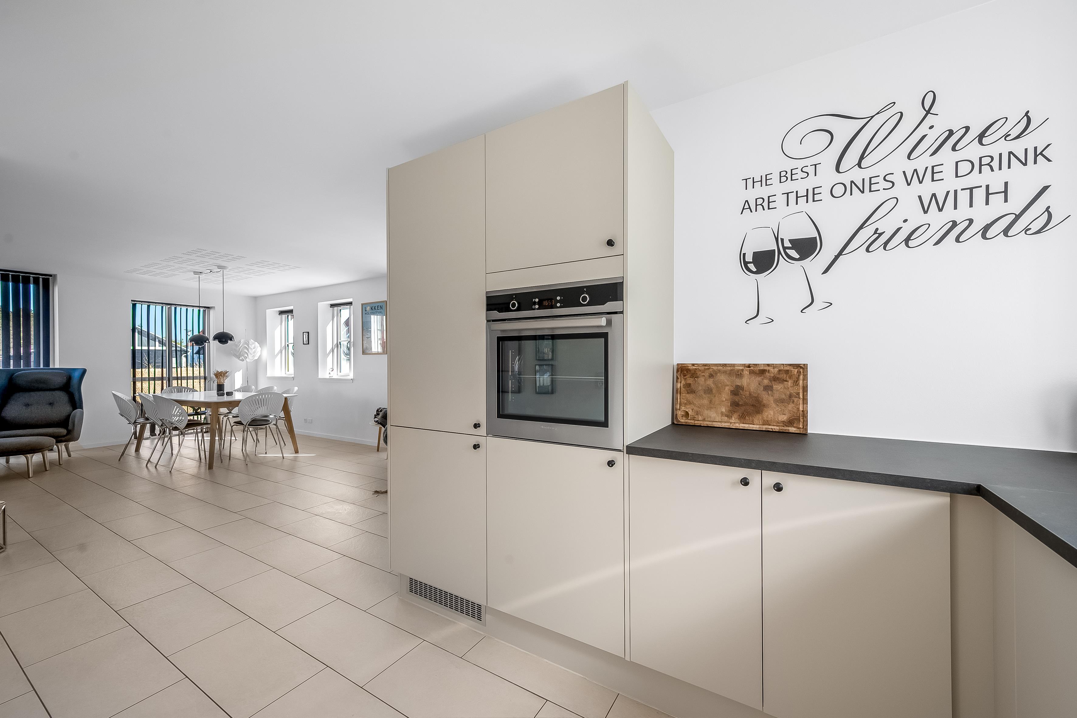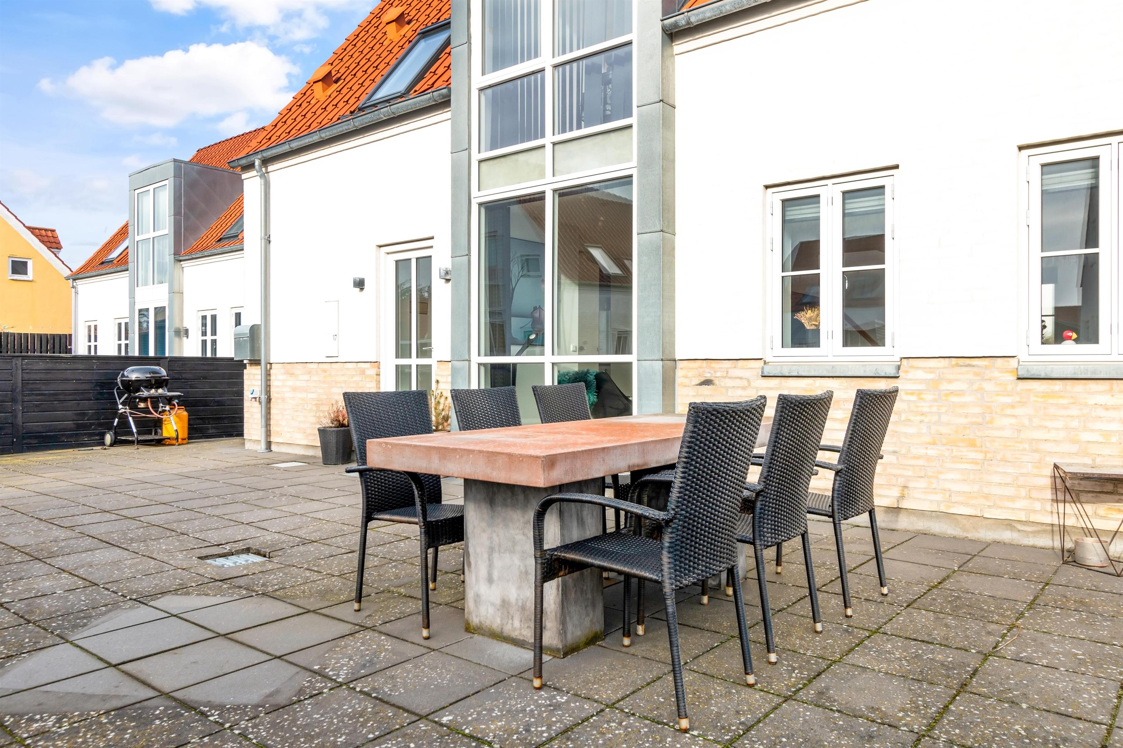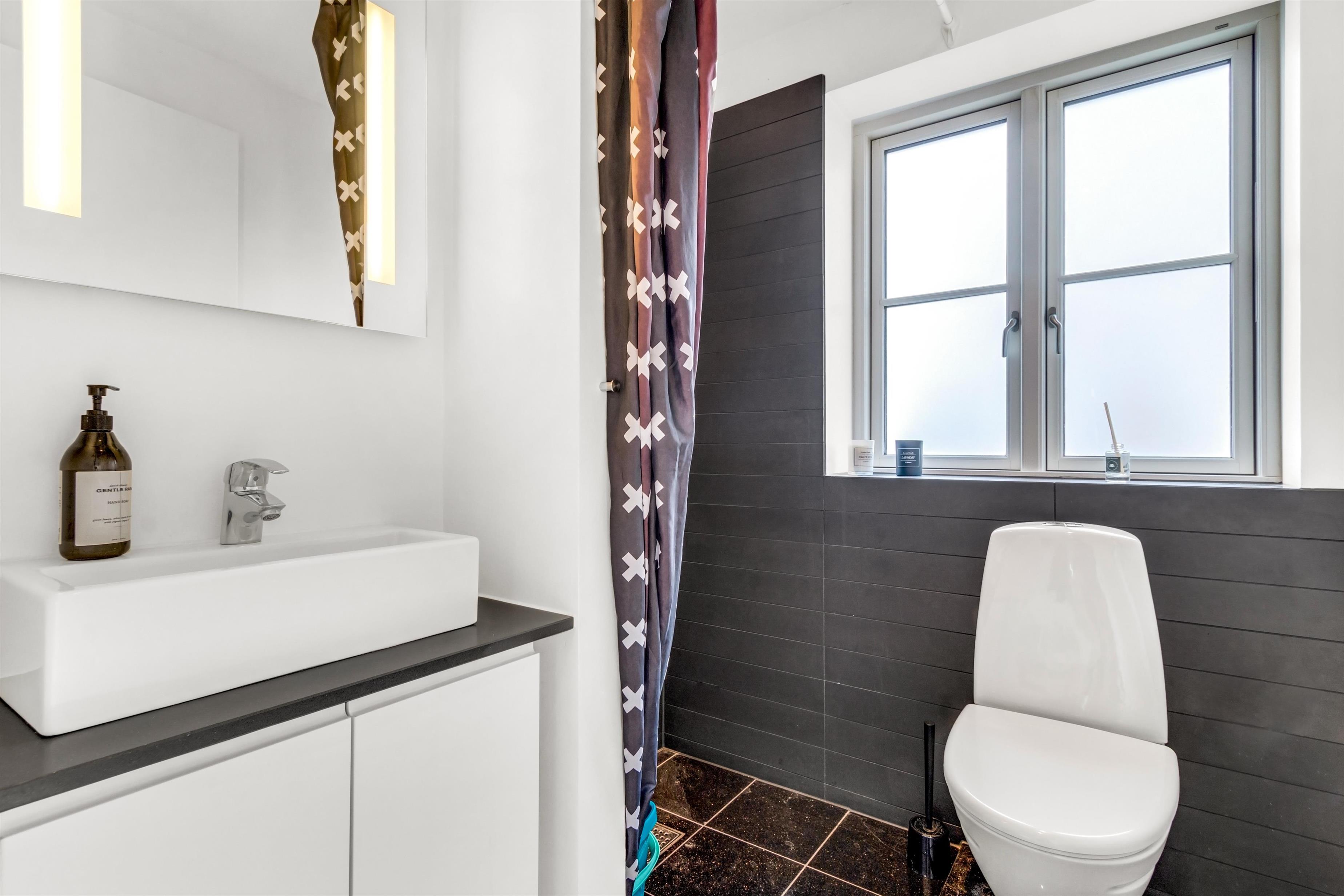 Selve huset er i to plan med tre soverum og et badeværelse på første sal. I stueetagen er der en dejlig, stor entré med badeværelse samt et super charmerende og lækkert køkken i åben forbindelse til den store, lyse stue og spisestue. Huset er stilsikkert indrettet og emmer af luksus og hygge. Hele vejen rundt om huset er der en dejlig terrasse, så det skulle altid være muligt at finde en plads i solen, når sommeren viser sig fra sin bedste side.