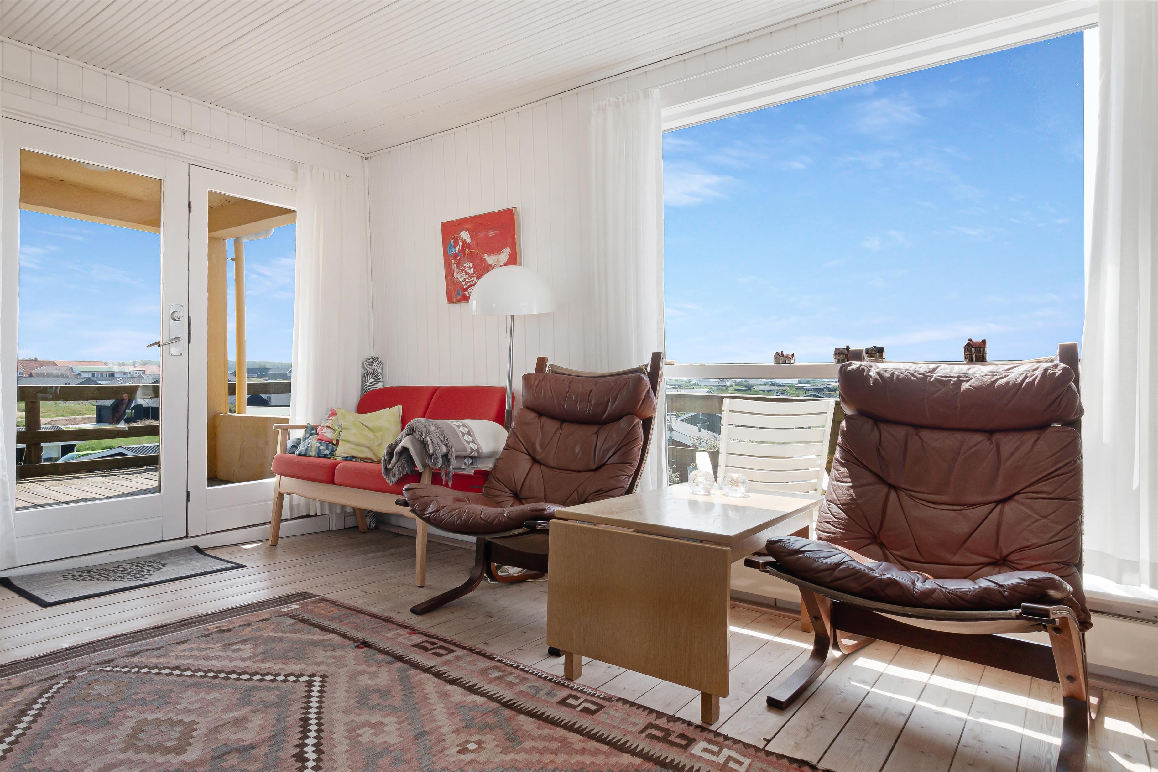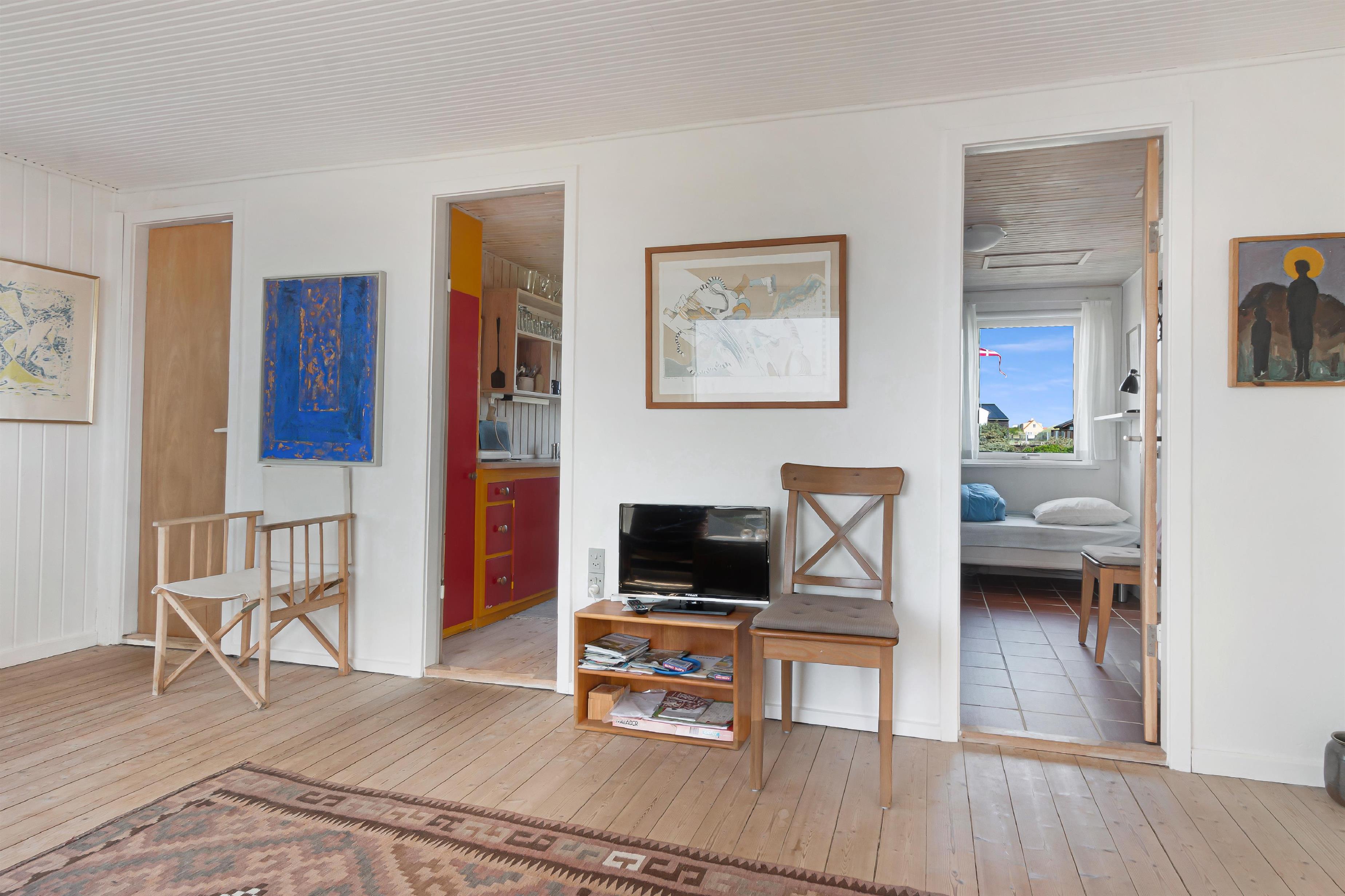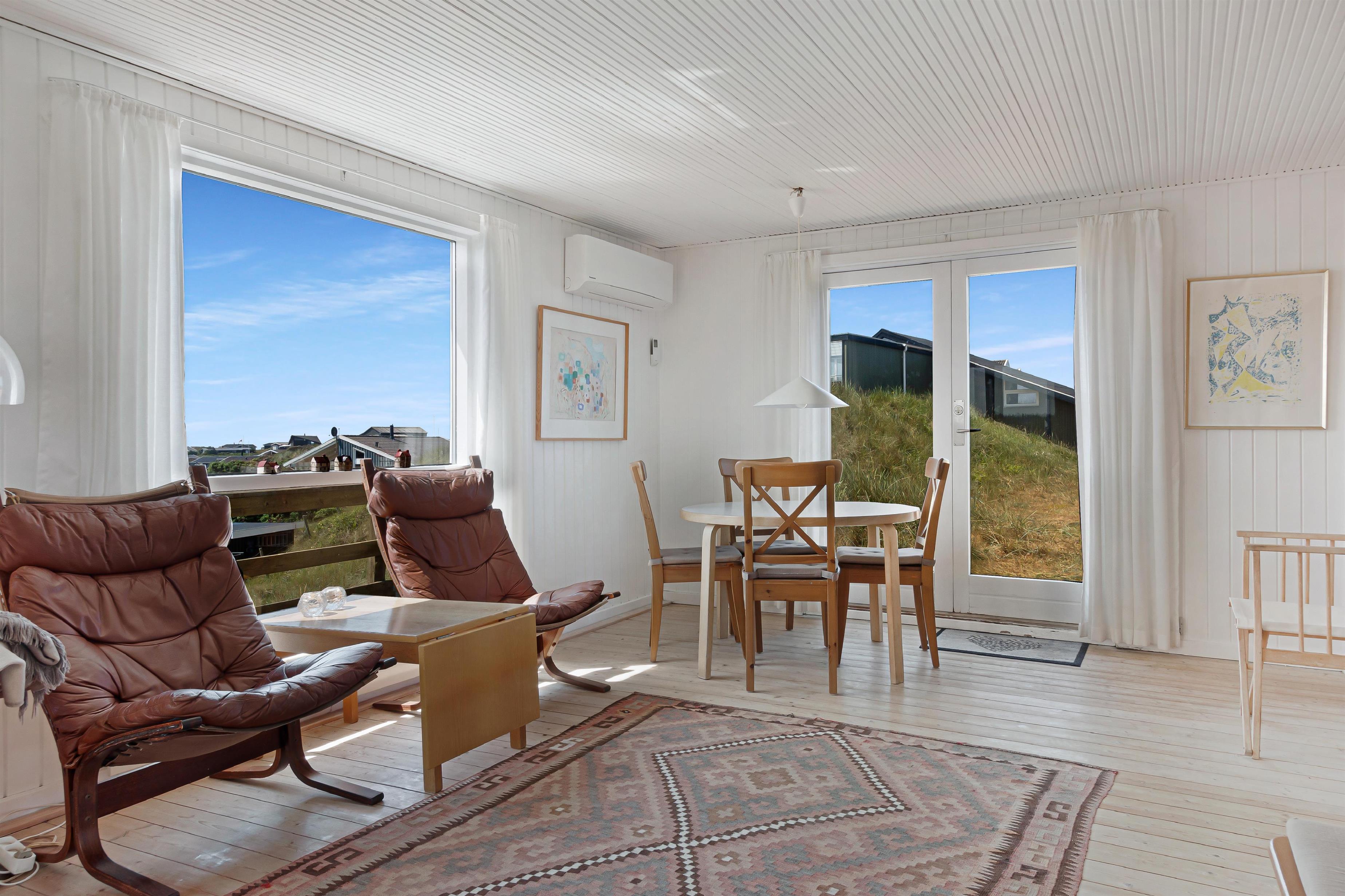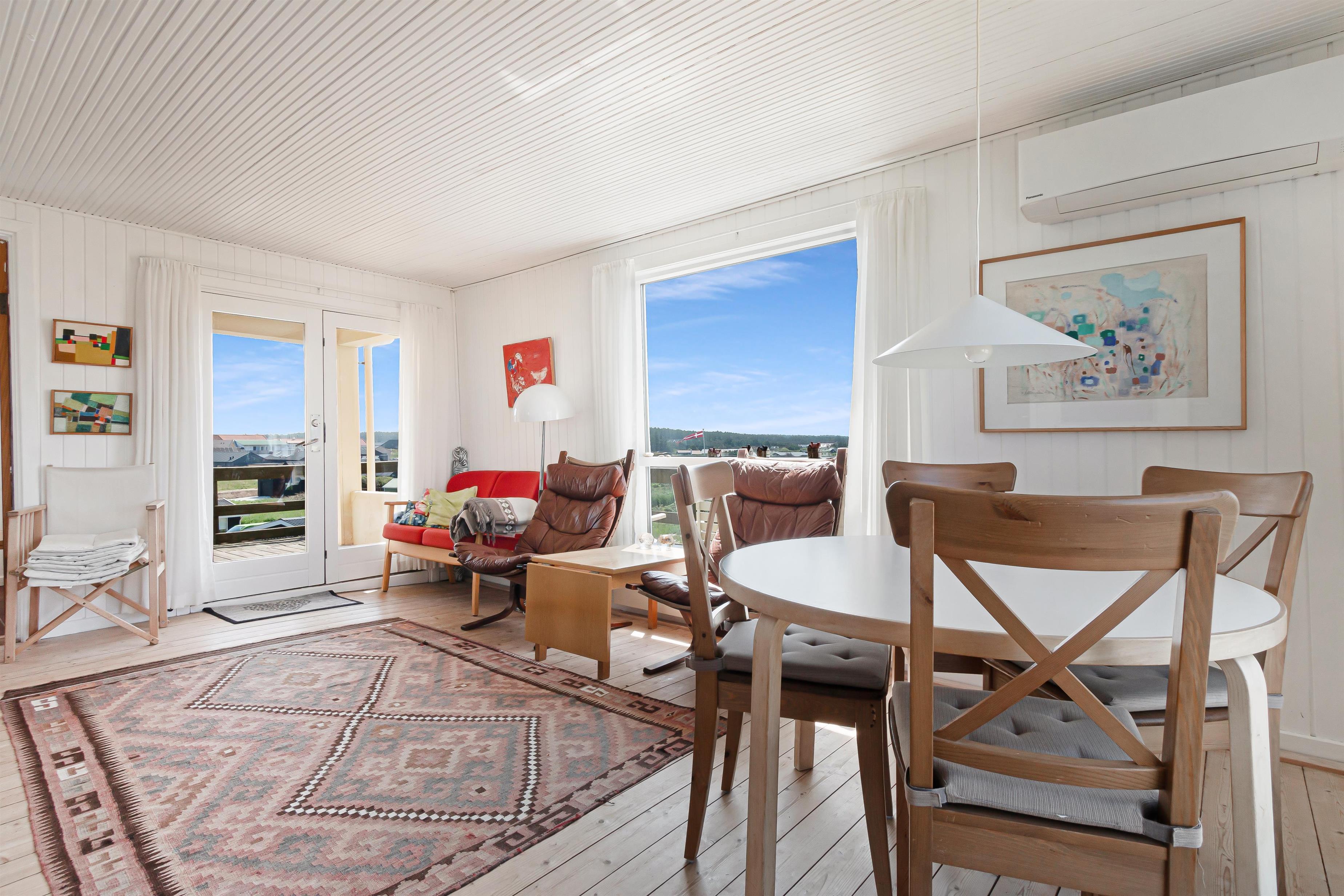 Et hyggeligt lille hus fra 1958. Der er blevet installeret en varmepumpe, så det er varmt og behageligt at opholde sig i huset, selv om vinteren. Her finder du alt, hvad du behøver for at få en god ferie: komfortable senge, et veludstyret køkken og en hyggelig og lys stue med fantastisk udsigt mod syd over området og havet mod vest. Der er udendørs møbler og en solrig terrasse mod øst og syd. Når du er i huset, kan du nyde den fantastiske panoramaudsigt over himlens skyer, der konstant skifter form og farve.