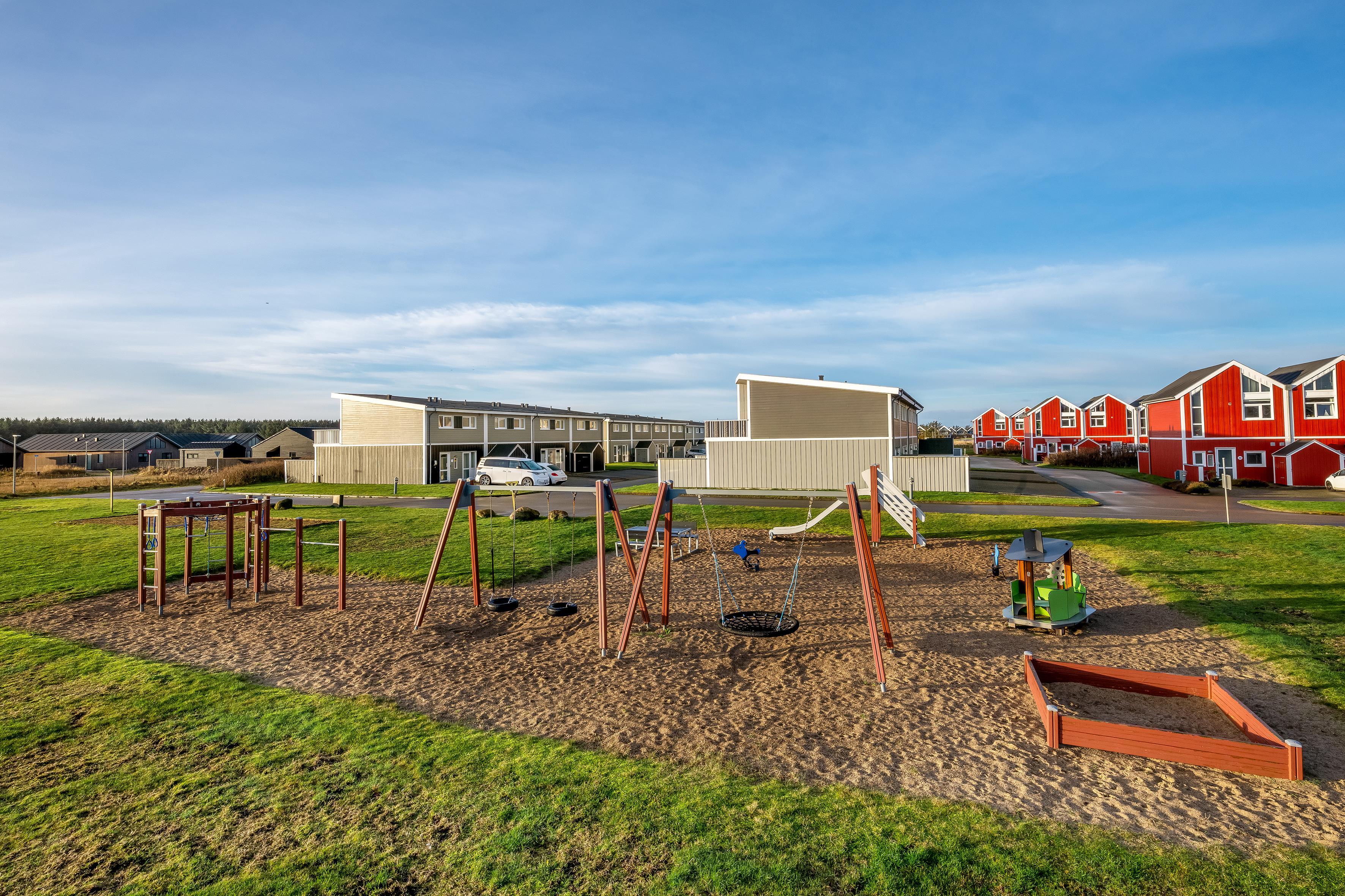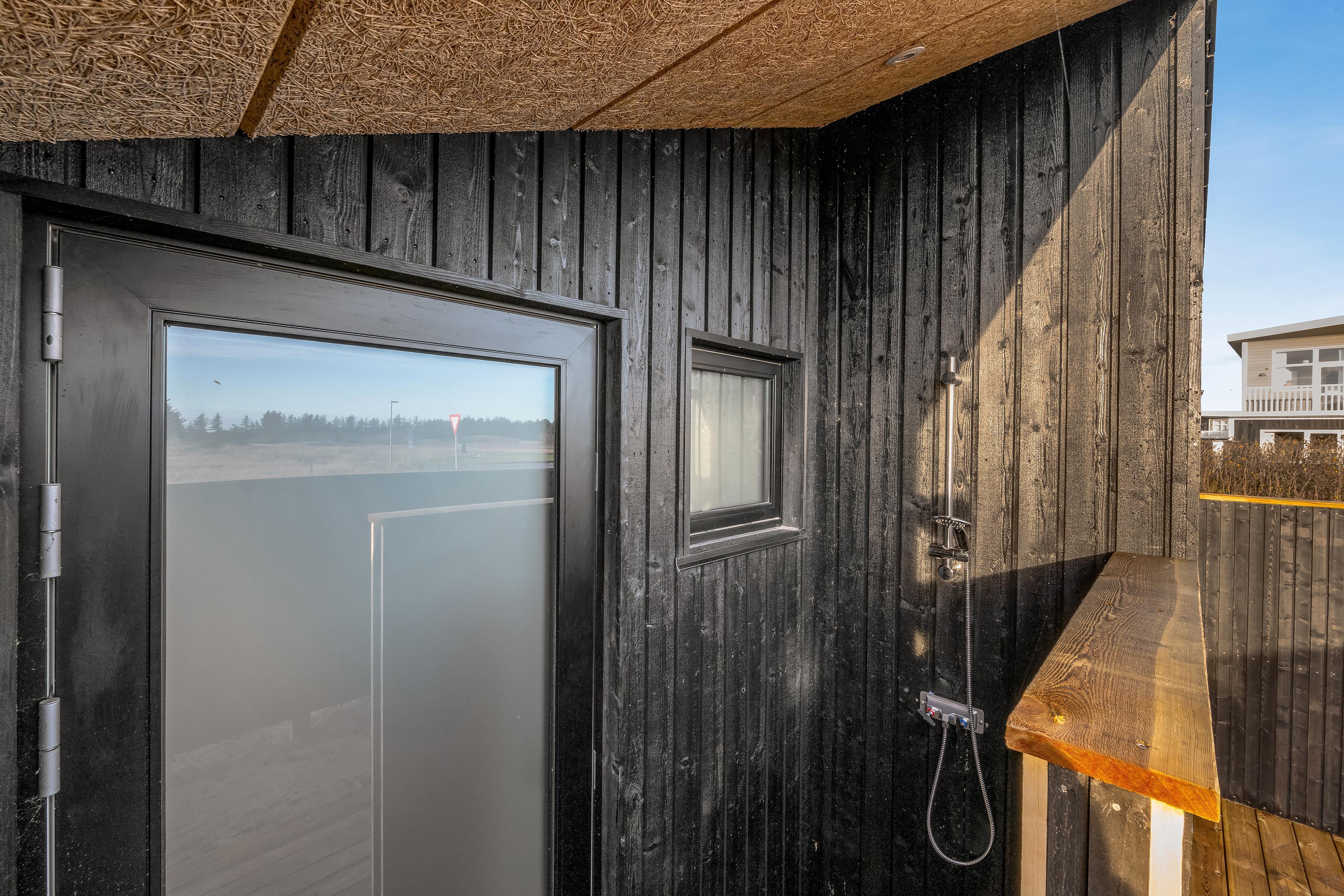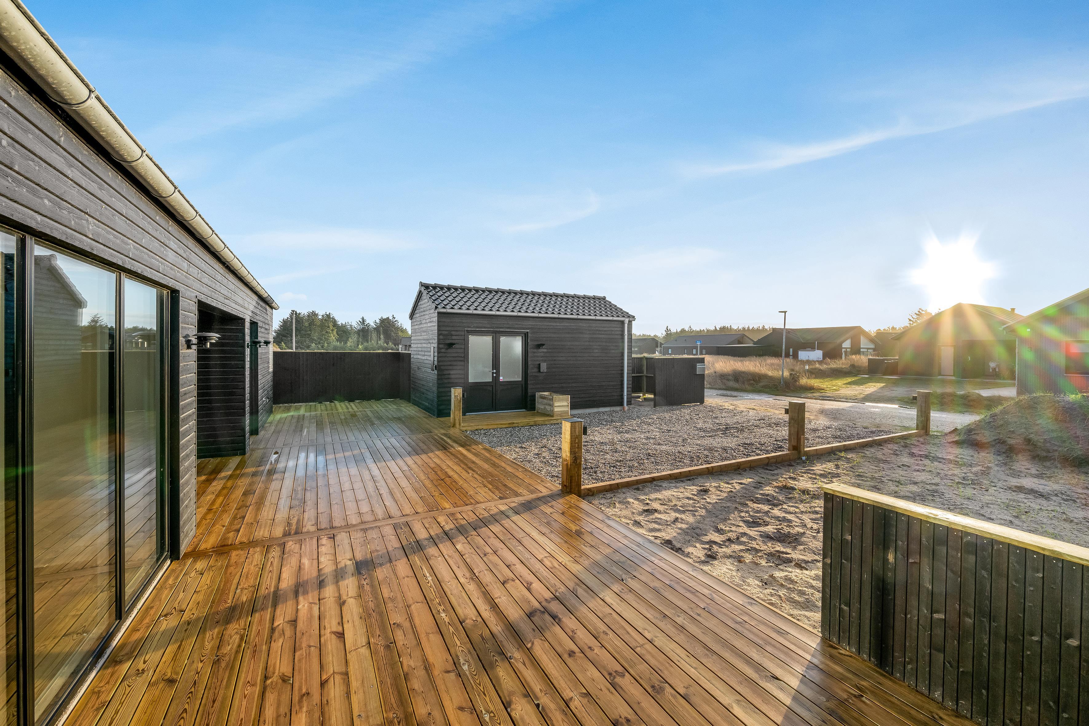 Haven og terrassen inviterer til både afslapning og aktivitet uanset tidspunktet på dagen. Med det store terrasseområde, herunder en overdækket del, er det let at finde læ og sol. Der er en skøn udespa samt udebruser, og der er en strategisk placeret vold ved huset, så man kan solbade i fred. Her er god plads til leg og hygge, og fra huset er der kort afstand til både strand, by og indkøb – alt ligger inden for cirka en kilometers radius.