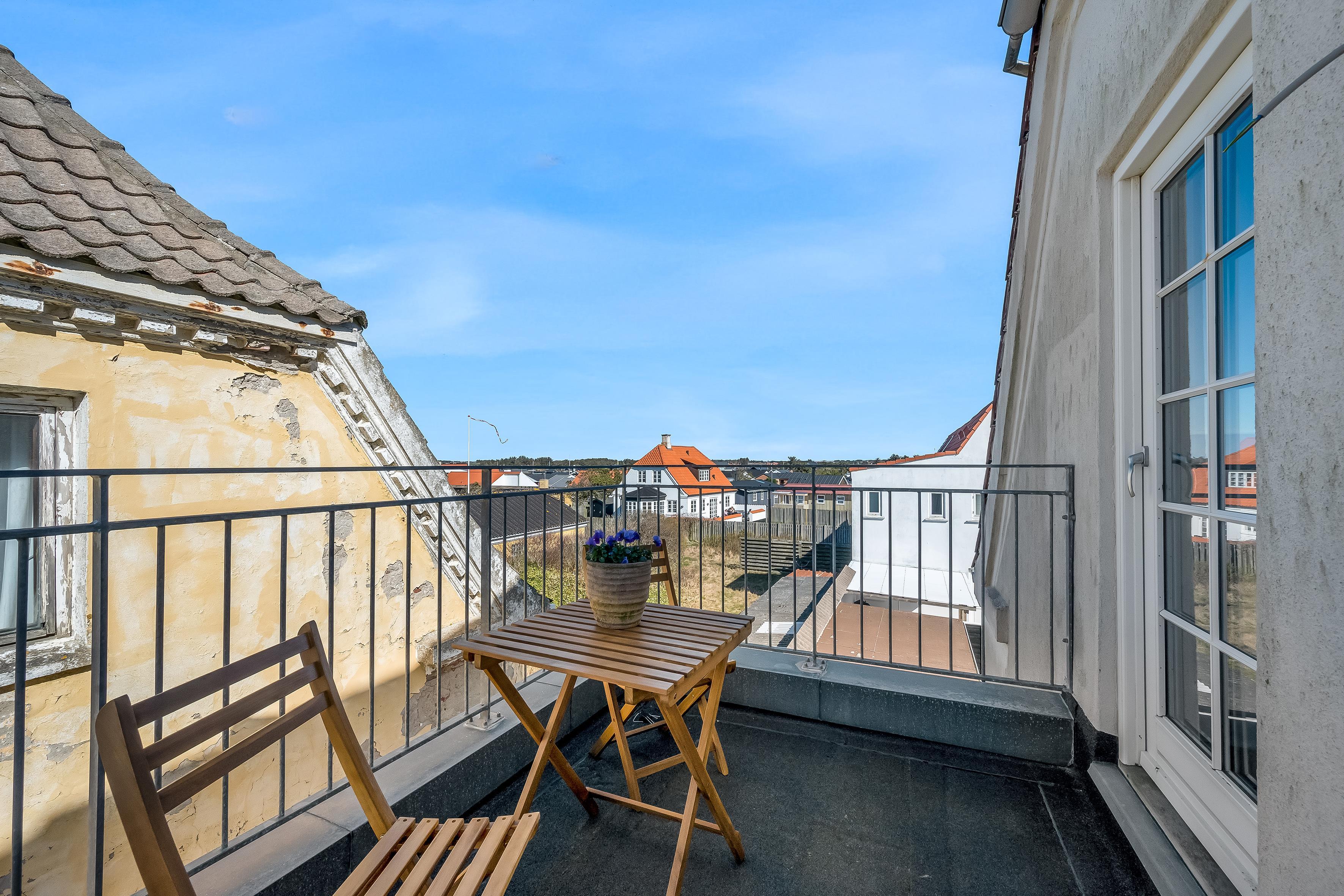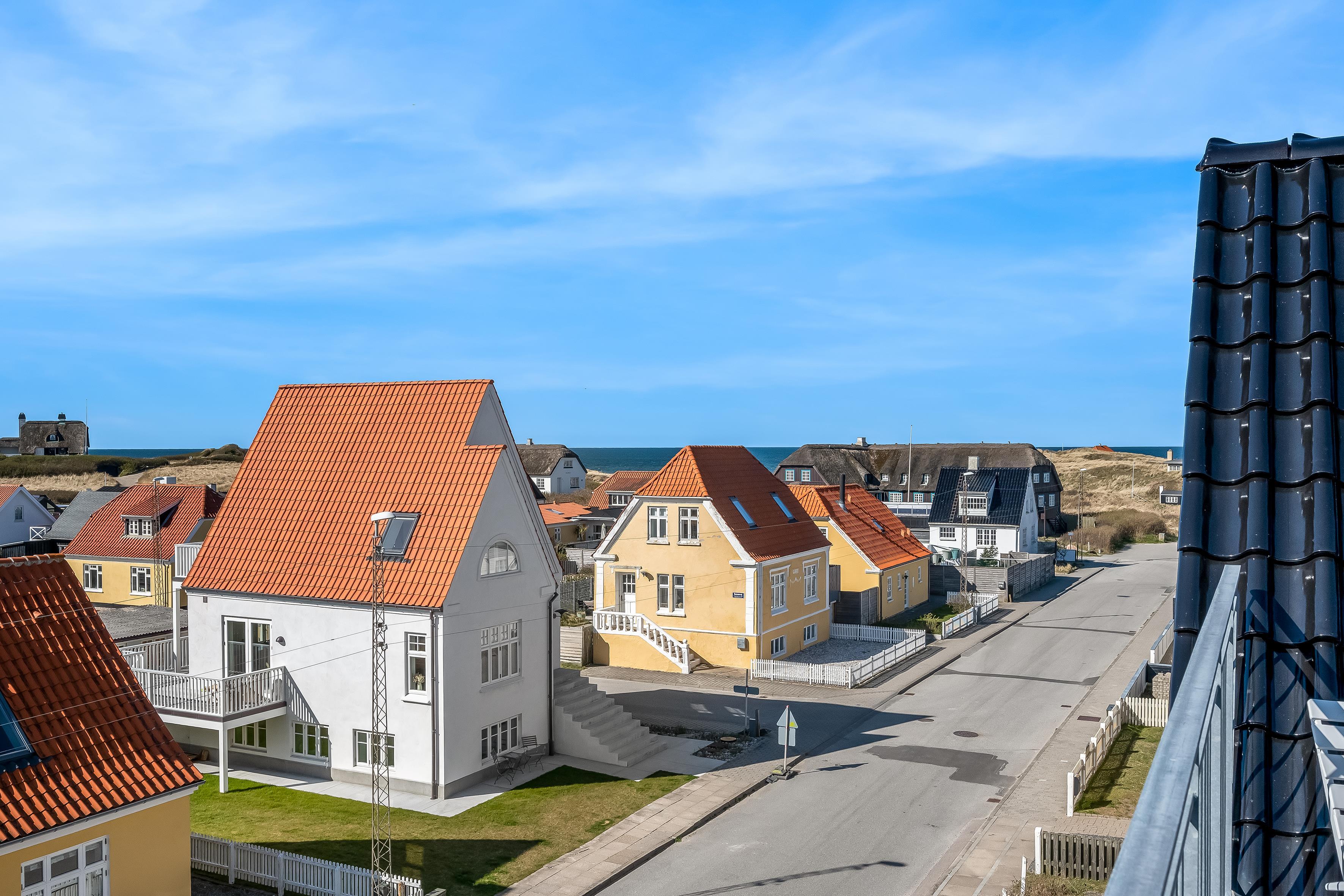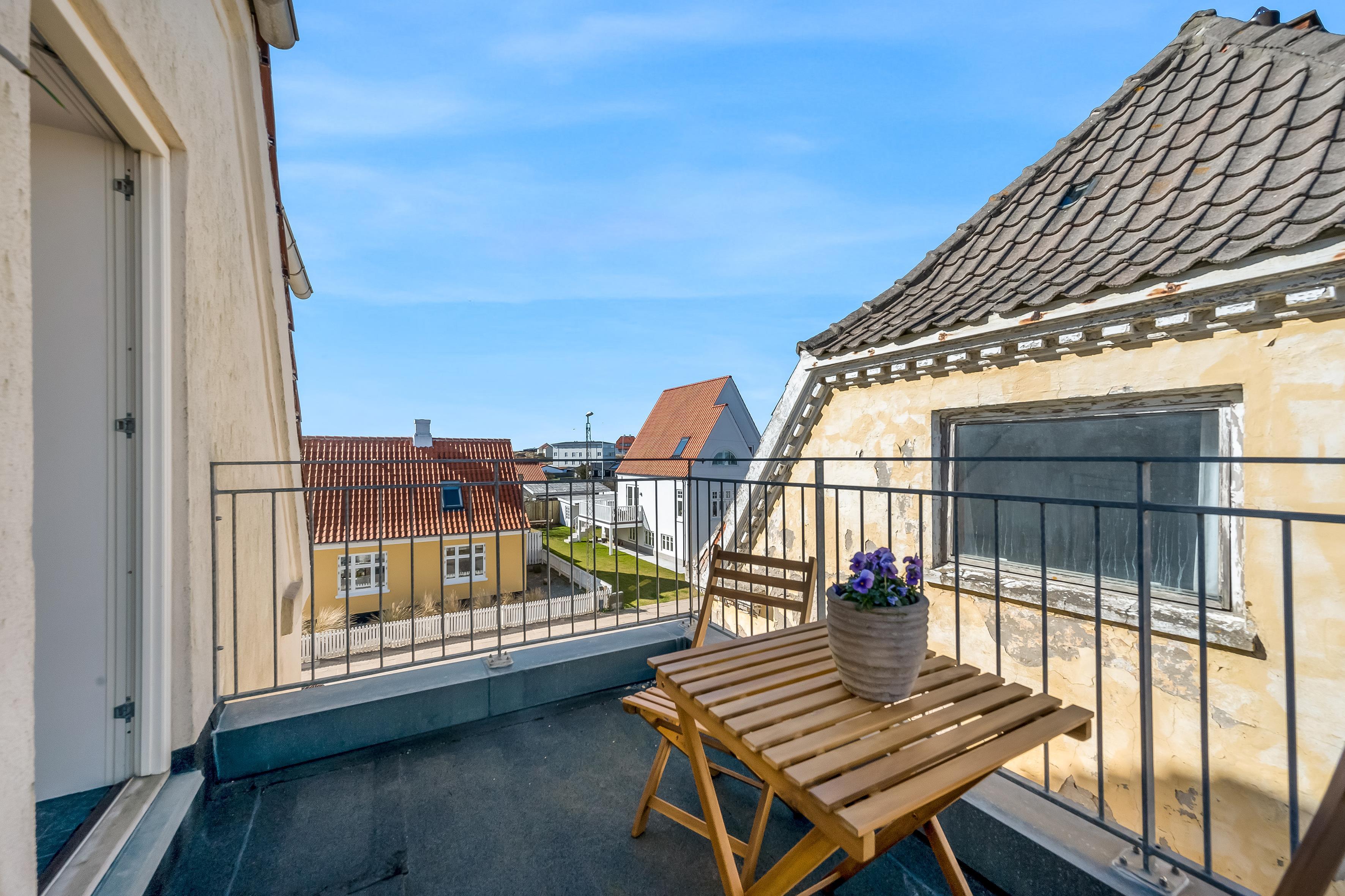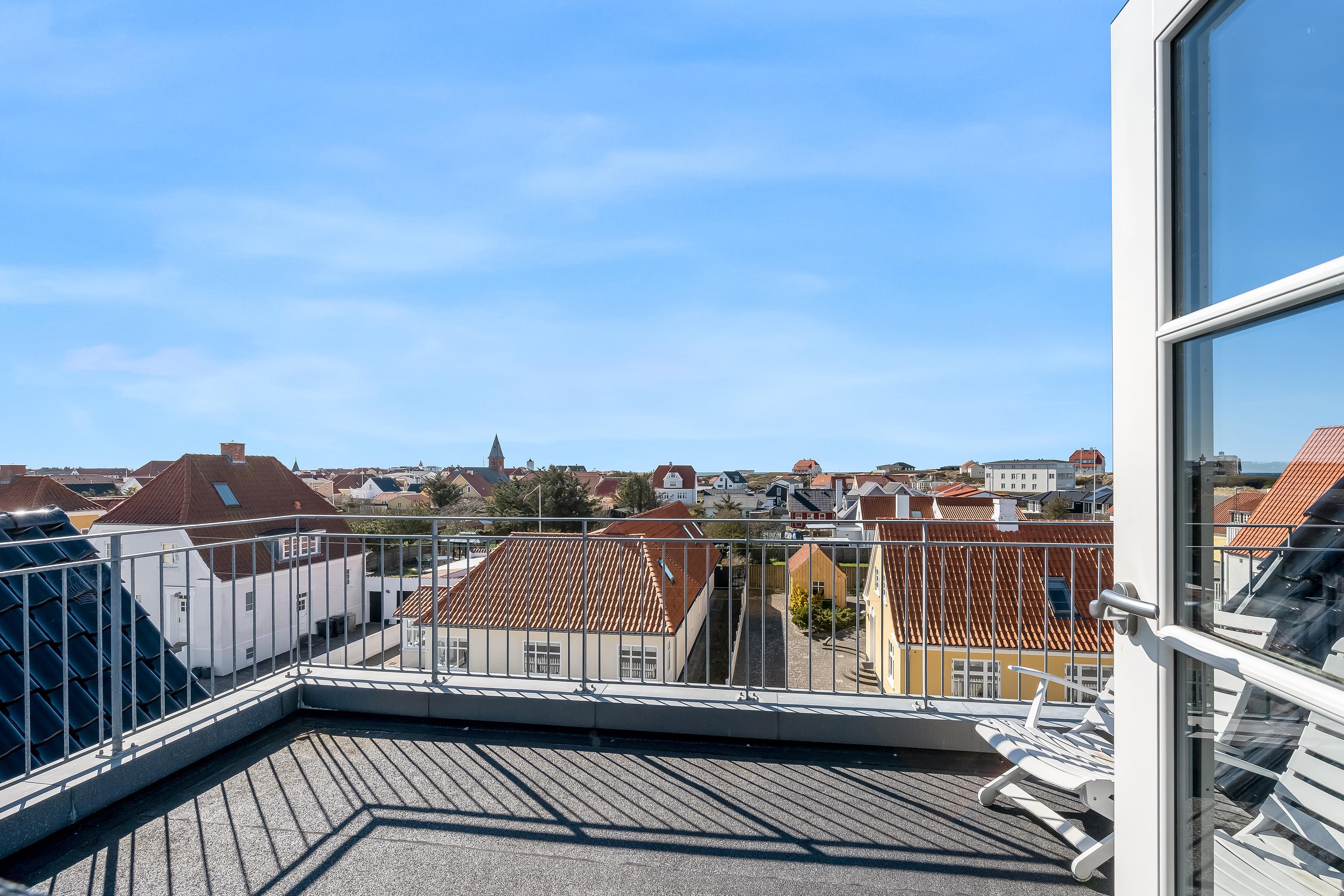 Ud over udsigten inde fra lejligheden, er et af højdepunkterne også den private tagterrasse, hvor du kan slappe af med udsigt til havet og klitterne. Udover tagterrassen er der også en altan, som du kan tilgå fra det dejlige køkkenalrum. Der er parkering ved villaen, og alt indenfor en kort rækkevidde. Så gør dig klar til afslappende feriedage, hvor du kan nyde lyden af byens liv blandet med Vesterhavets brusen – ren feriestemning i særklasse året rundt!