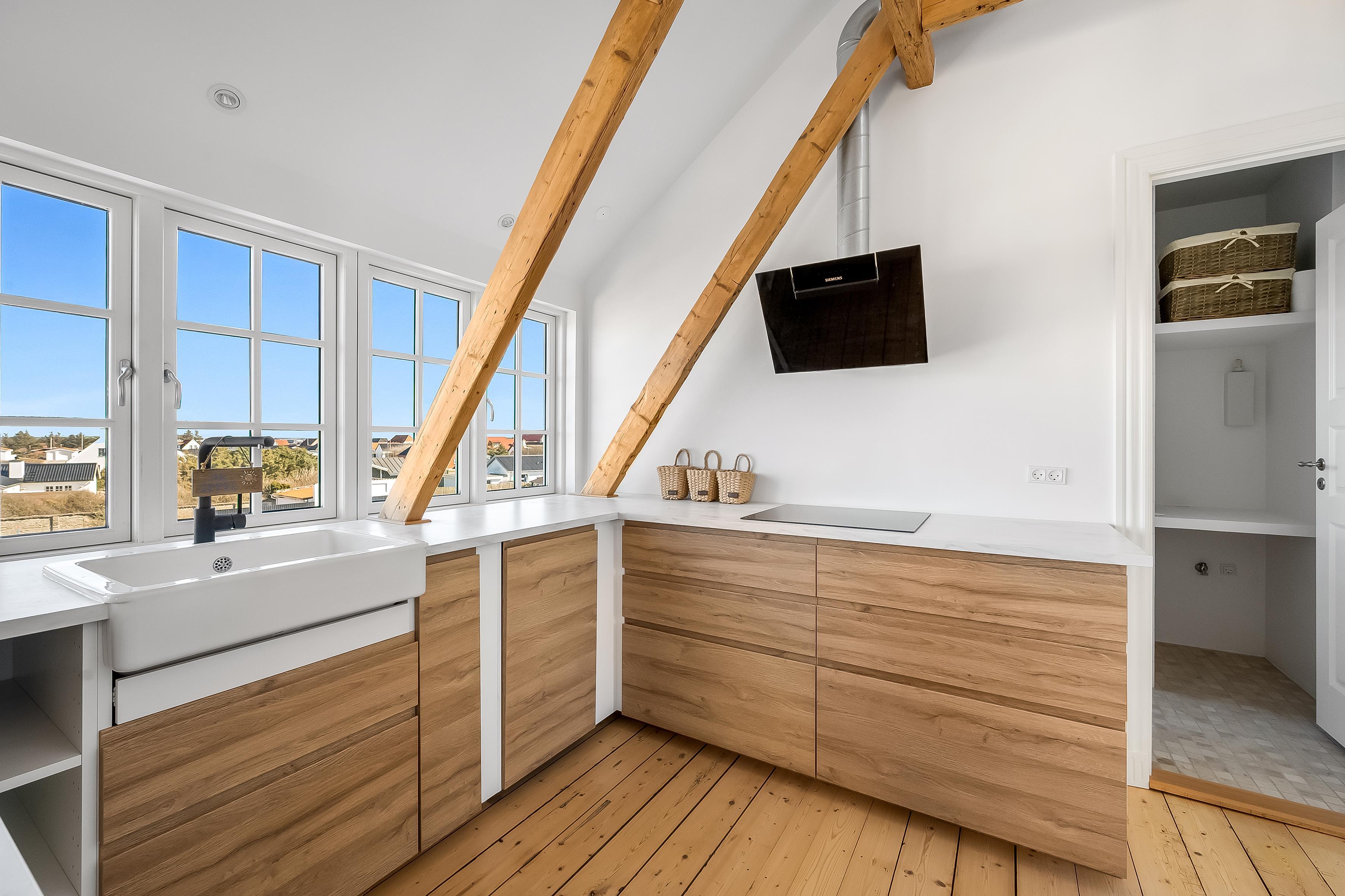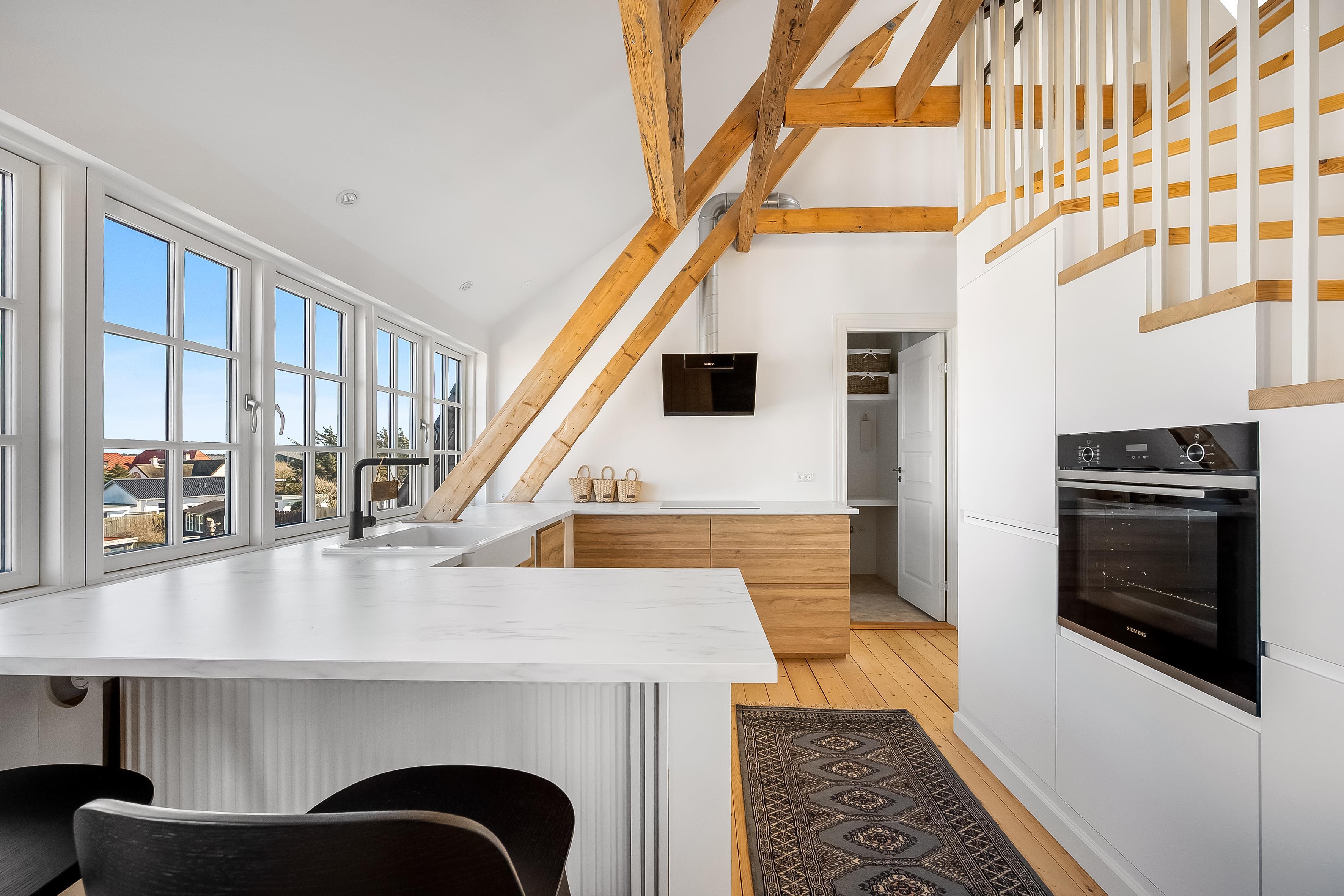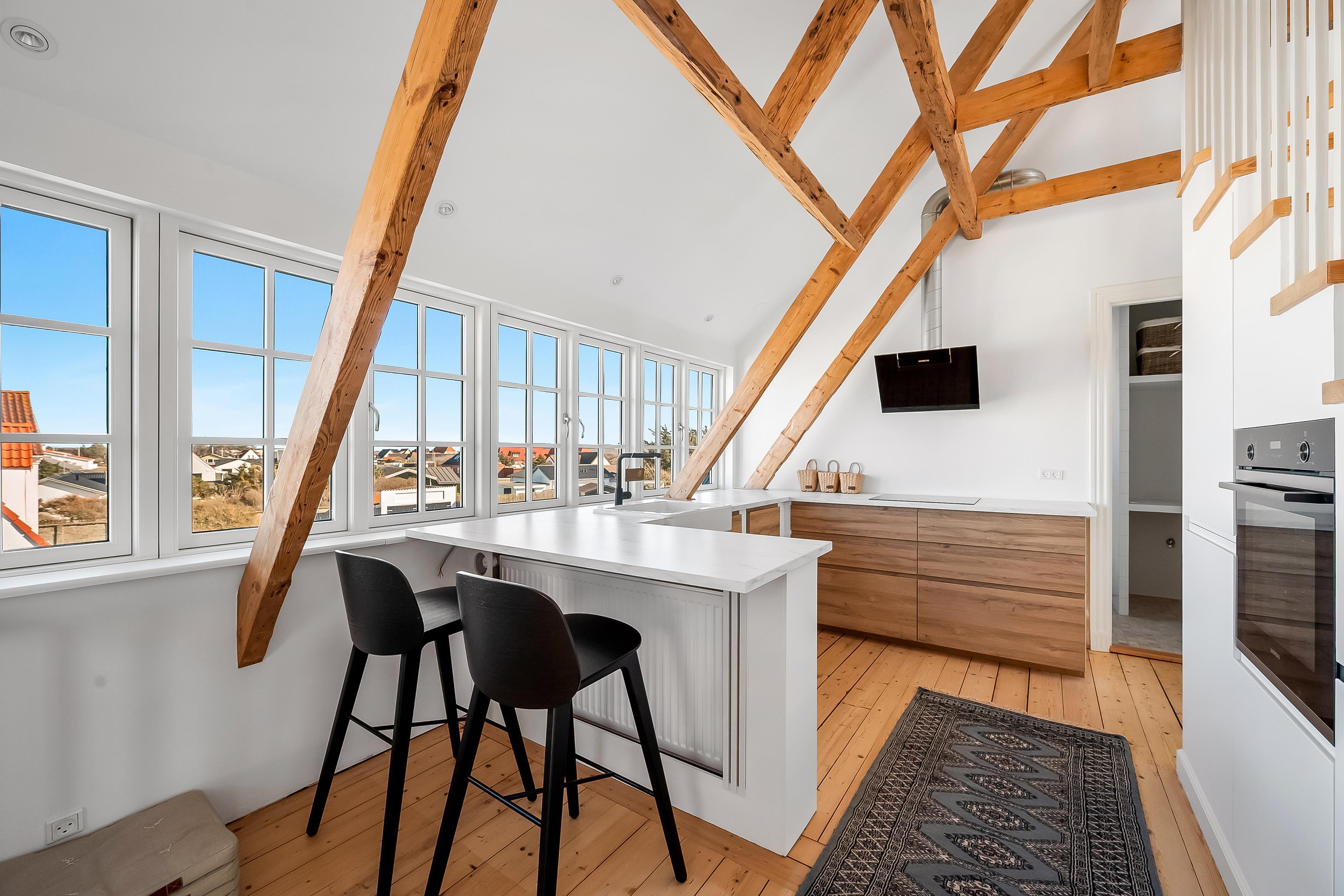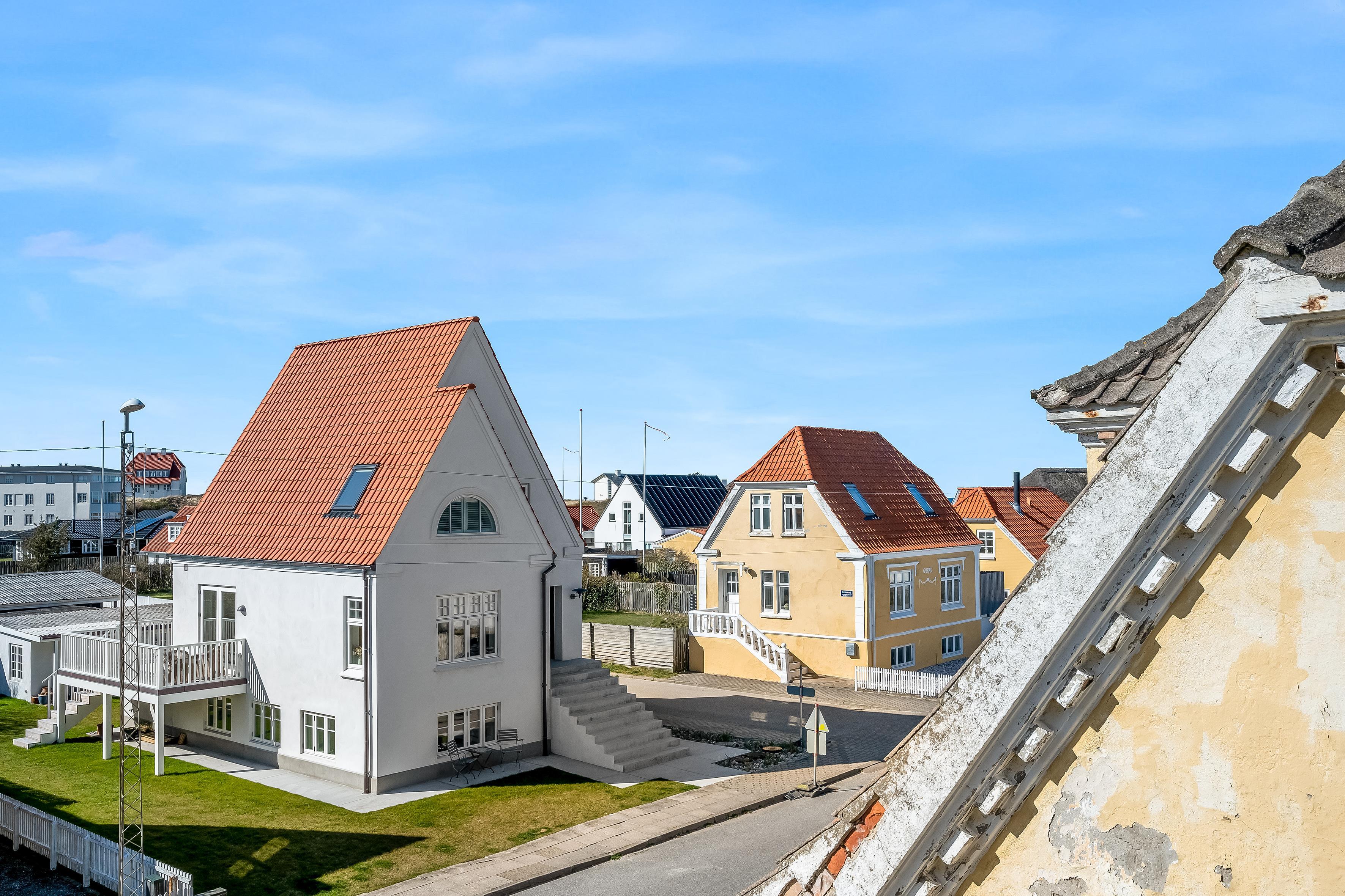 Ud over udsigten inde fra lejligheden, er et af højdepunkterne også den private tagterrasse, hvor du kan slappe af med udsigt til havet og klitterne. Udover tagterrassen er der også en altan, som du kan tilgå fra det dejlige køkkenalrum. Der er parkering ved villaen, og alt indenfor en kort rækkevidde. Så gør dig klar til afslappende feriedage, hvor du kan nyde lyden af byens liv blandet med Vesterhavets brusen – ren feriestemning i særklasse året rundt!