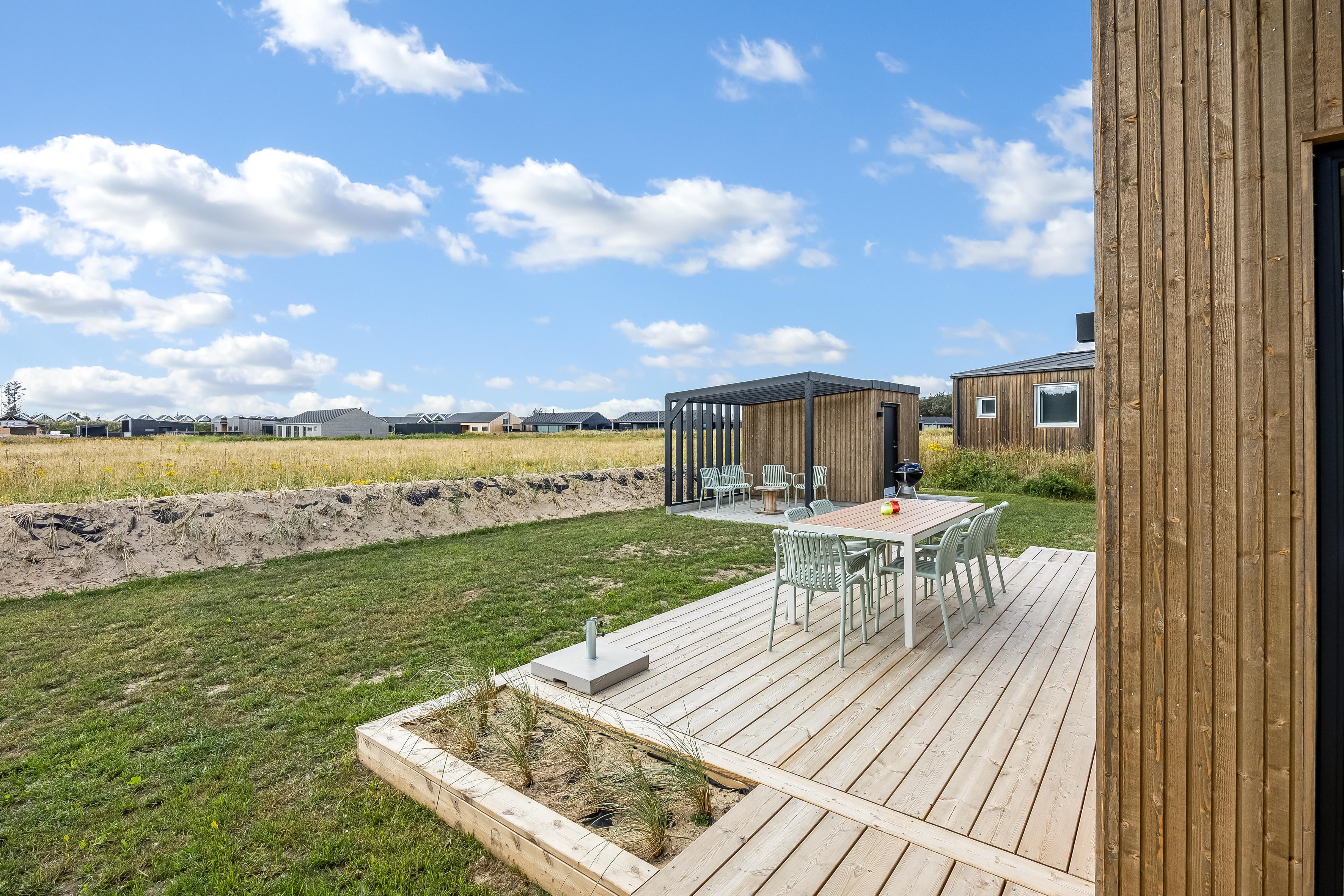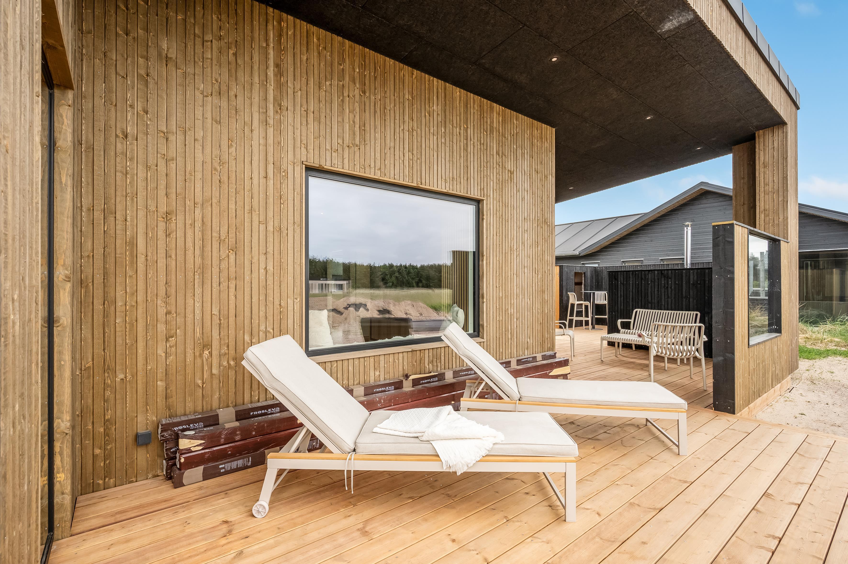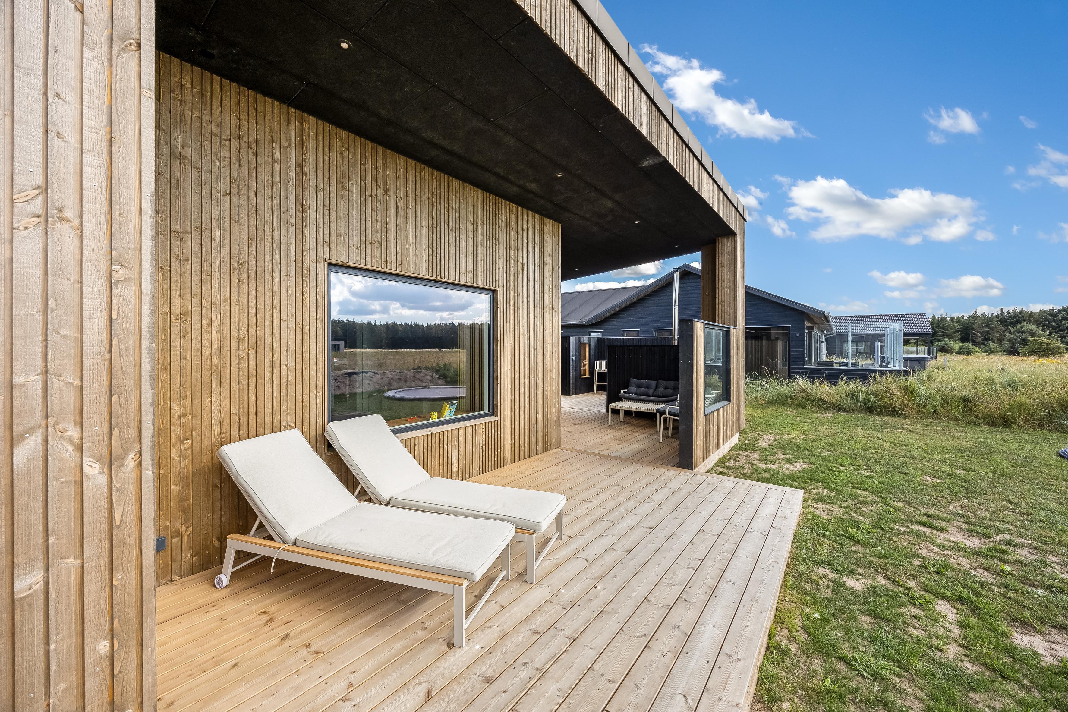 Nybygget sommerhus i Løkken med plads til 8, spa, flere terrasser og kort afstand til strand og by.