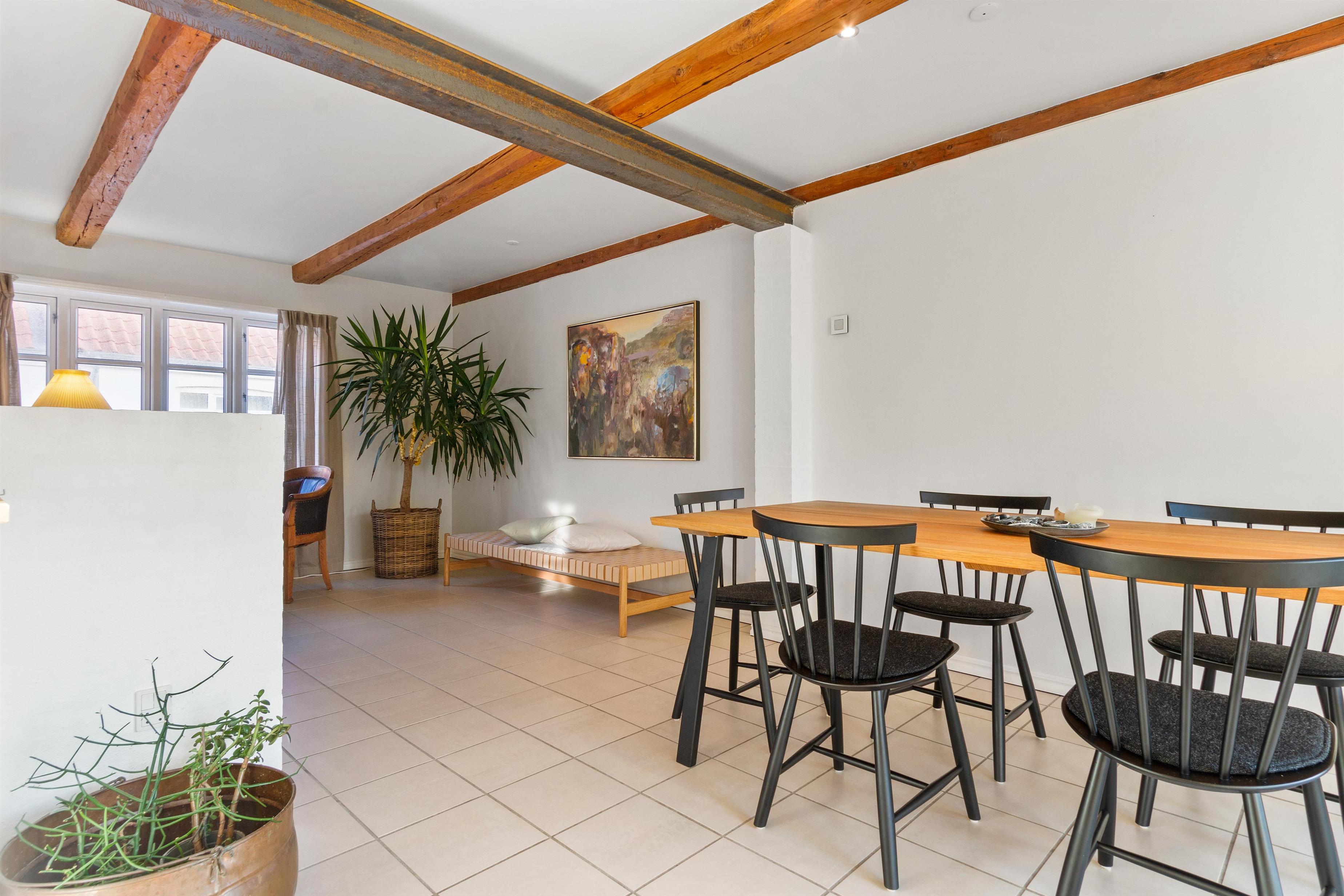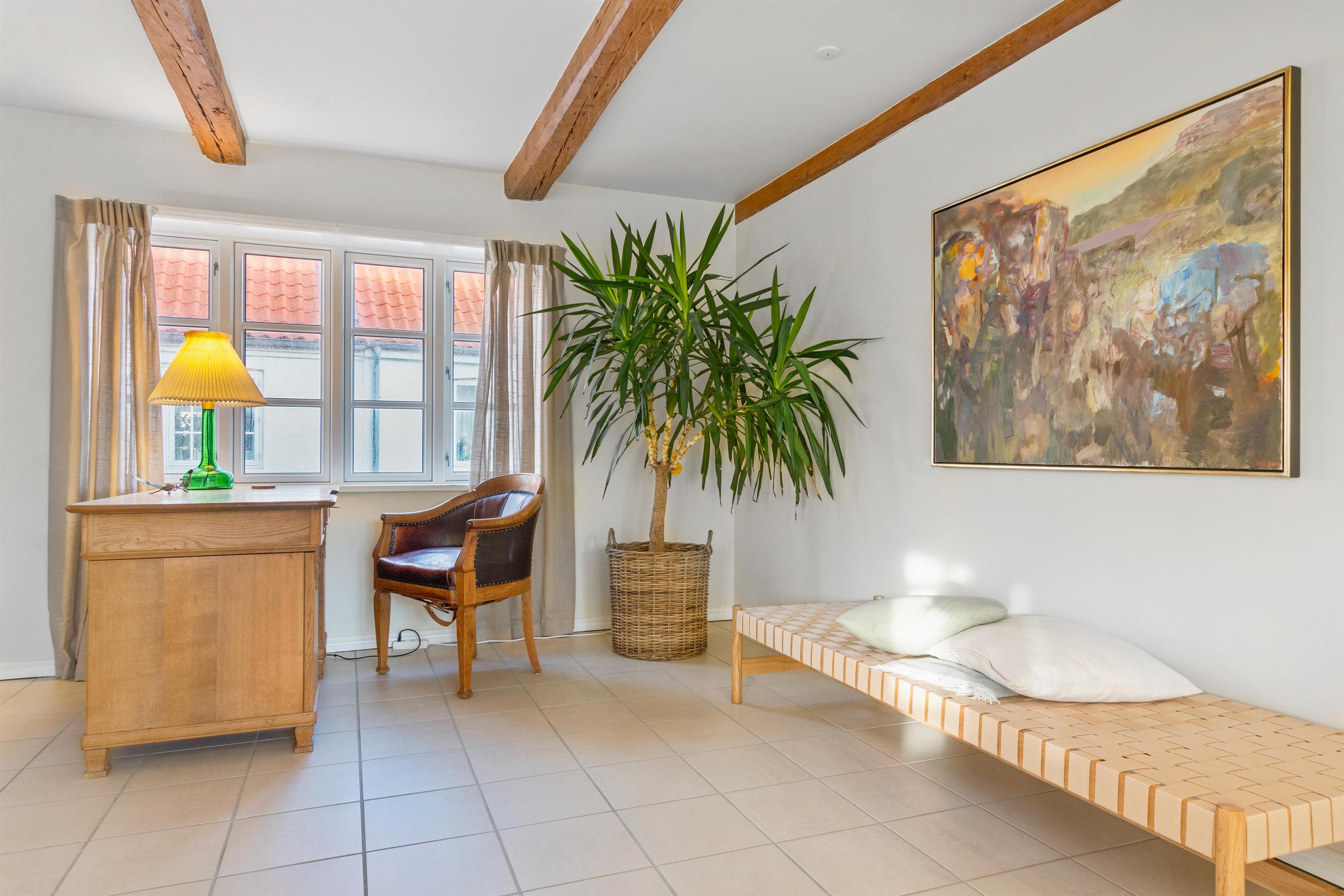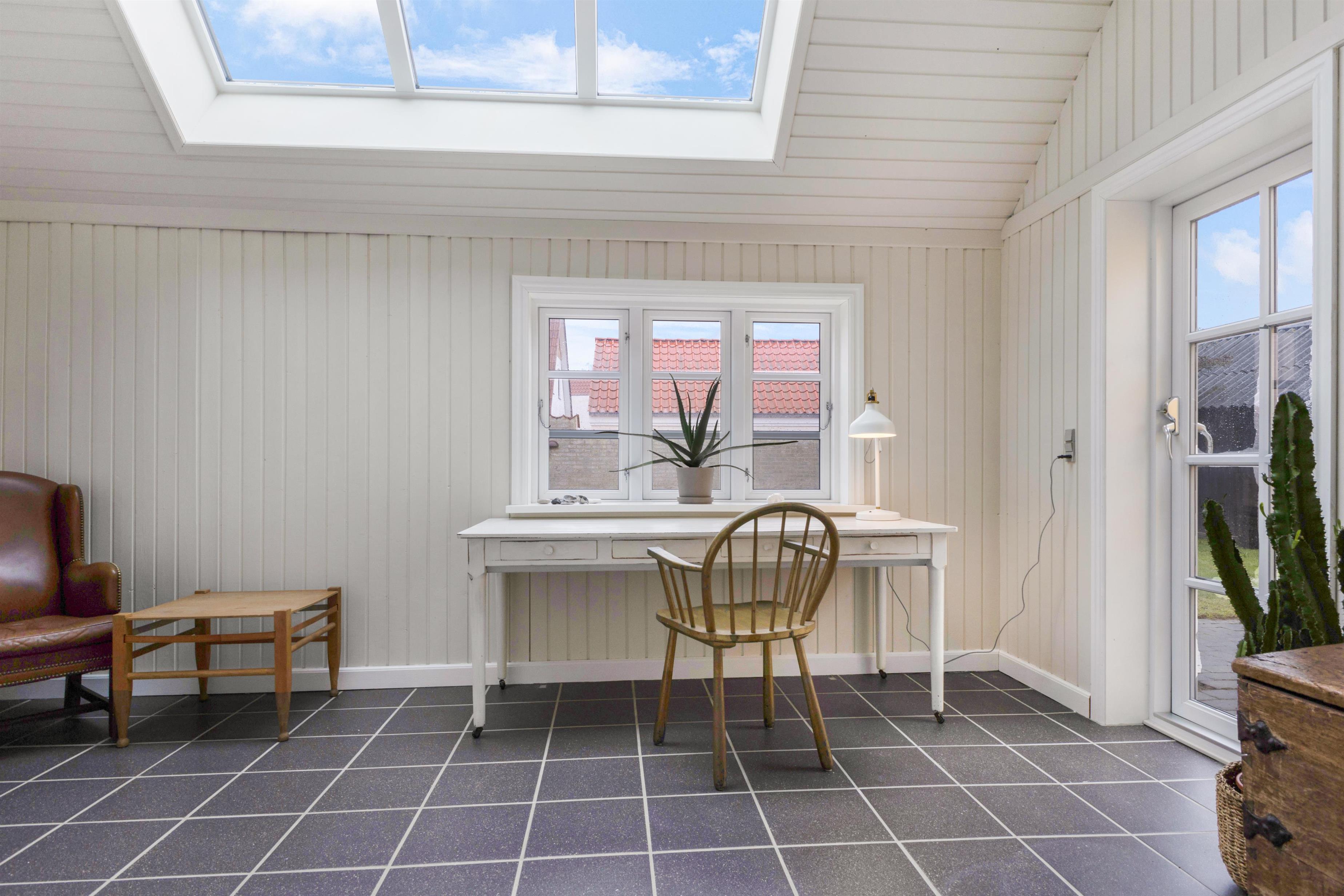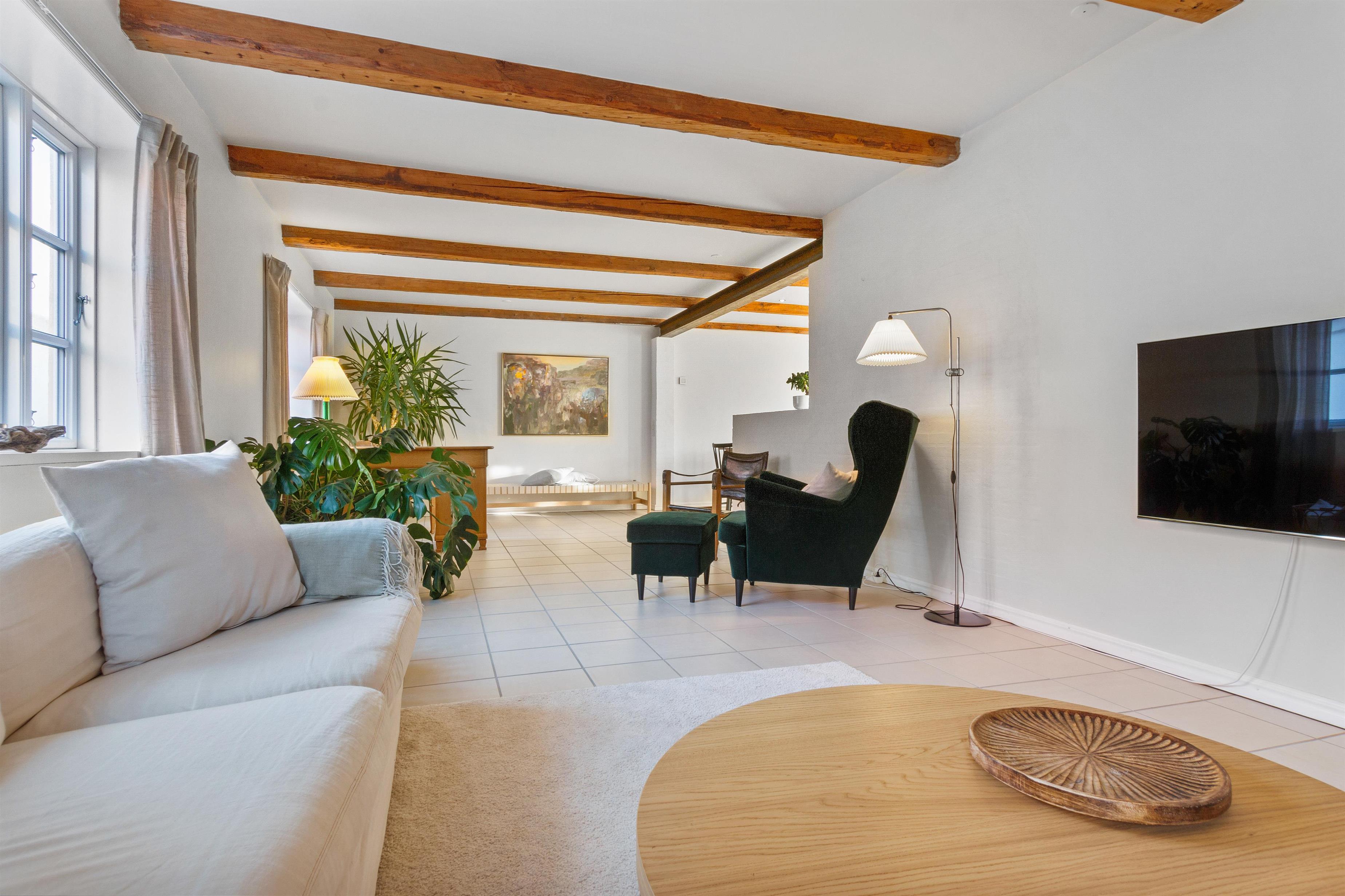 Indendørs finder du en velindrettet stue, der inviterer til fælles- og individuelle aktiviteter. Fra hygge- og fjernsynshjørnet til det indbydende læseområde og den praktiske skrivebordsplads, er stuen designet til at imødekomme alle behov. Der er et dejligt loungeområde i form af solstuen, som vender ud mod husets skønne gårdhave.