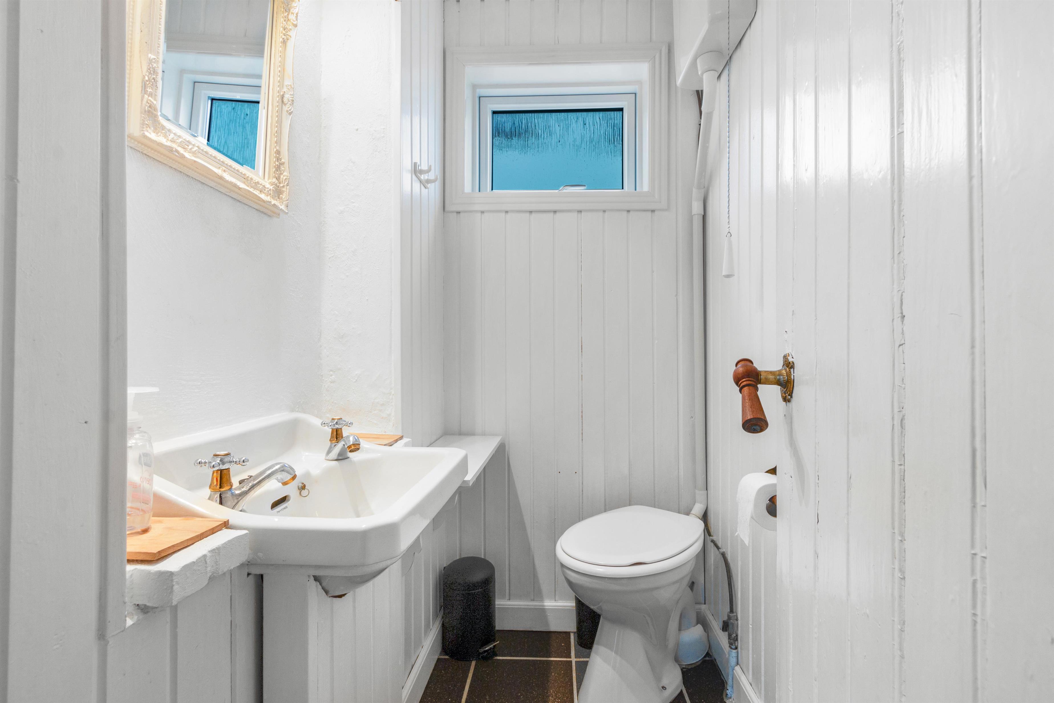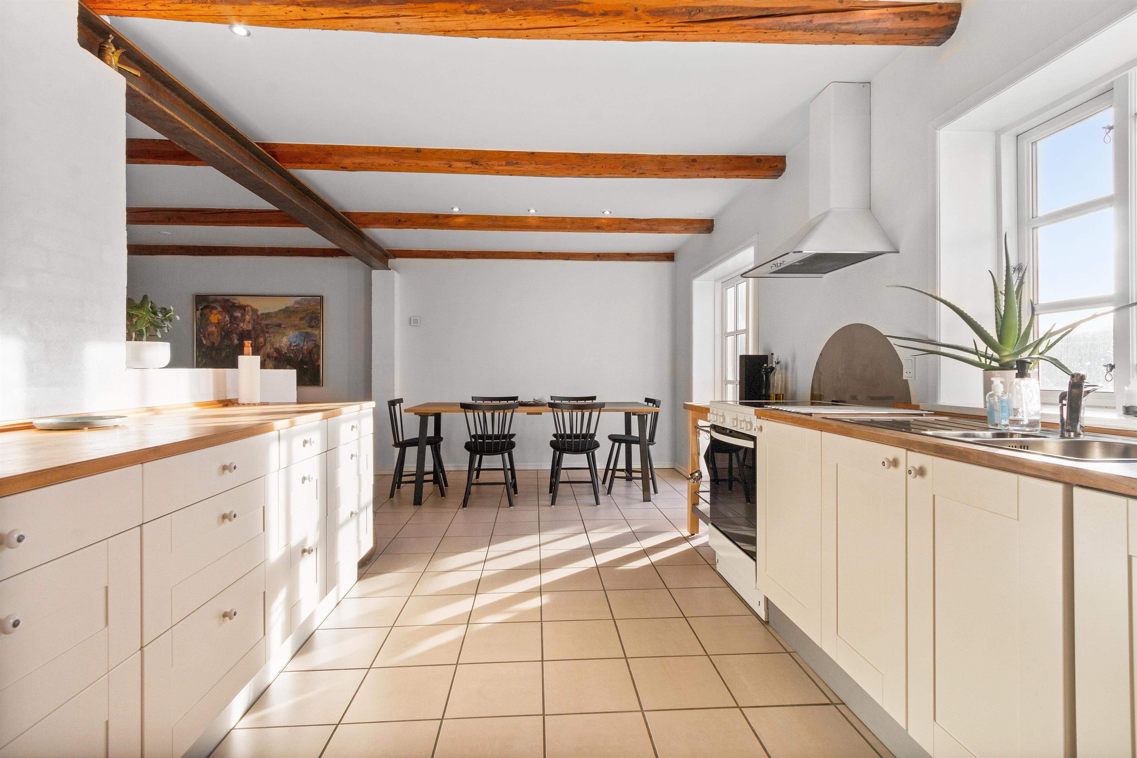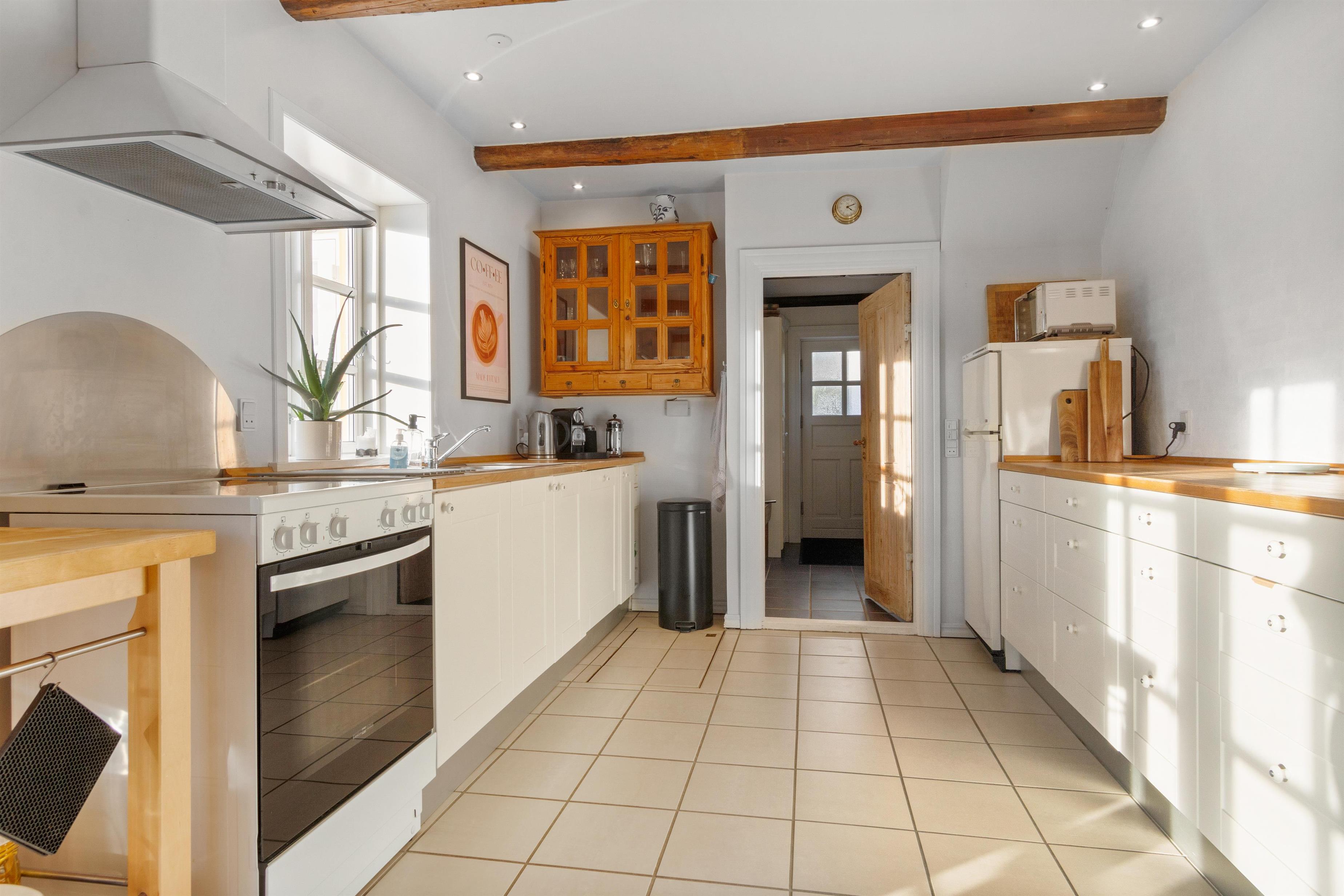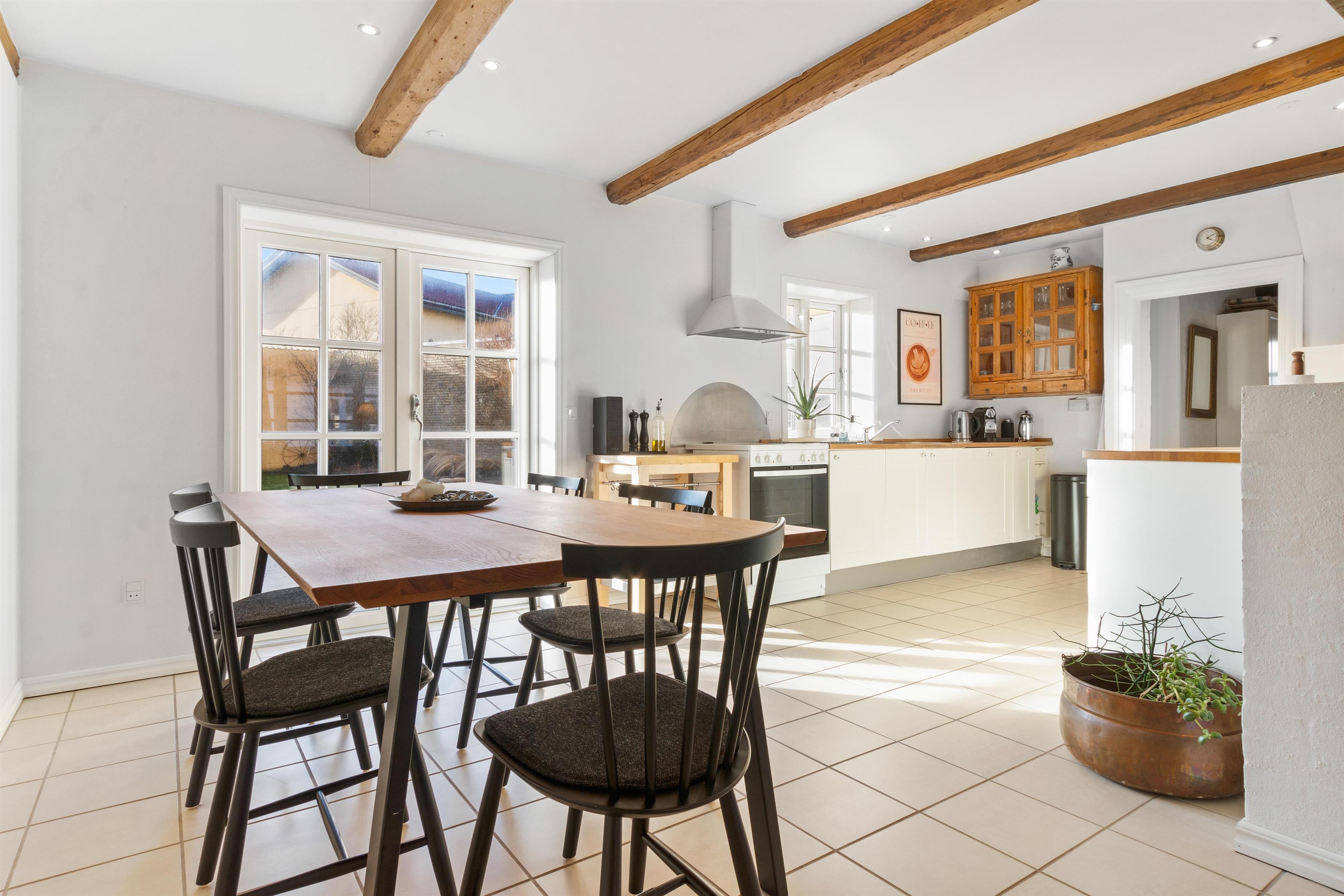 Køkkenet og stuen udgør et stort og charmerende rum, der skaber en perfekt atmosfære for samvær under madlavning og indendørs hygge. Det landlige køkken er indrettet med omhu, og tilbyder god plads til at forberede lækre måltider sammen. Ved enden af køkkenet finder du spisepladsen med plads til 6 personer og en fantastisk udsigt til haven gennem de franske dobbeltdøre. Adgang til huset sker fra terrassen, der fører dig til en unik solstue på venstre hånd - et skønt rum med fri passage til det udendørs loungeområde. I stueplan findes også badeværelse med toilet samt gæstetoilet.
