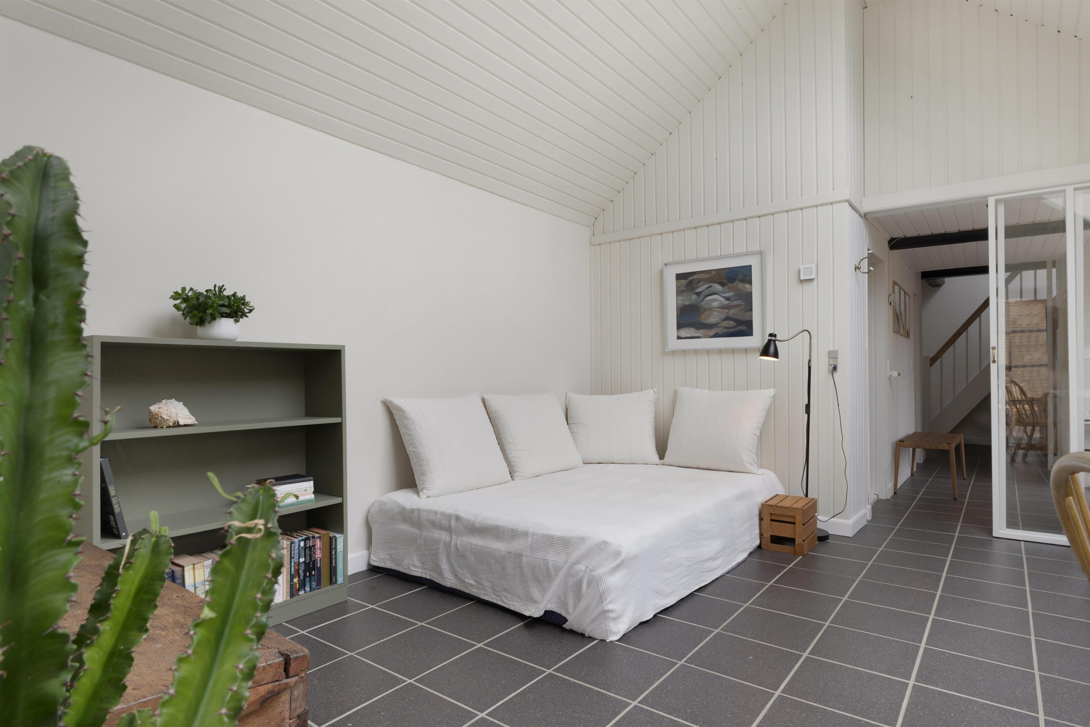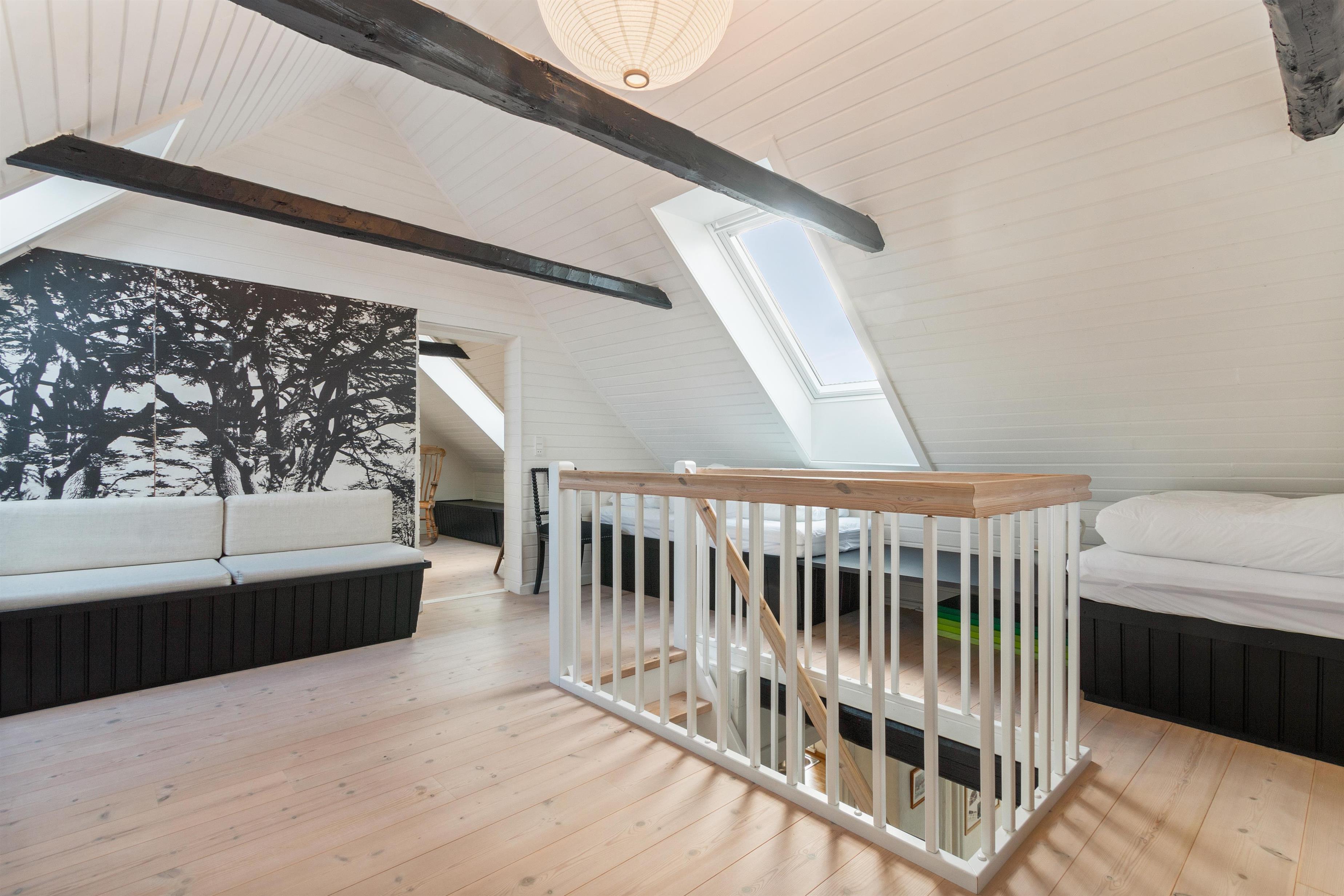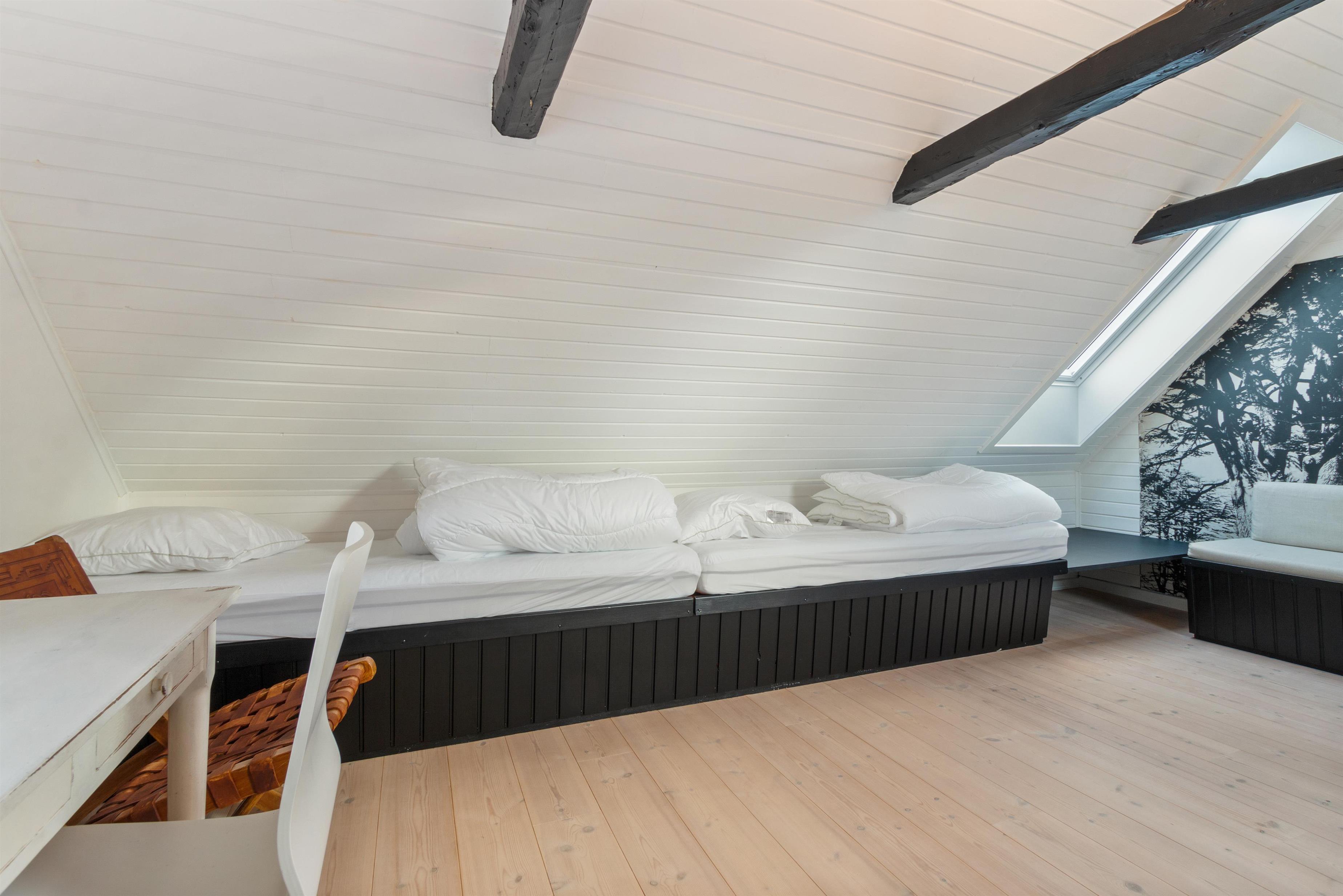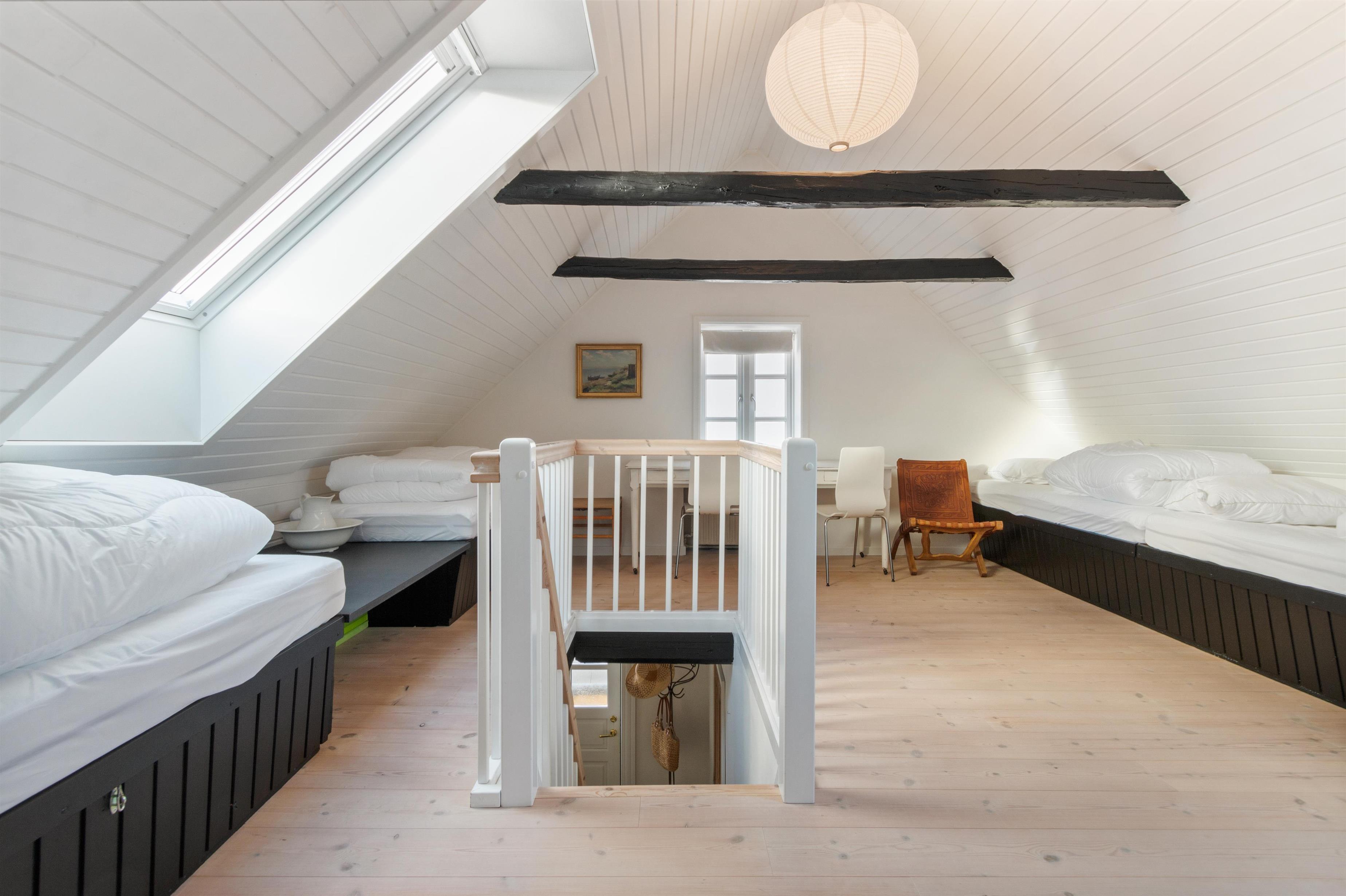 Førstesalen, nyistandsat i 2023, byder på et stort rum med 4 sovepladser og et arbejdsområde samt et rummeligt soveværelse med en dobbeltseng. Alle senge er udstyret med lækre kvalitetsmadrasser for en behagelig nattesøvn. Vil du gerne undgå trapper, er der mulighed for 2 ekstra soverpladser i husets dejlige solstue.