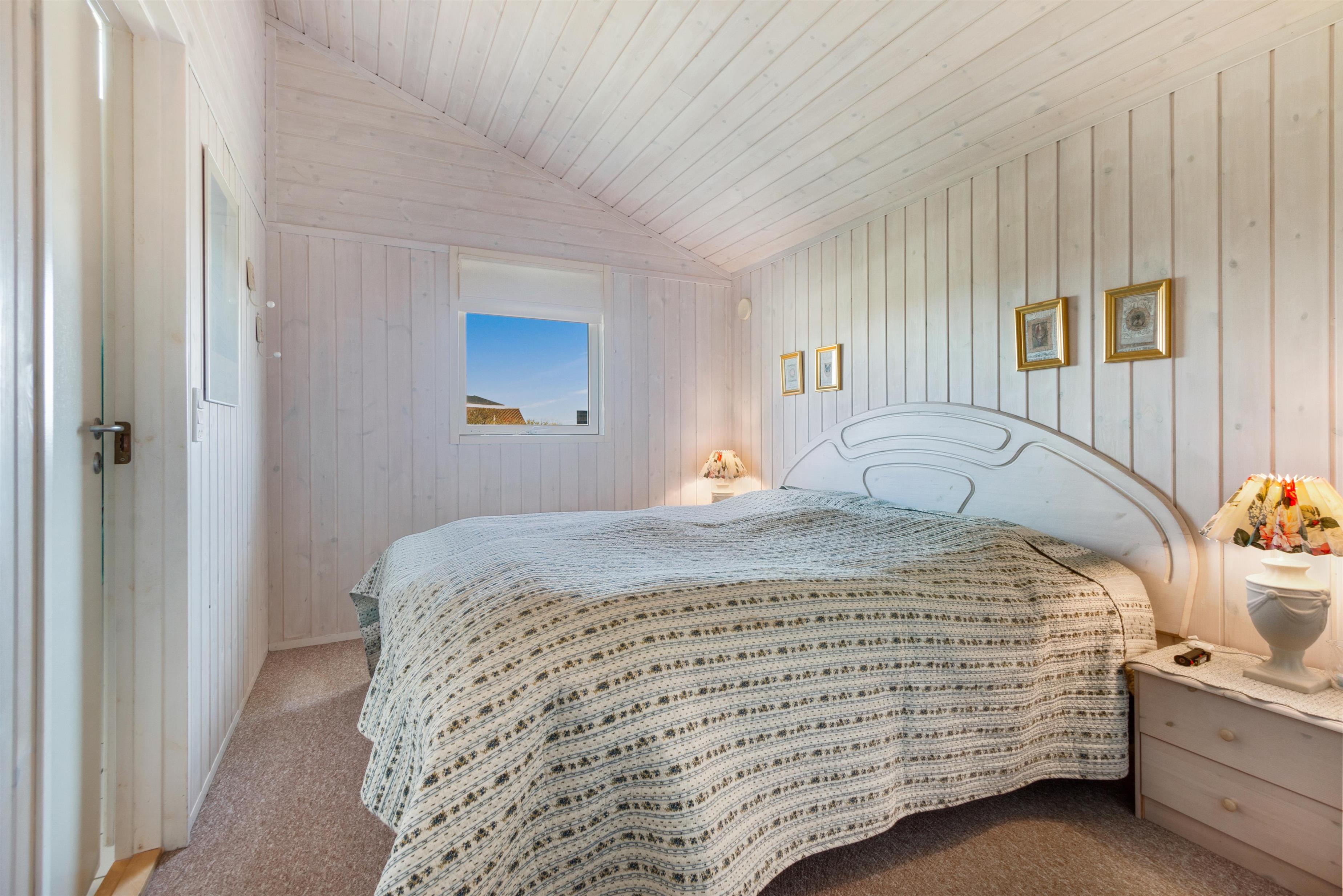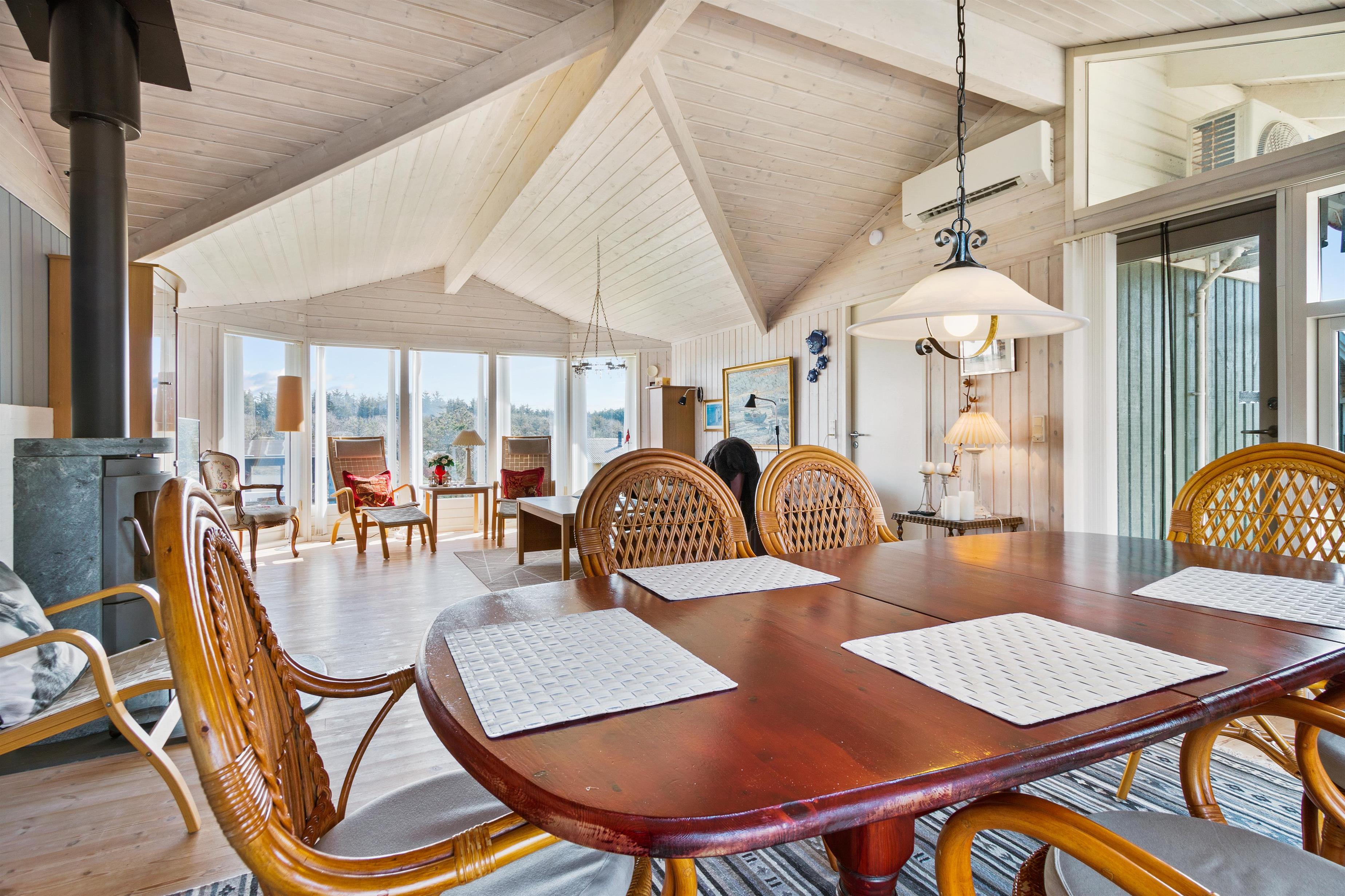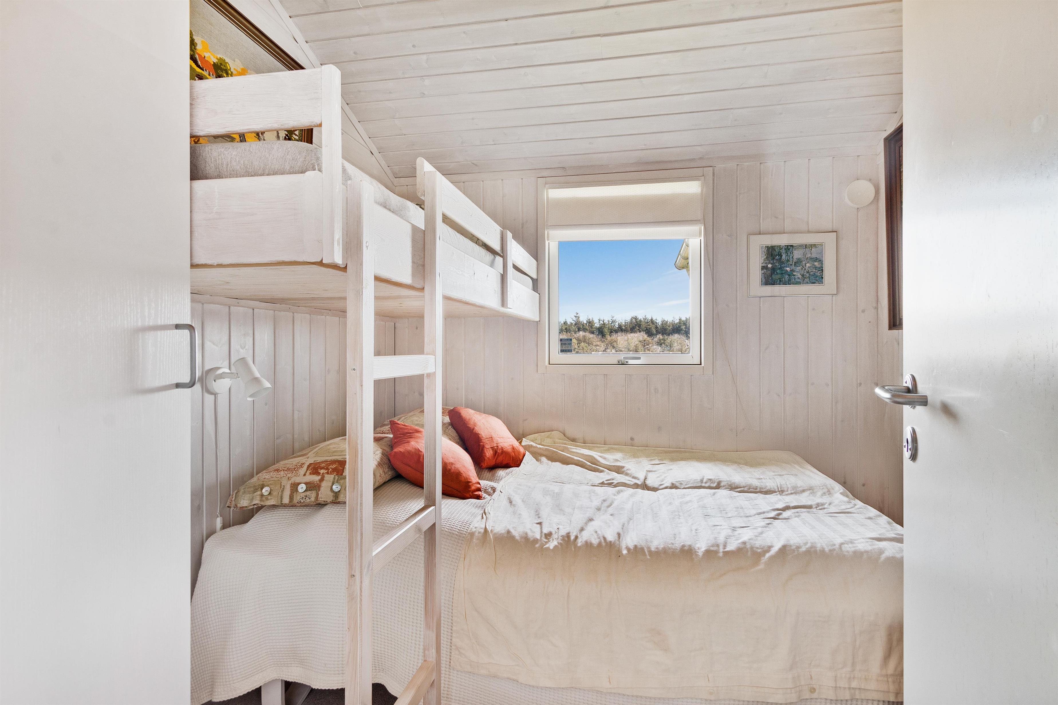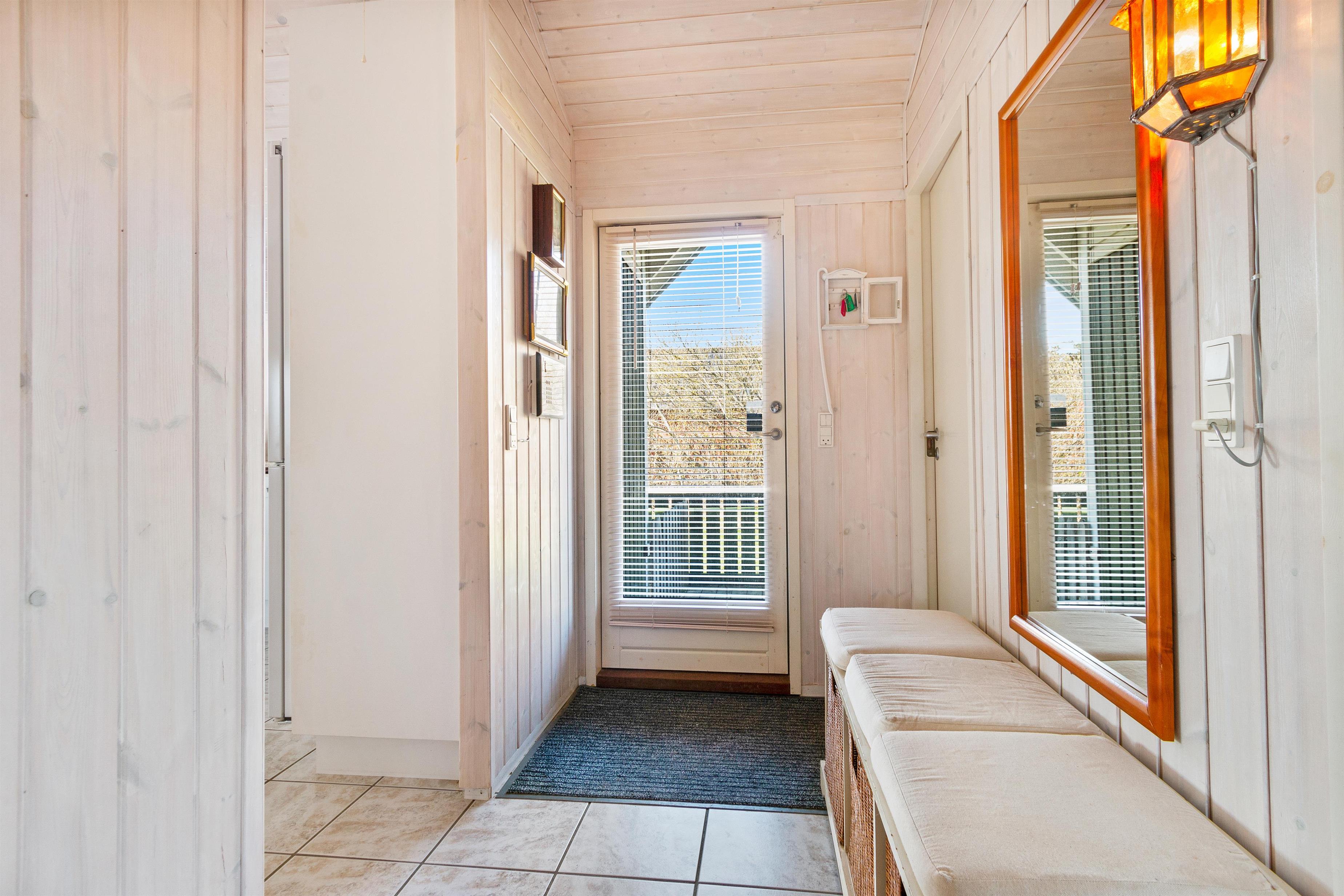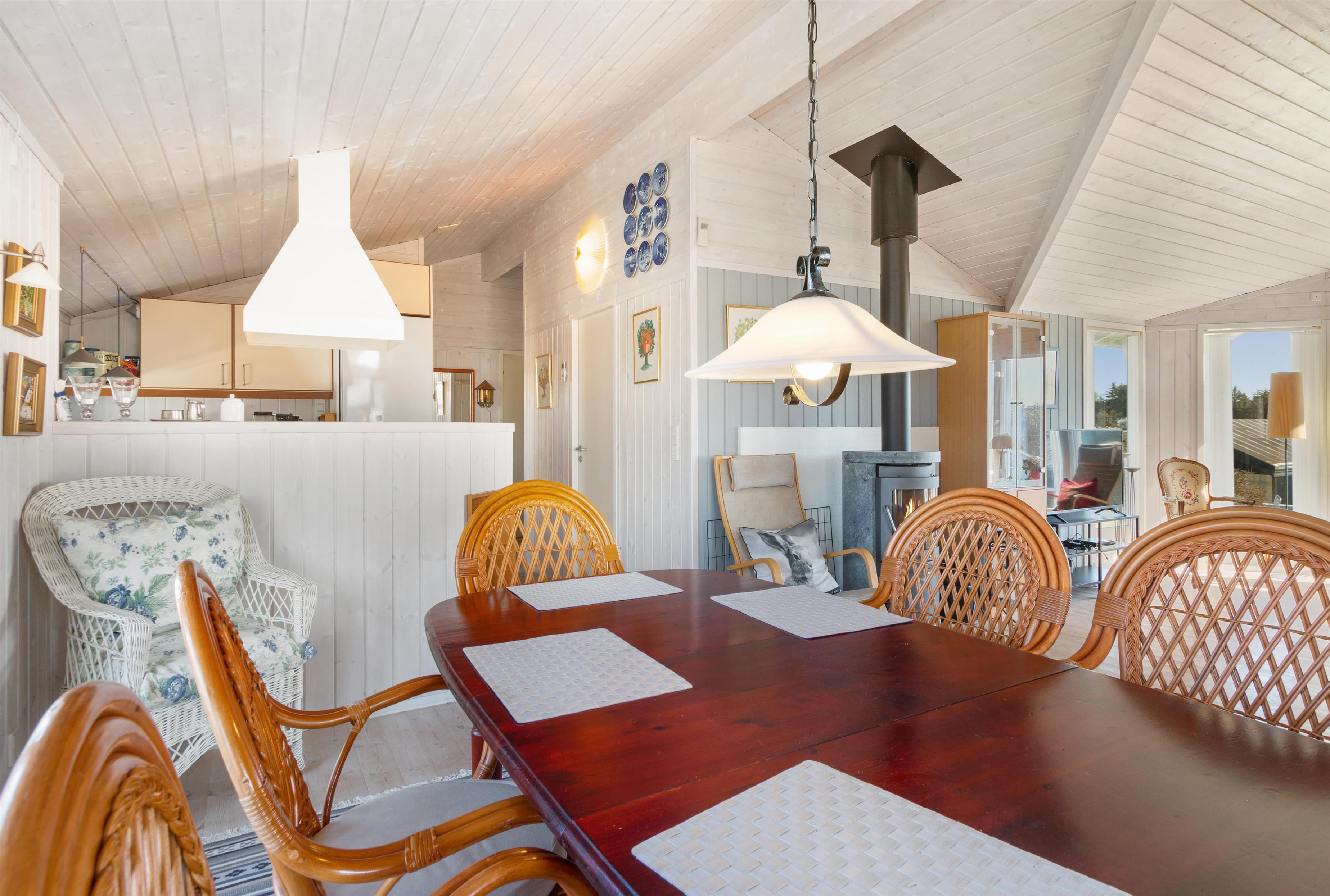 Sommerhuset er som nævnt på 91 kvadratmeter og i en rigtig flot stand. Her emmer af ægte feriestemning som i en traditionel feriebolig. Det er praktisk indrettet med bryggers og 5 sovepladser. Netop når man træder ind i huset, er der adgang til et dejligt badeværelse til venstre, som inkluderer en separat bruseniche og en spa. Fortsætter man lige ud, vil man komme ind i det andet badeværelse. Der er tre soverum og to badeværelser - praktisk indrettet med god plads til 7 personer. Dejlig åbent køkken/alrum/stue med brændeovn og et bryggers med vaskemaskine og tørretumbler. OBS. terrassen er blevet åbnet siden billederne blev taget. Ferieboligen er røgfri og ungdomsgrupper er ikke tilladt.