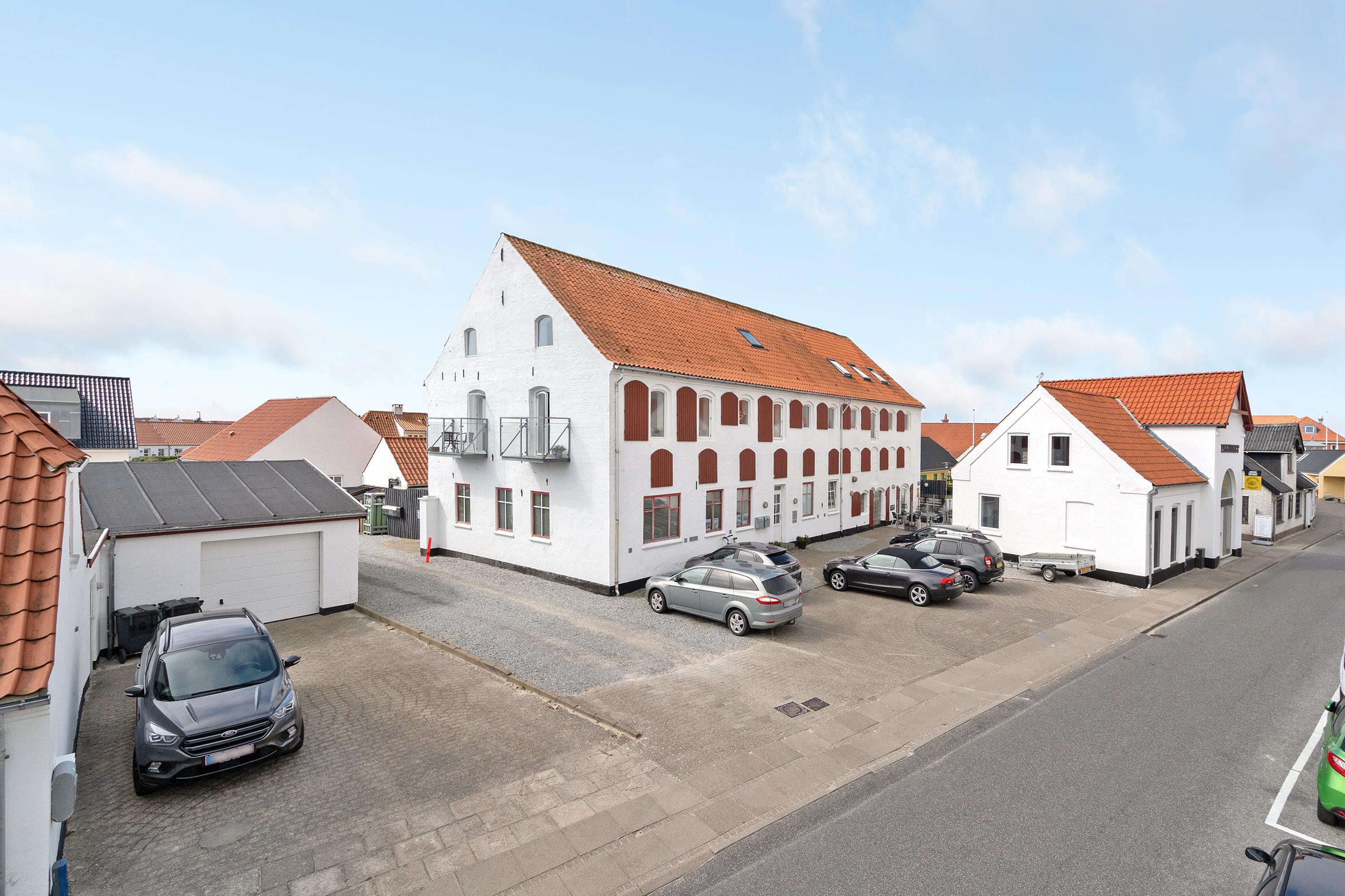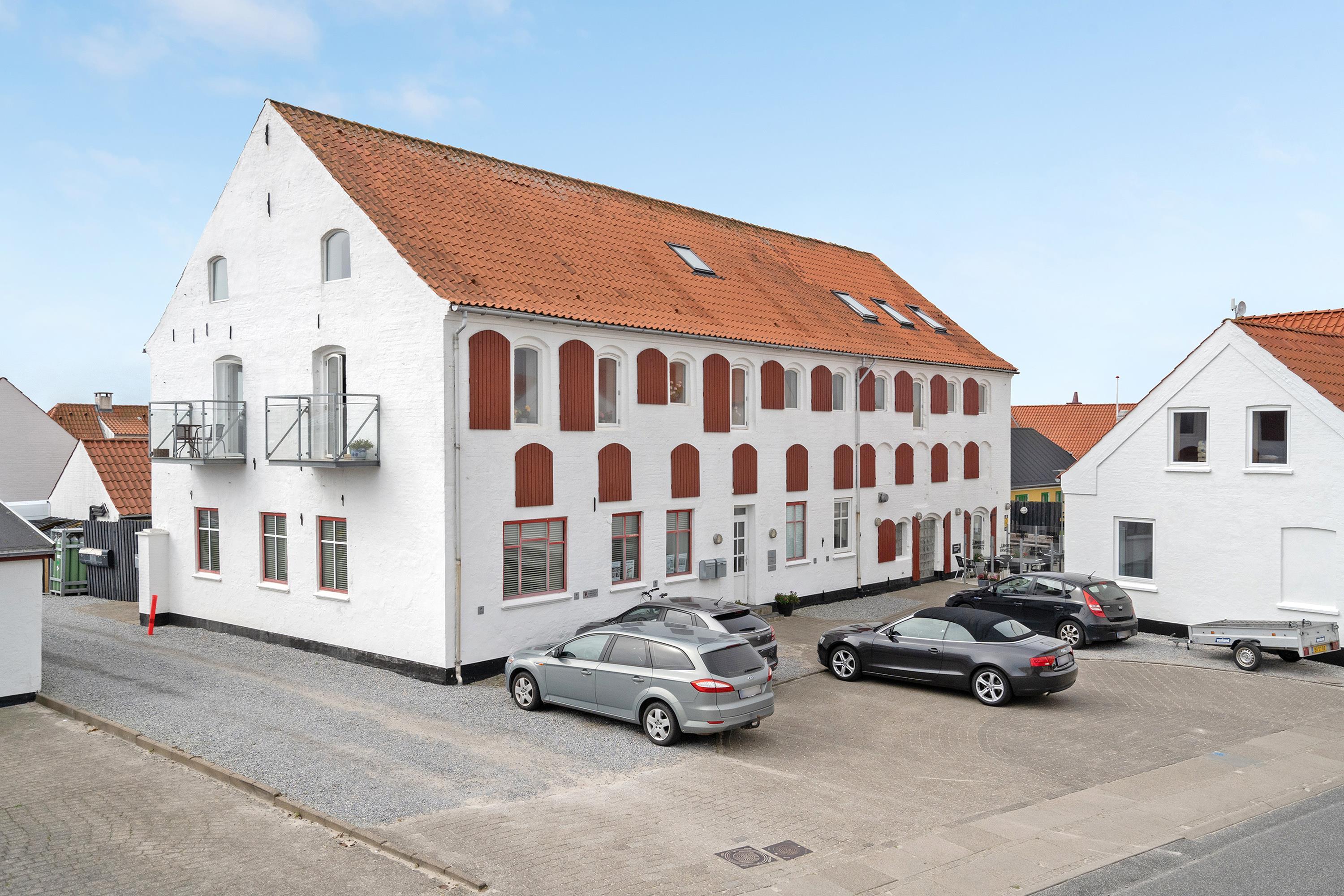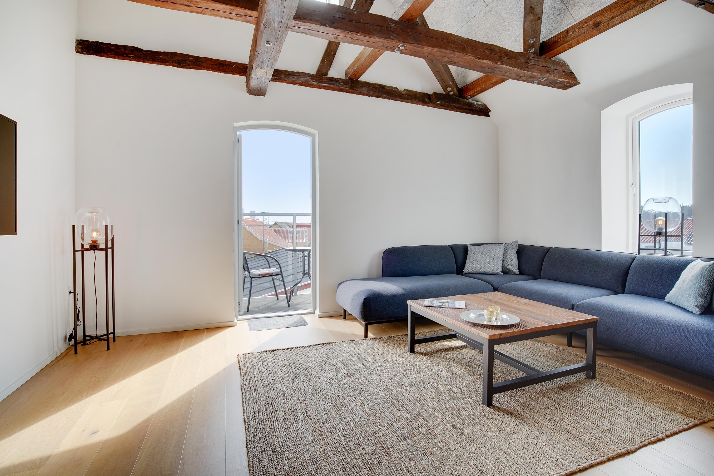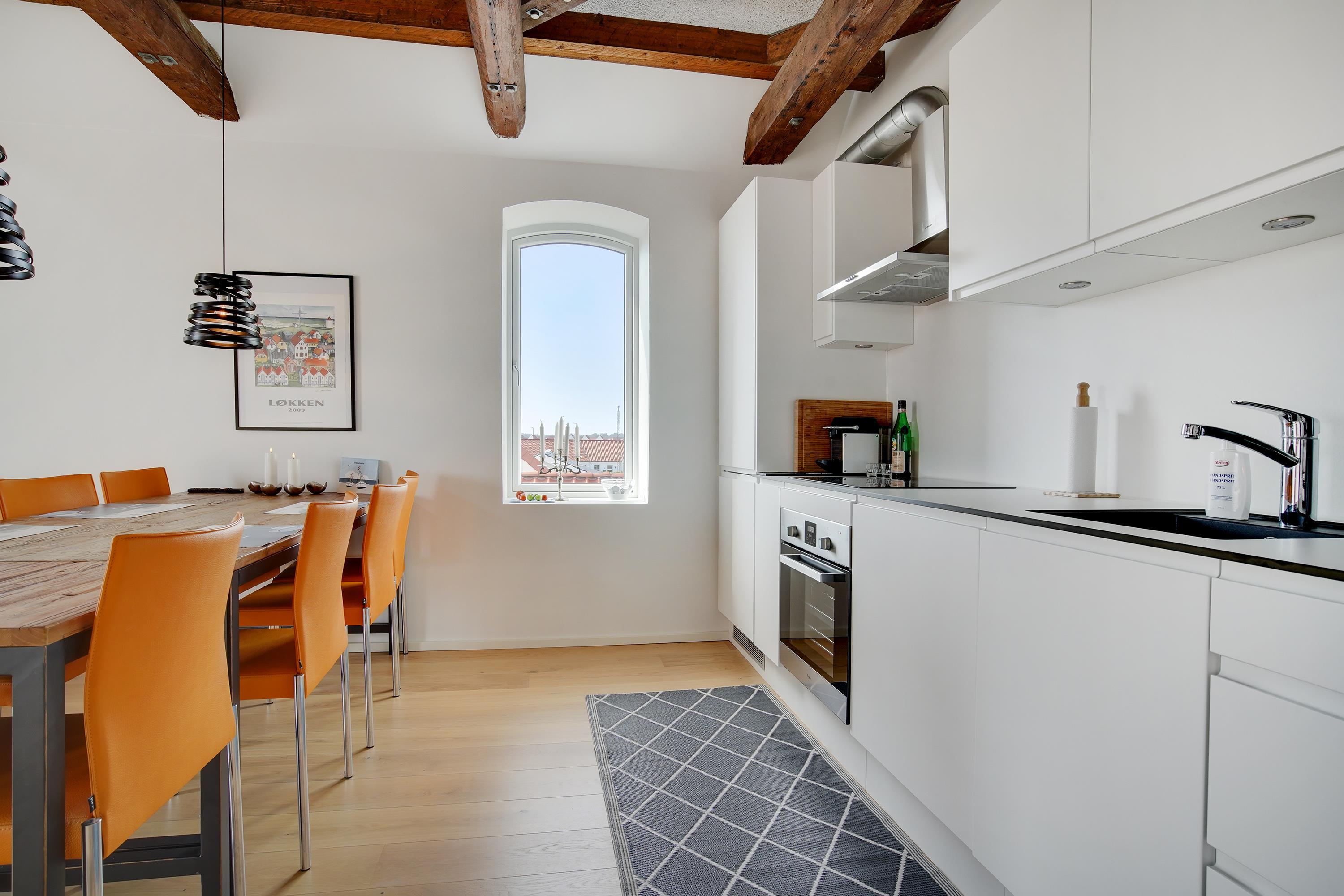 Ferielejligheden ligger midt i Løkken centrum, men her er dejlig roligt! Støjniveauet i lejligheden afslører ikke, at det pulserende byliv er netop udenfor døren. Tænk dig, at her før var diskotek - fest og farver, larm og ballade samt dæmpet belysning. Nu rummer bygningen lyse og luftige ferielejligheder, hvor man ikke fornemmer naboen på den anden side af væggen. Lyset skinner ind af de buede ruder, hvor man kan fornemme det gamle pakhus.