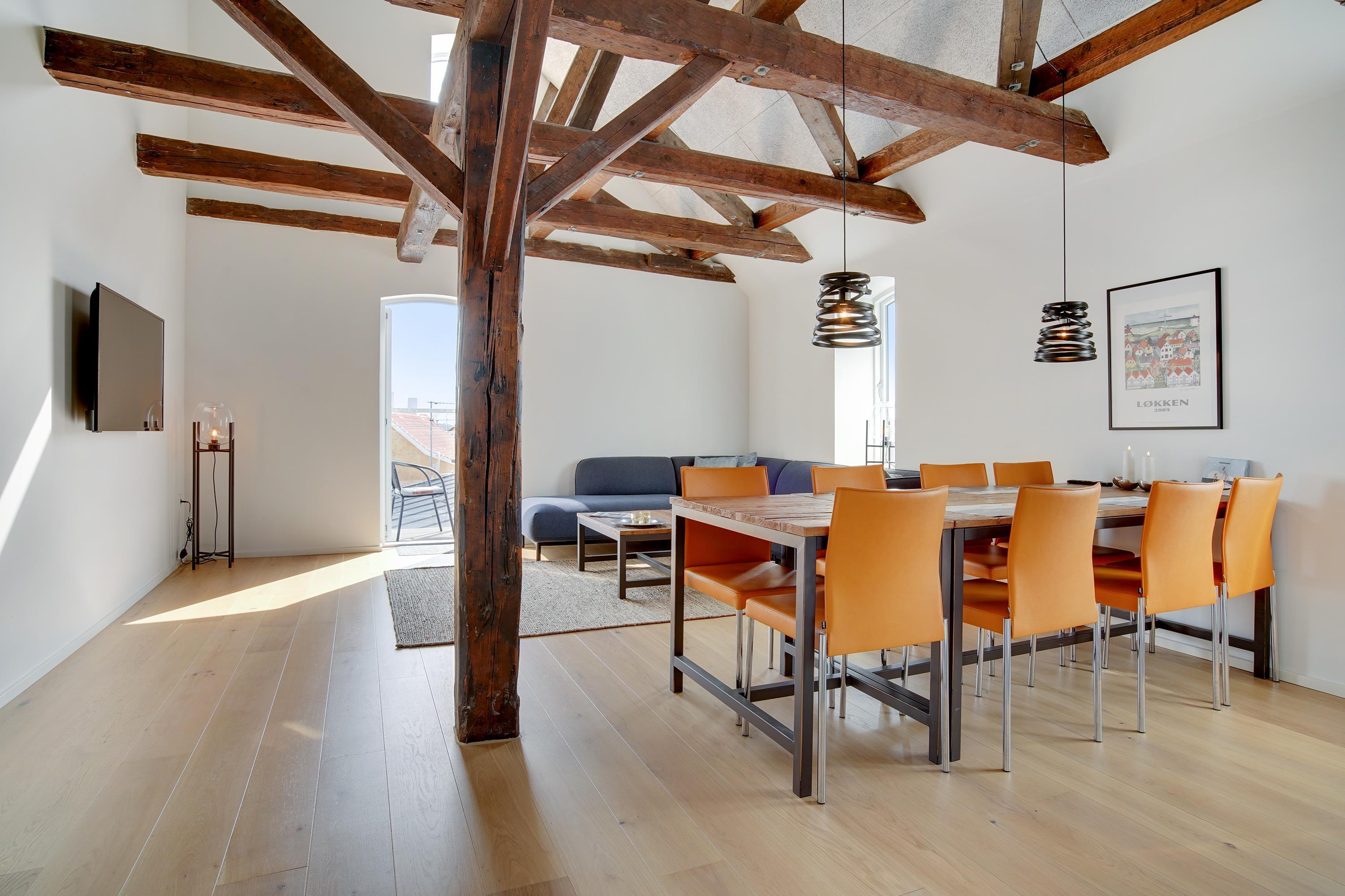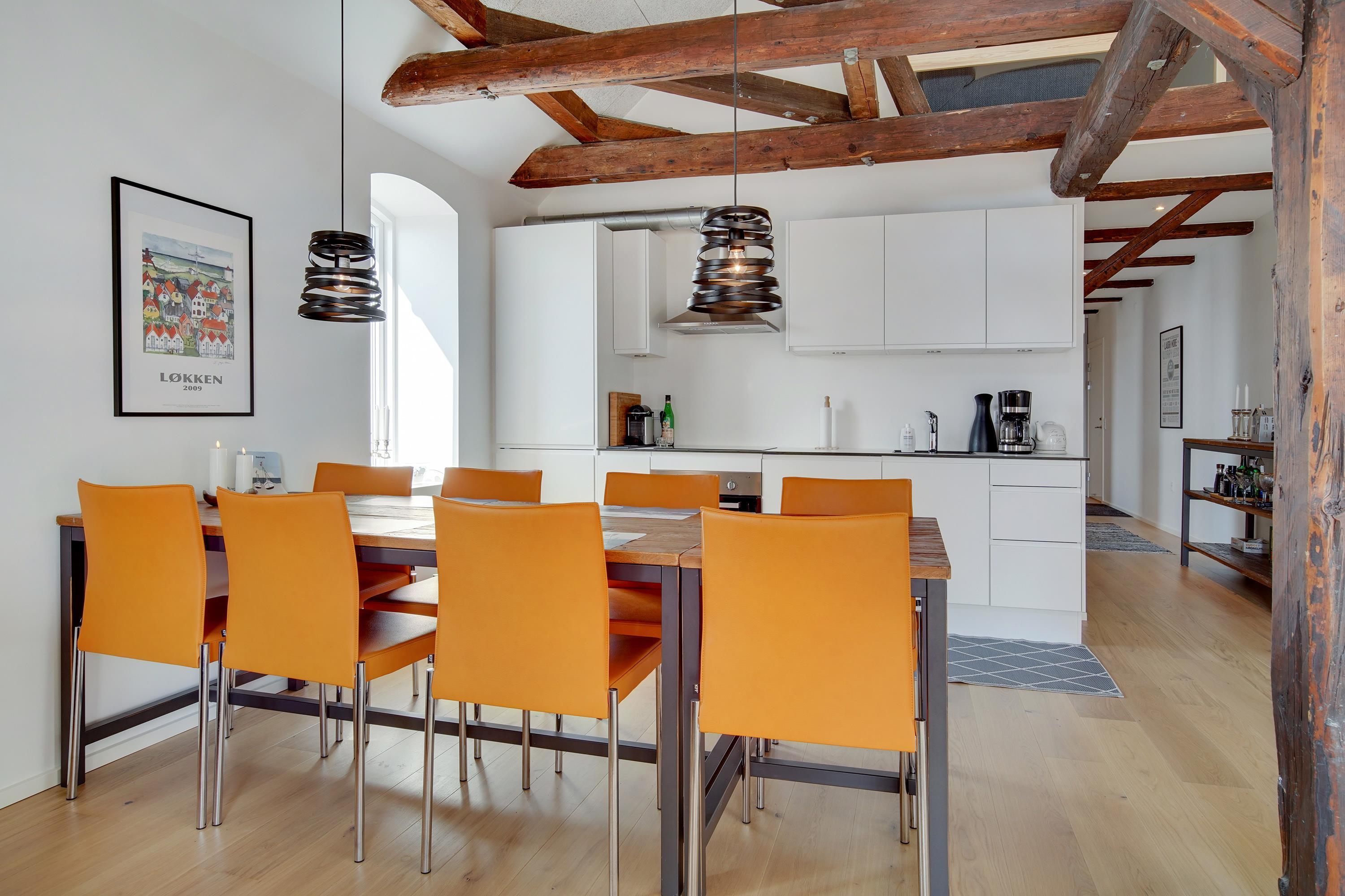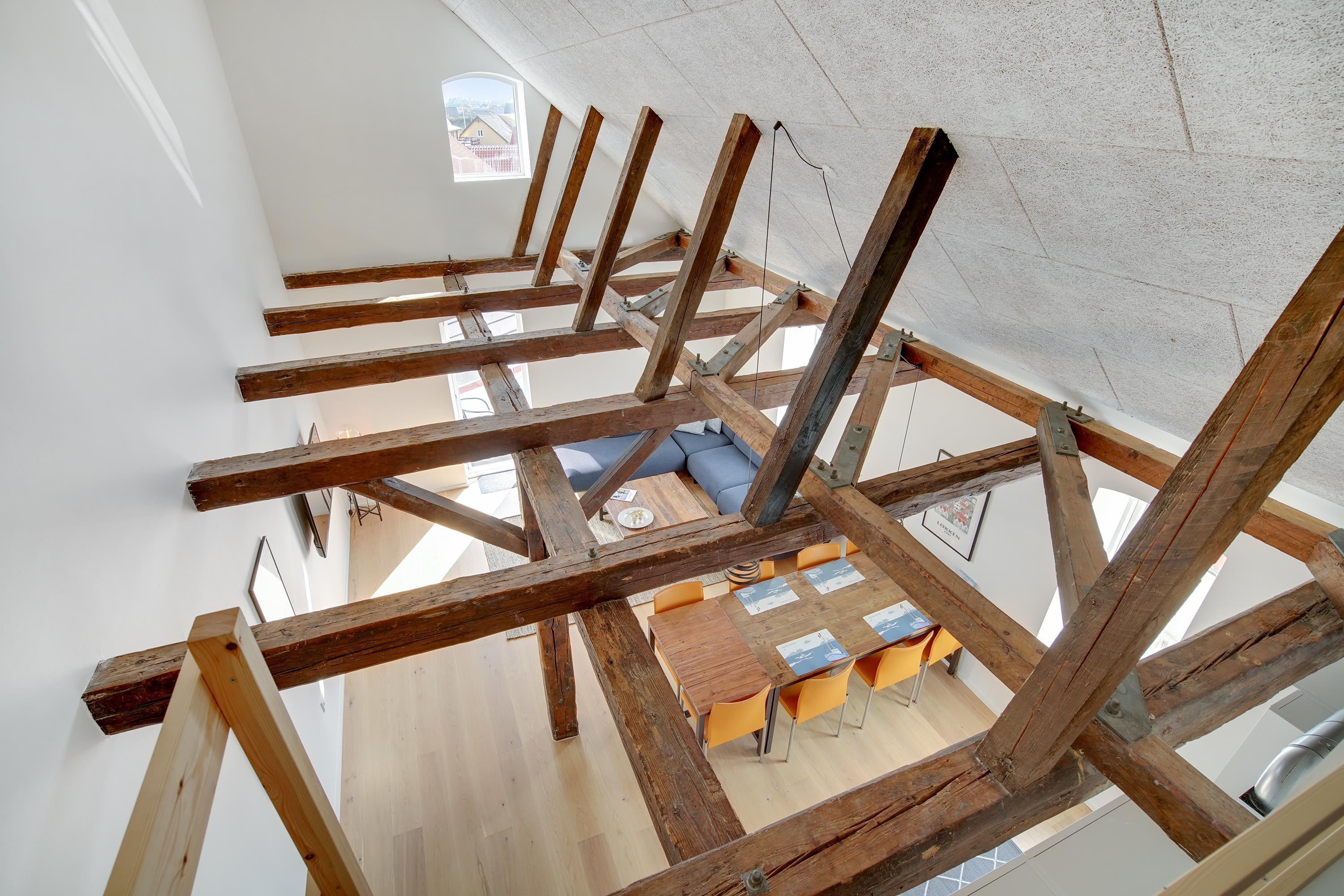 Ferielejligheden ligger midt i Løkken centrum, men her er dejlig roligt! Støjniveauet i lejligheden afslører ikke, at det pulserende byliv er netop udenfor døren. Tænk dig, at her før var diskotek - fest og farver, larm og ballade samt dæmpet belysning. Nu rummer bygningen lyse og luftige ferielejligheder, hvor man ikke fornemmer naboen på den anden side af væggen. Lyset skinner ind af de buede ruder, hvor man kan fornemme det gamle pakhus.