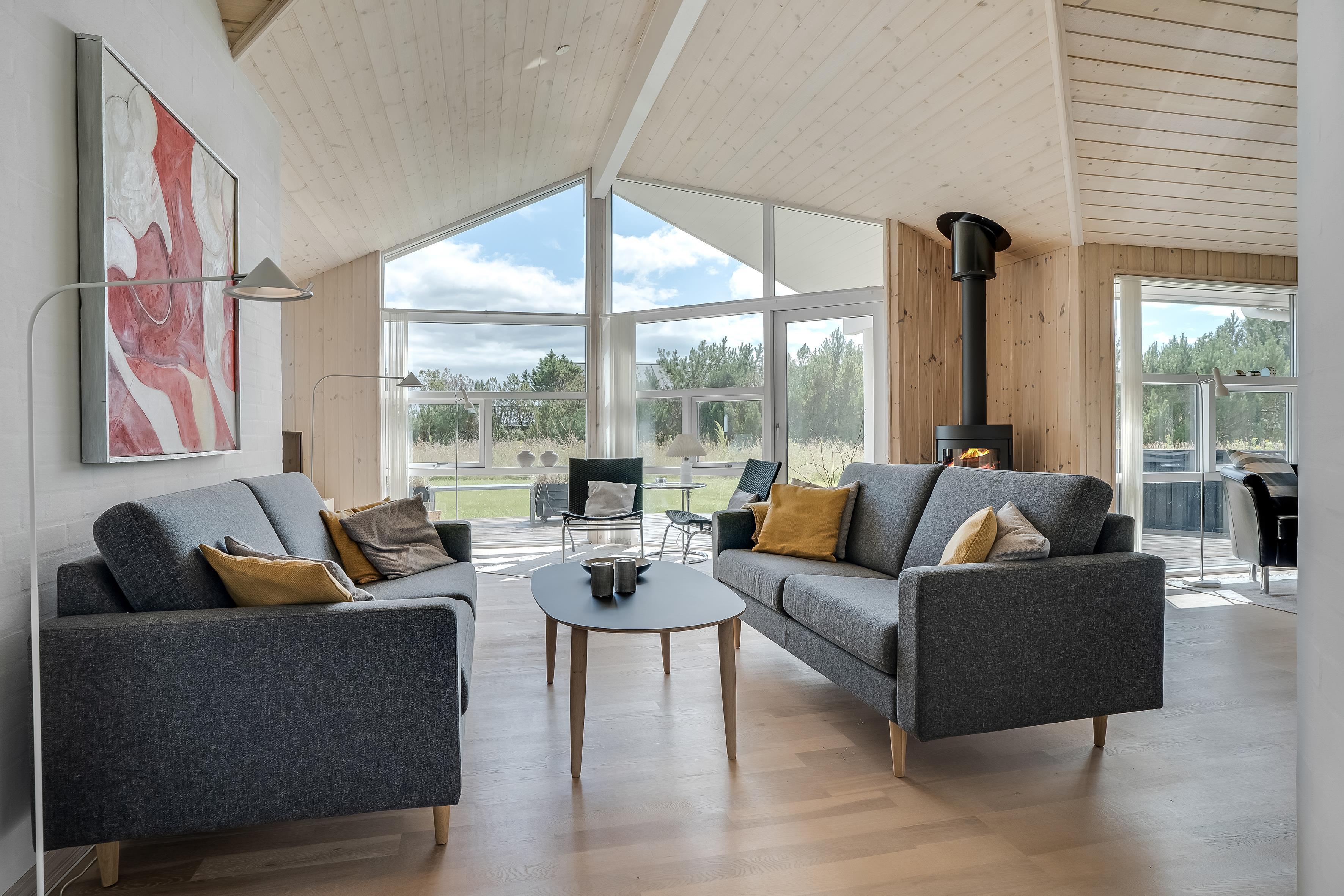 Indenfor mødes du af et lyst og åbent opholdsrum med store vinduer, der lukker masser af dagslys ind. Køkken og stue ligger i åben forbindelse, så der er god mulighed for at samles om madlavning, spil eller hygge foran brændeovnen.