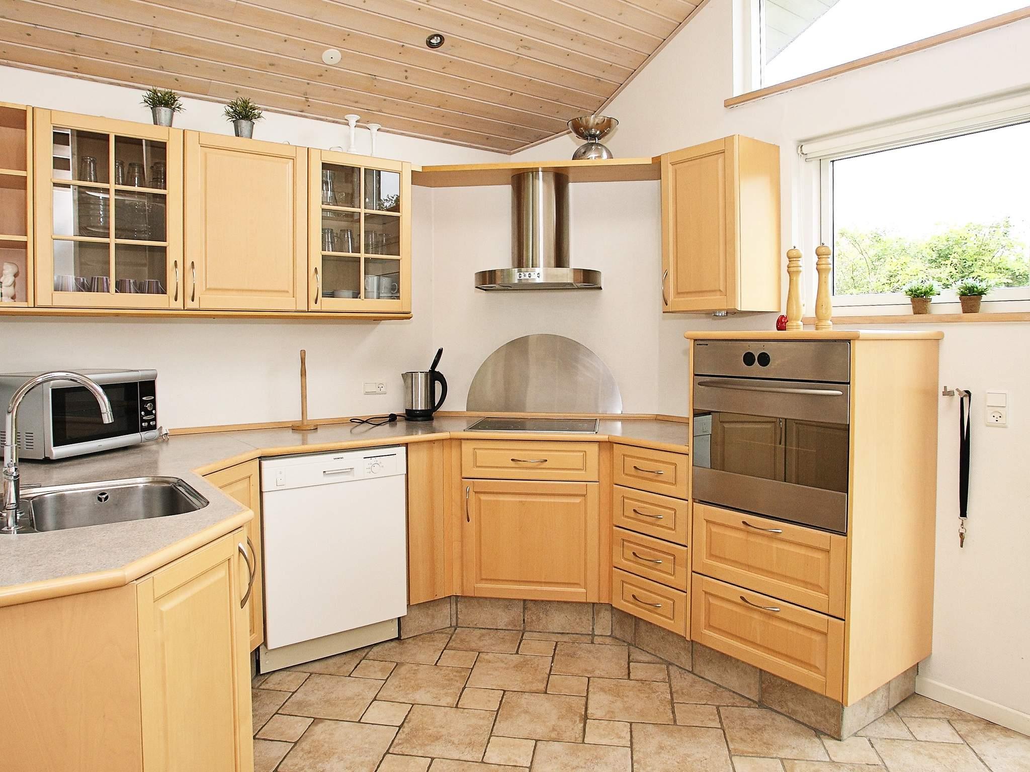 Huset er indrettet med stue i åben forbindelse med køkkenet, tre soveværelser og en hems. Til hygge og billig opvarmning er der brændeovn. Indretningener moderne med møblement i dansk design. Huset har terrasse mod øst, sydog vest, en del heraf overdækket.