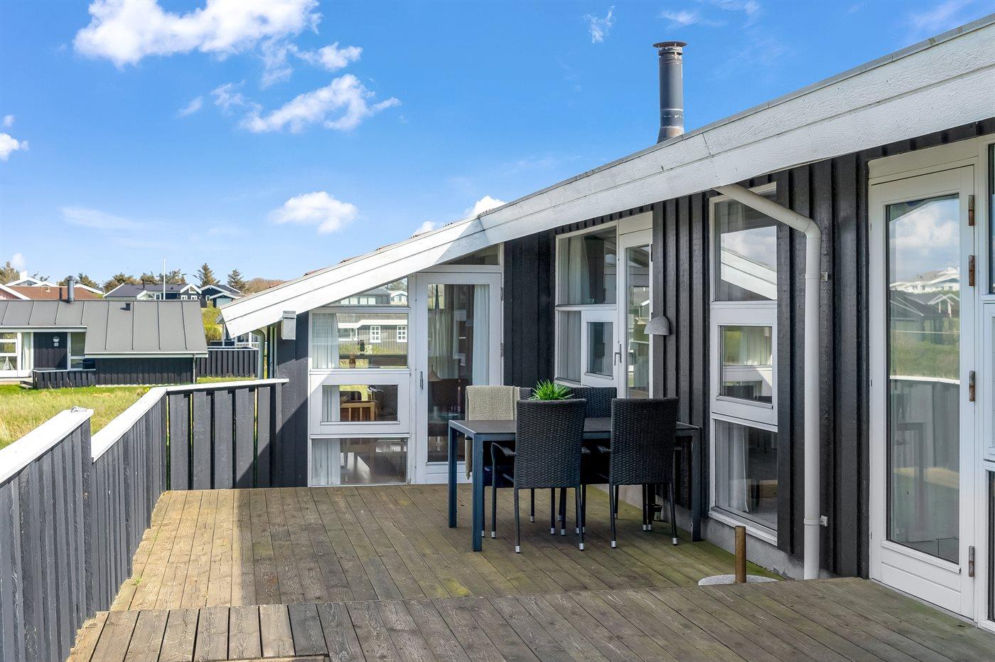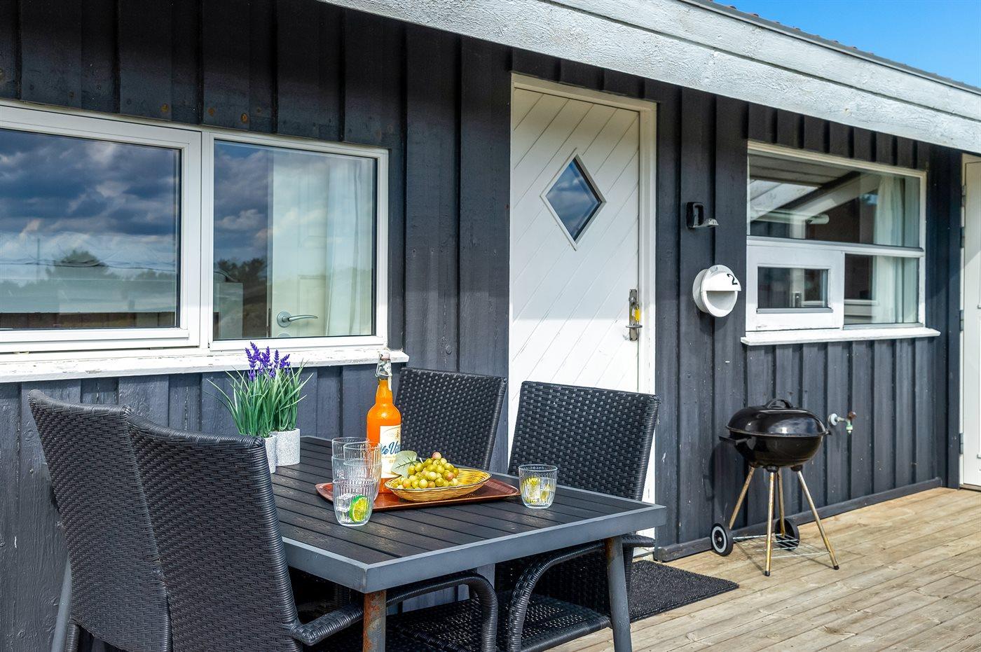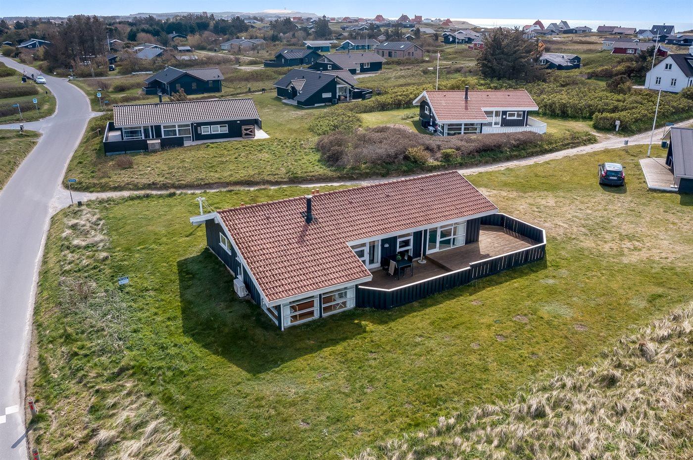 Ferieboligen er beliggende på en 1000 m² stor naturgrund. Der er 200 m til havet. Nærmeste forretning er beliggende i en afstand af 300 m. Til ferieboligen hører 90 m² terrasseareal. Heraf i alt 80 m² lukket terrasse. Der er redskabsrum. Sandkasse. Grill til rådighed. Parkering ved ferieboligen.