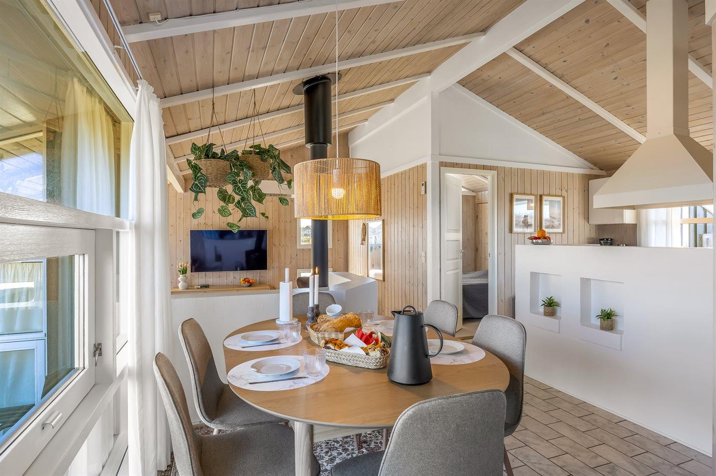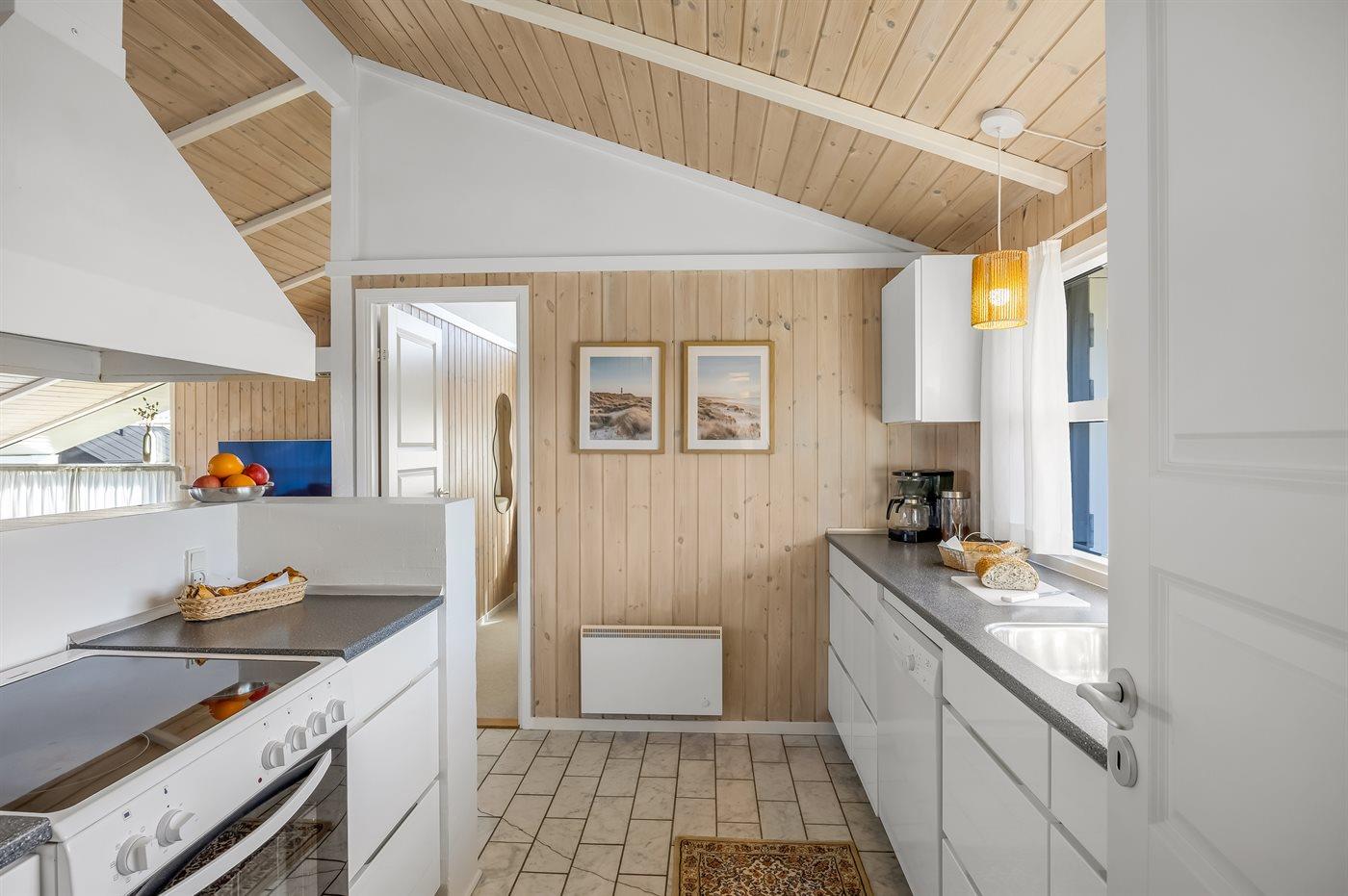 Køkkenet er udstyret med 1 køleskab. Der er 4 keramiske kogeplader, varmluftovn, mikrobølgeovn samt opvaskemaskine.