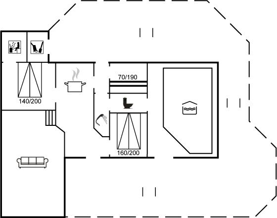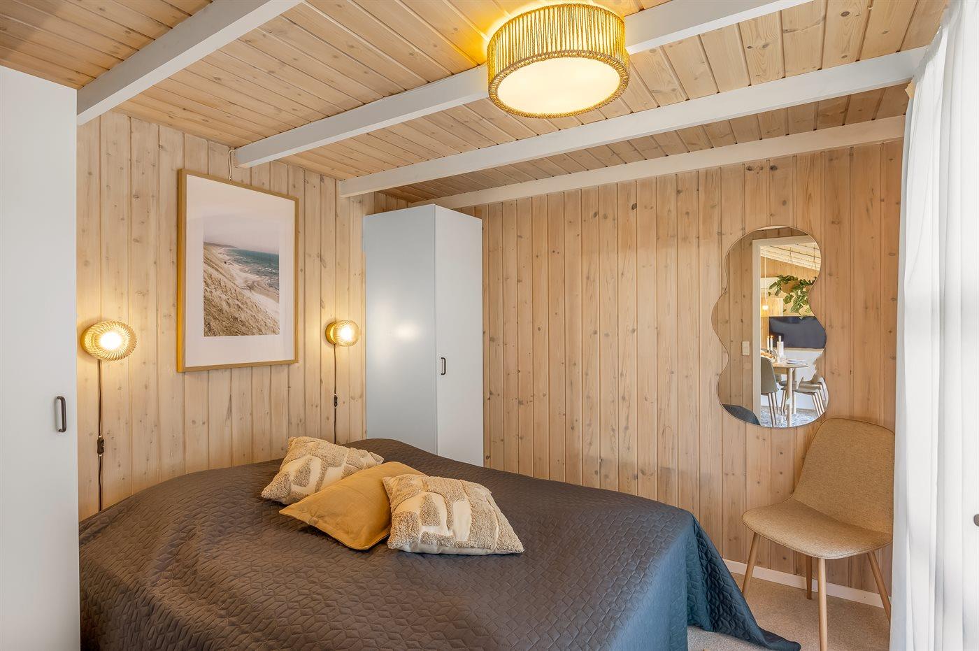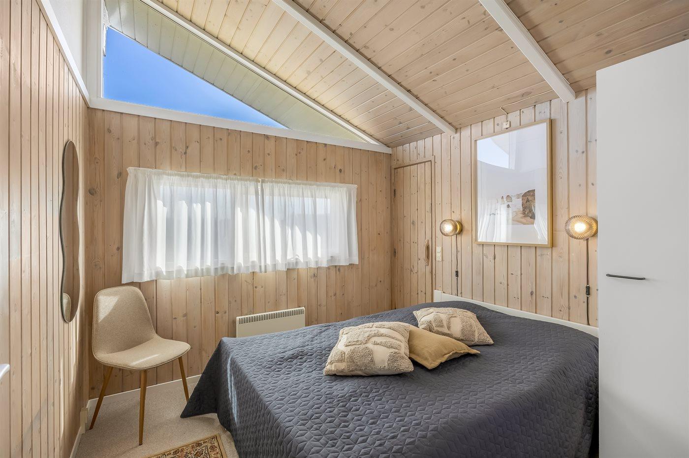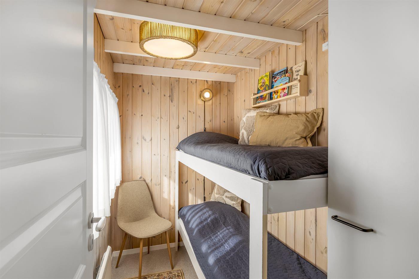 Der er i alt 3 soveværelser. Sovepladserne fordeler sig på: 4 sovepladser i dobbeltsenge. 2 sovepladser i køjeseng. Derudover er der 1 stk. barneseng.