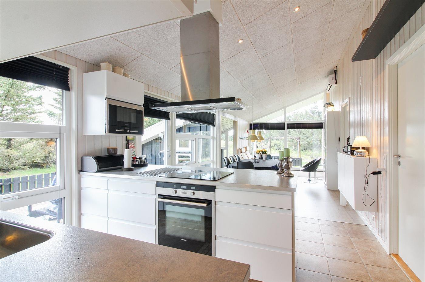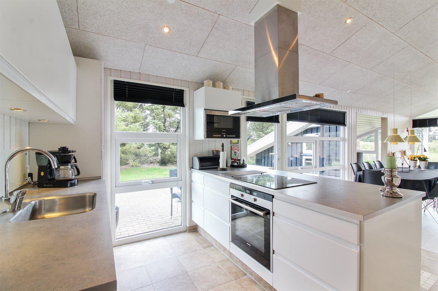Køkkenet er udstyret med køleskab og fryser med en frysekapacitet på 60 liter. Der er 4 elkogeplader, varmluftovn, mikrobølgeovn samt opvaskemaskine Der er gulvvarme i køkkenet.