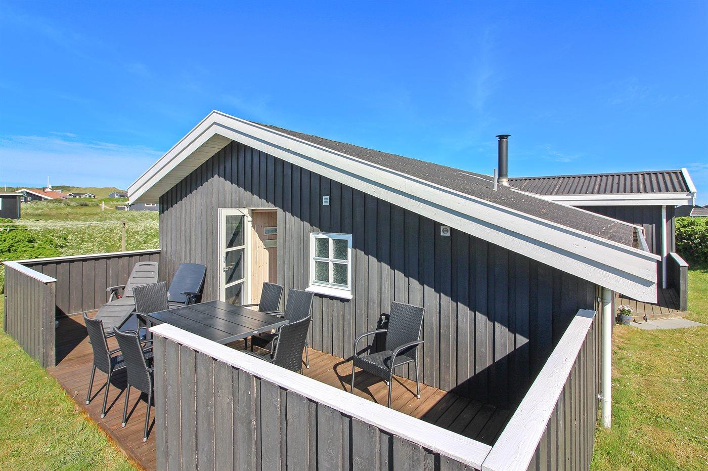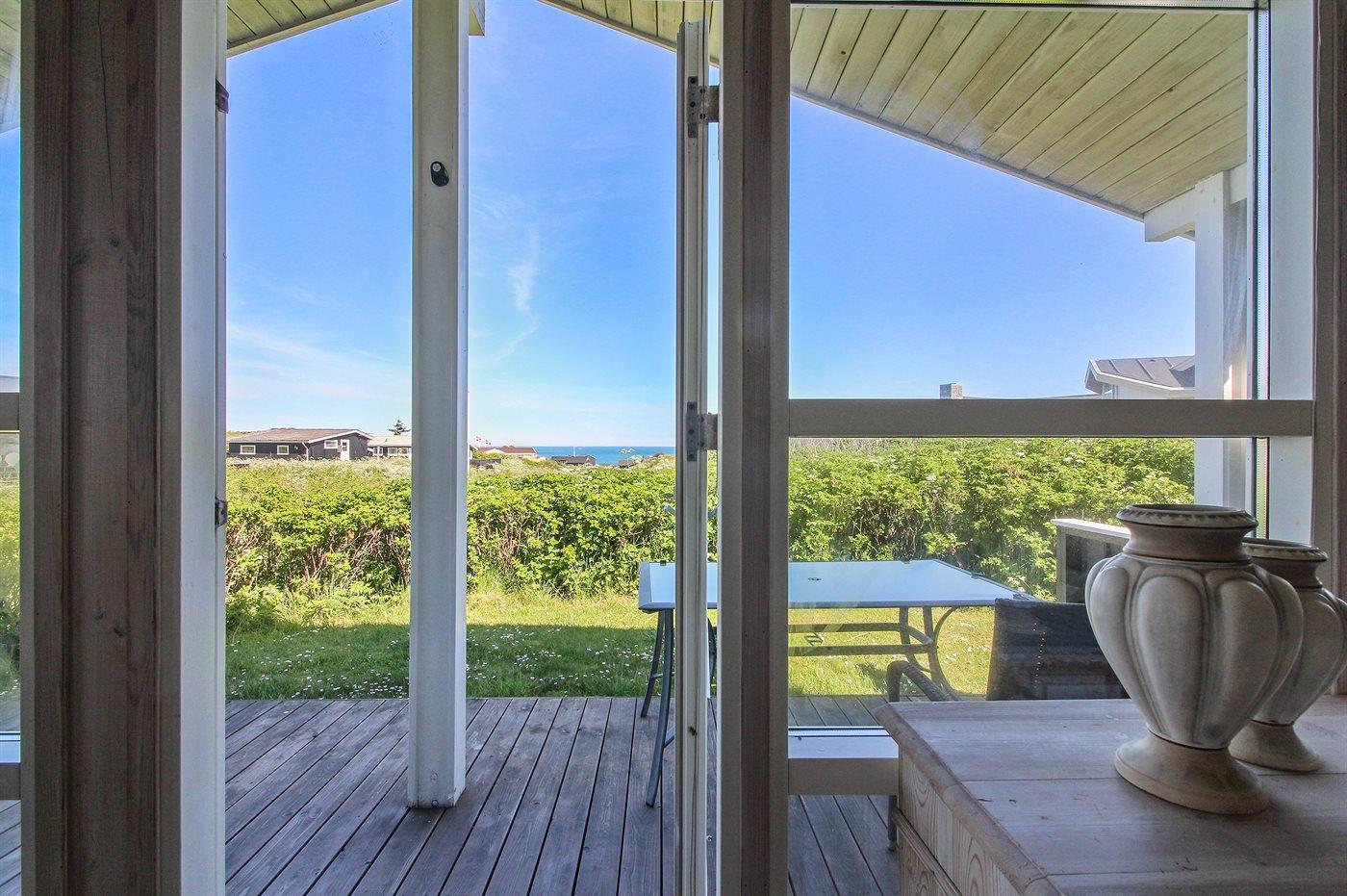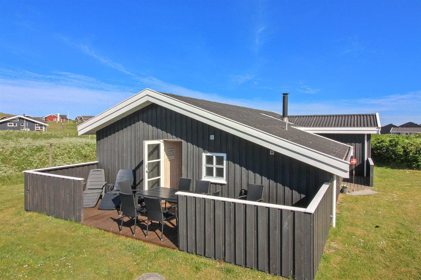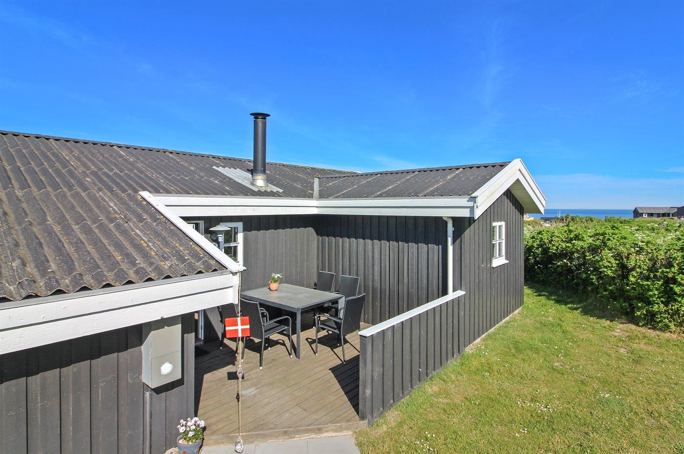 Dejligt sommerhus i træ, bygget i 2001, beliggende på en klitgrund, kun 300 m fra havet. Skøn havudsigt gennem naturskabt kløft fra såvel hus som grund. Åben og overdækket terrasse med havemøbler. Indvendig er der klinkegulv i badeværelse, gang og køkken, ellers fyrretræsgulve. Vægge og lofter er beklædt med lyst, ludbehandlet træ. Flot badeværelse med gulvvarme, bruseniche, vaskemaskine, 2-pers. spa og sauna. Moderne og veludstyret køkken med bl.a. fryser, mikrobølgeovn og opvaskemaskine. Den smagfuldt indrettede opholdsstue indeholder brændeovn, stereoanlæg med CD-afspiller, DVD-afspiller samt TV med parabol (digital) og video. De 3 soverum; heraf 2 med dobbeltseng og 1 med køjeseng samt 2 sovepladser på husets hems, gør huset velegnet for 2 familier. Endvidere gratis, trådløs internetforbindelse (computer skal medbringes), barneseng og høj barnestol til rådighed. Sandkasse og gynge. 4 km til stort aktivitetscenter med bl.a. tropisk badeland, tennis og ridning.