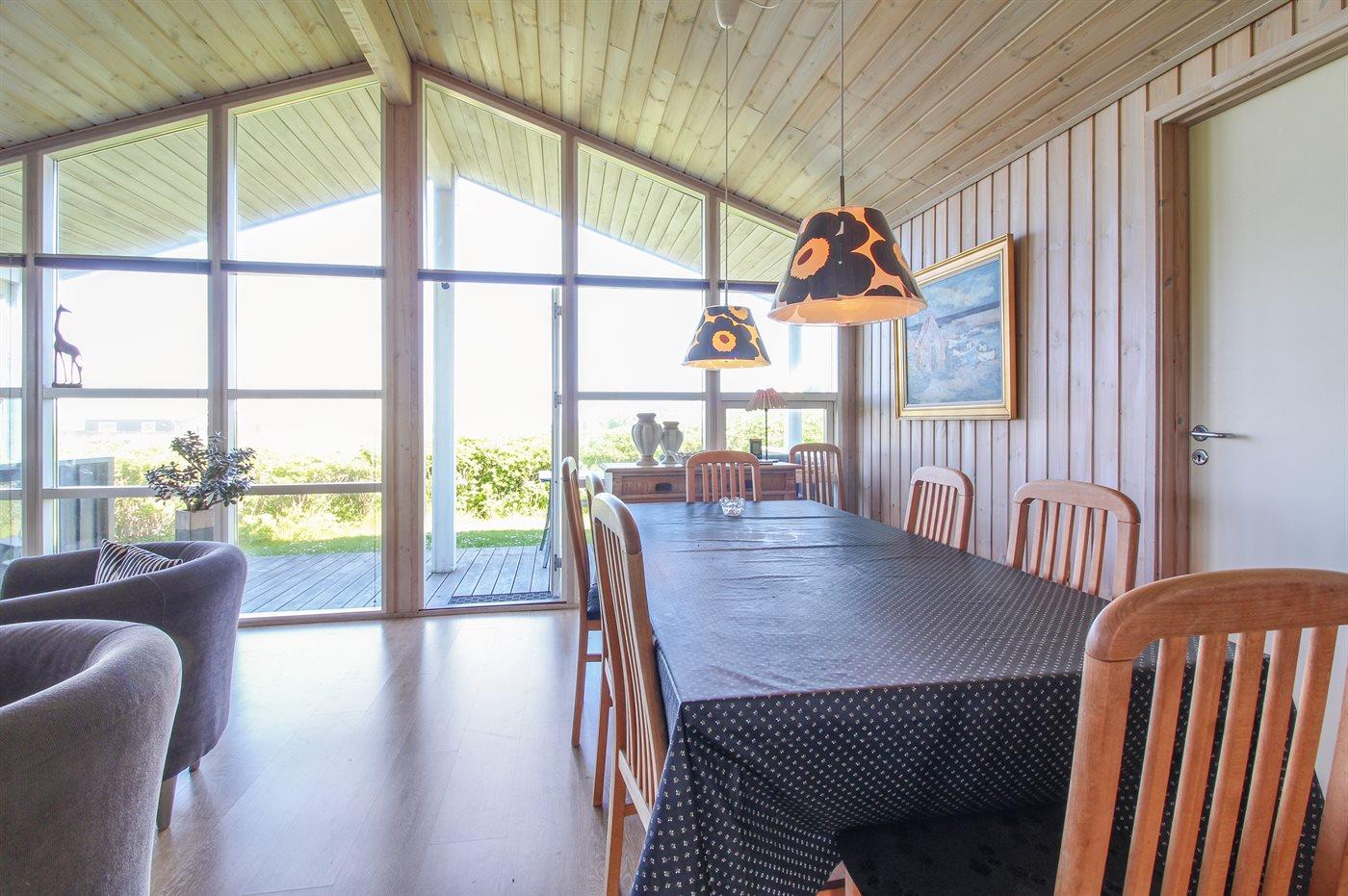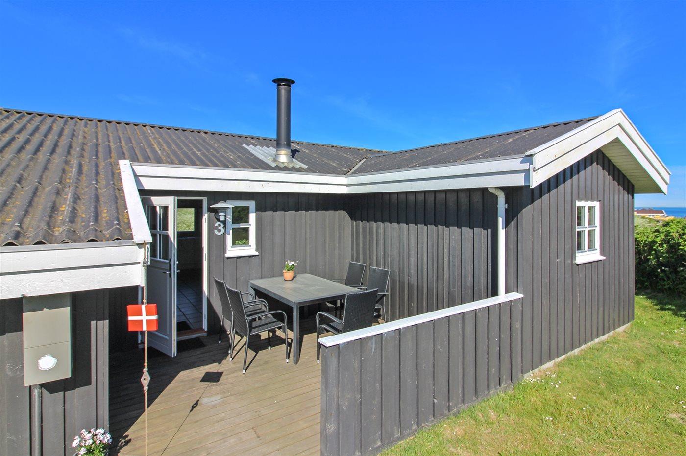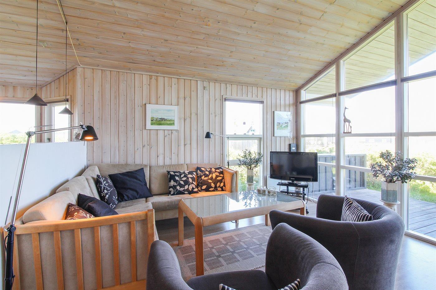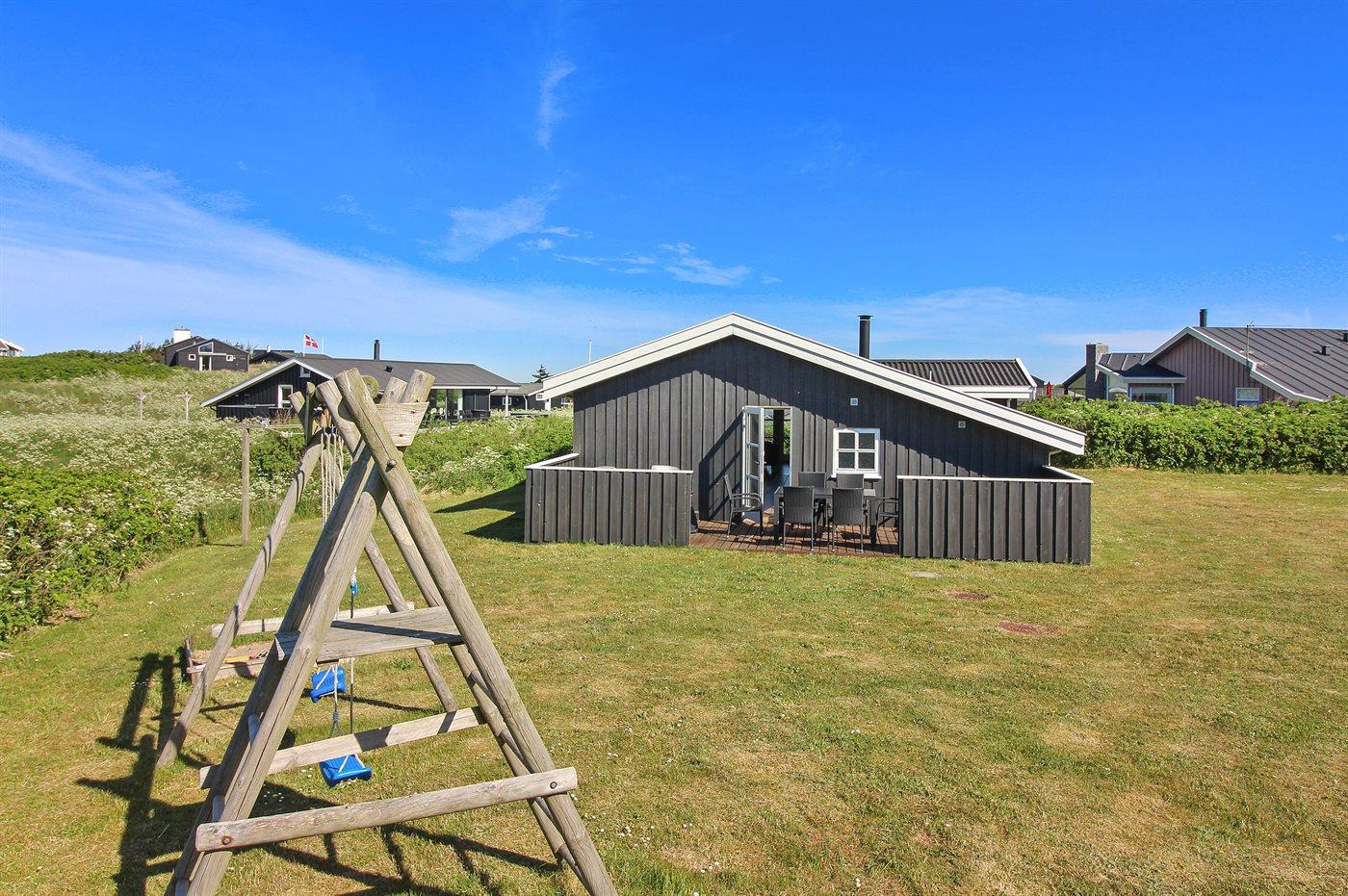 Dejligt sommerhus i træ, bygget i 2001, beliggende på en klitgrund, kun 300 m fra havet. Skøn havudsigt gennem naturskabt kløft fra såvel hus som grund. Åben og overdækket terrasse med havemøbler. Indvendig er der klinkegulv i badeværelse, gang og køkken, ellers fyrretræsgulve. Vægge og lofter er beklædt med lyst, ludbehandlet træ. Flot badeværelse med gulvvarme, bruseniche, vaskemaskine, 2-pers. spa og sauna. Moderne og veludstyret køkken med bl.a. fryser, mikrobølgeovn og opvaskemaskine. Den smagfuldt indrettede opholdsstue indeholder brændeovn, stereoanlæg med CD-afspiller, DVD-afspiller samt TV med parabol (digital) og video. De 3 soverum; heraf 2 med dobbeltseng og 1 med køjeseng samt 2 sovepladser på husets hems, gør huset velegnet for 2 familier. Endvidere gratis, trådløs internetforbindelse (computer skal medbringes), barneseng og høj barnestol til rådighed. Sandkasse og gynge. 4 km til stort aktivitetscenter med bl.a. tropisk badeland, tennis og ridning.
