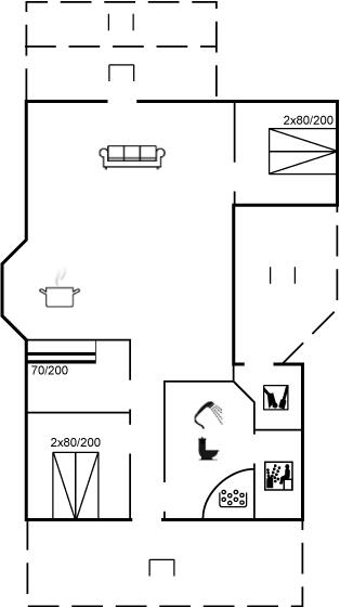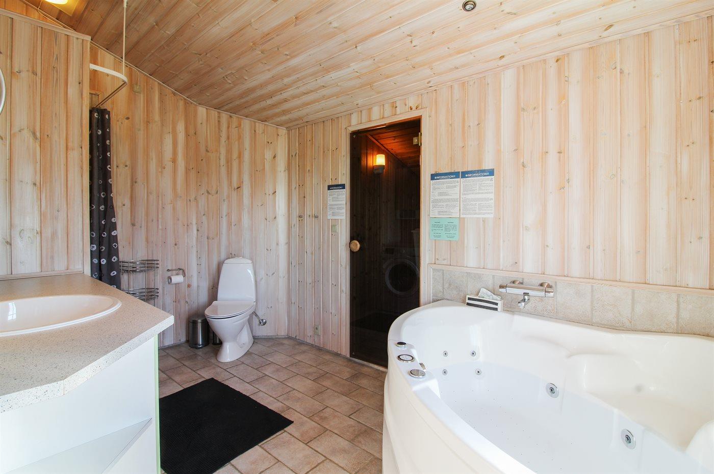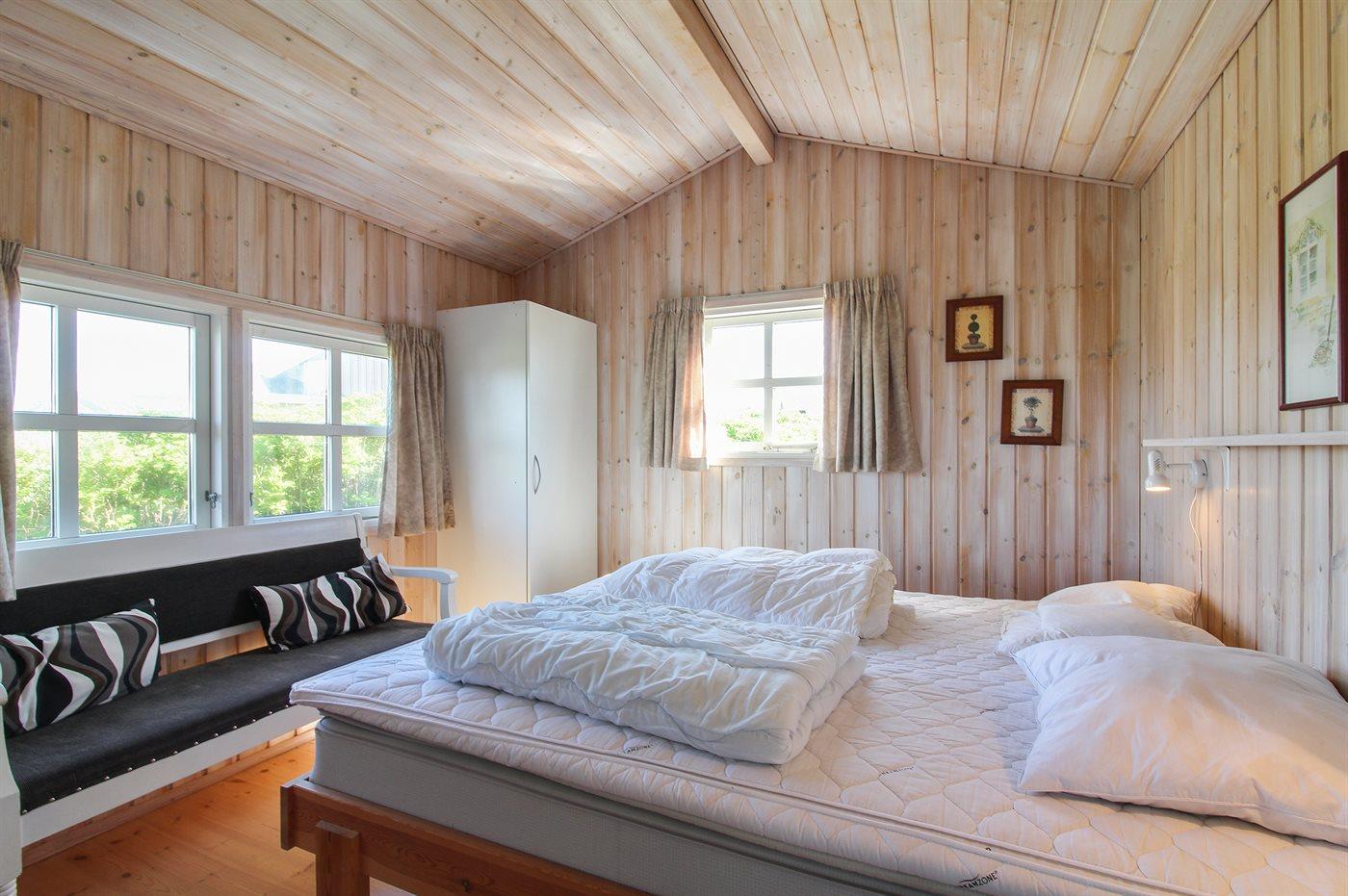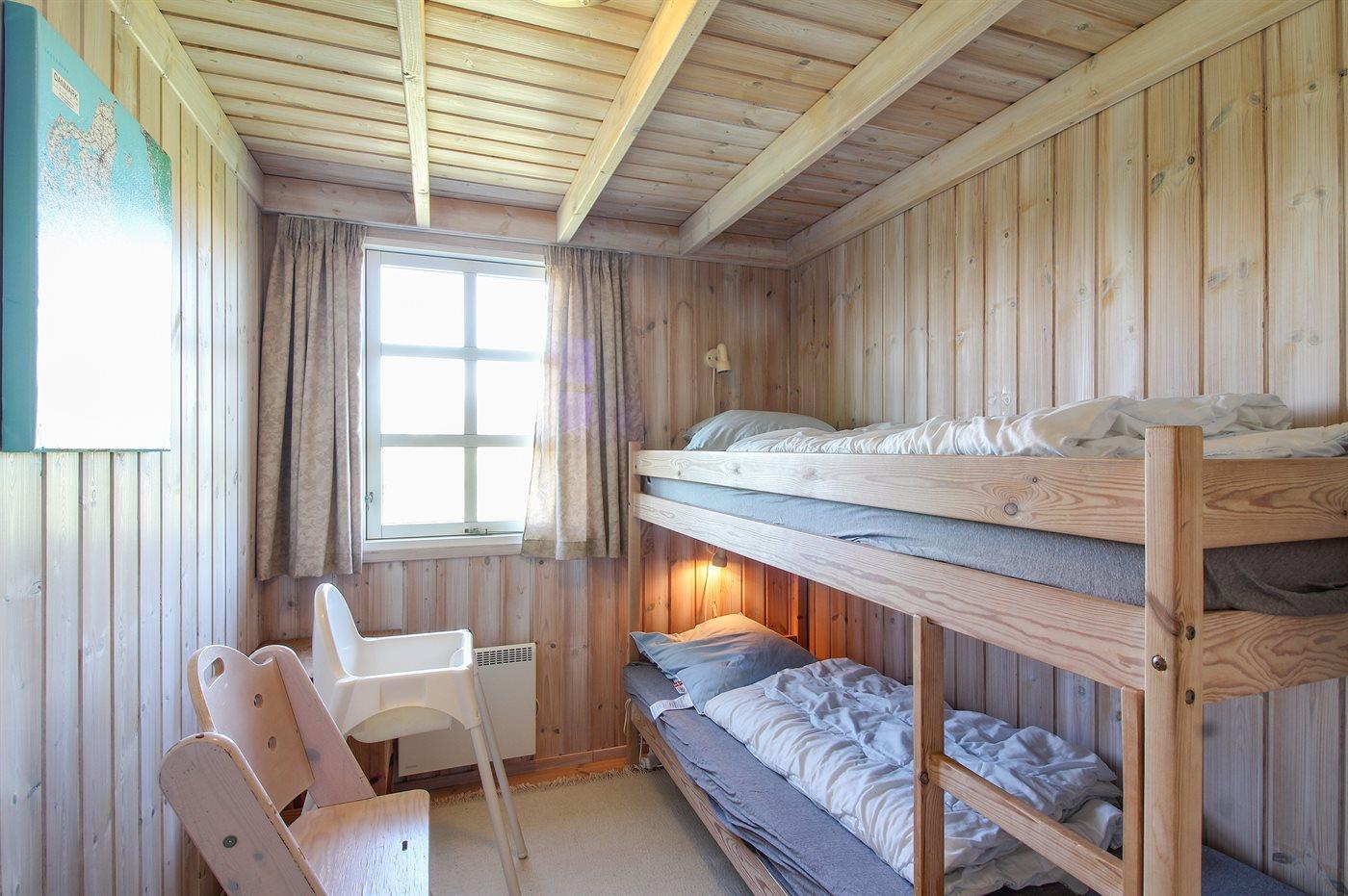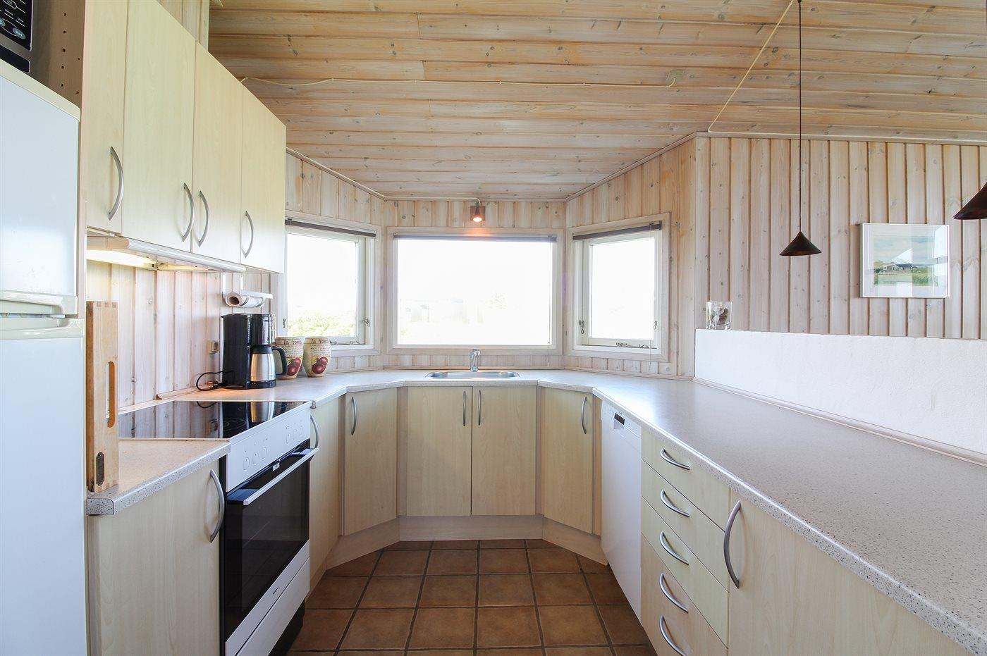 Dejligt sommerhus i træ, bygget i 2001, beliggende på en klitgrund, kun 300 m fra havet. Skøn havudsigt gennem naturskabt kløft fra såvel hus som grund. Åben og overdækket terrasse med havemøbler. Indvendig er der klinkegulv i badeværelse, gang og køkken, ellers fyrretræsgulve. Vægge og lofter er beklædt med lyst, ludbehandlet træ. Flot badeværelse med gulvvarme, bruseniche, vaskemaskine, 2-pers. spa og sauna. Moderne og veludstyret køkken med bl.a. fryser, mikrobølgeovn og opvaskemaskine. Den smagfuldt indrettede opholdsstue indeholder brændeovn, stereoanlæg med CD-afspiller, DVD-afspiller samt TV med parabol (digital) og video. De 3 soverum; heraf 2 med dobbeltseng og 1 med køjeseng samt 2 sovepladser på husets hems, gør huset velegnet for 2 familier. Endvidere gratis, trådløs internetforbindelse (computer skal medbringes), barneseng og høj barnestol til rådighed. Sandkasse og gynge. 4 km til stort aktivitetscenter med bl.a. tropisk badeland, tennis og ridning.