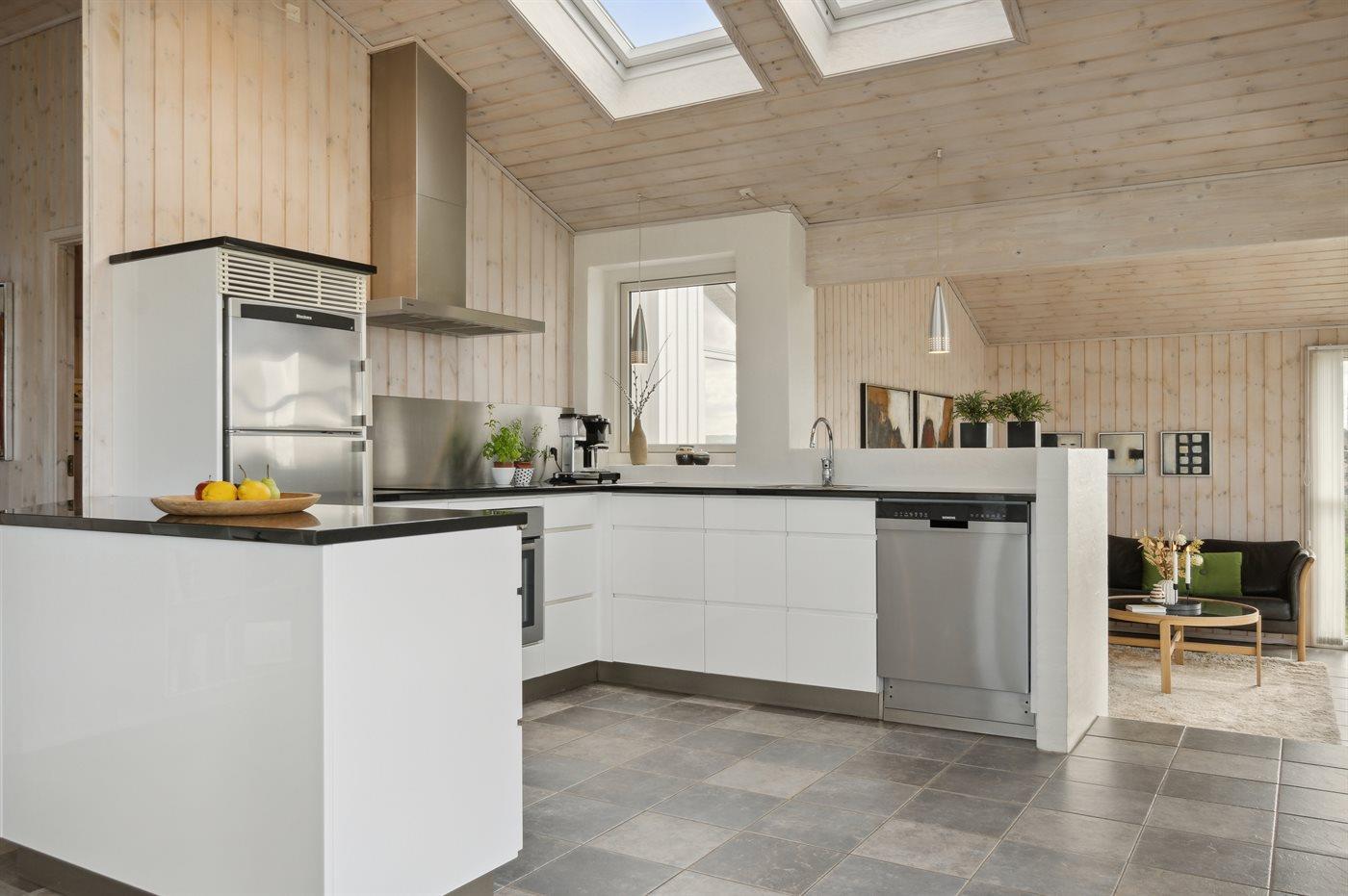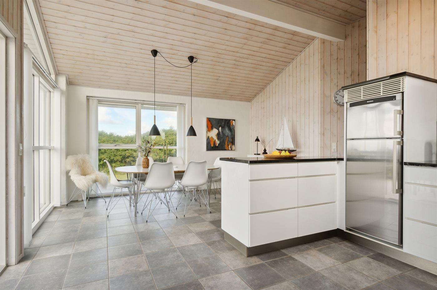 Køkkenet er udstyret med 1 køleskab. Der er 4 keramiske kogeplader, varmluftovn samt opvaskemaskine.