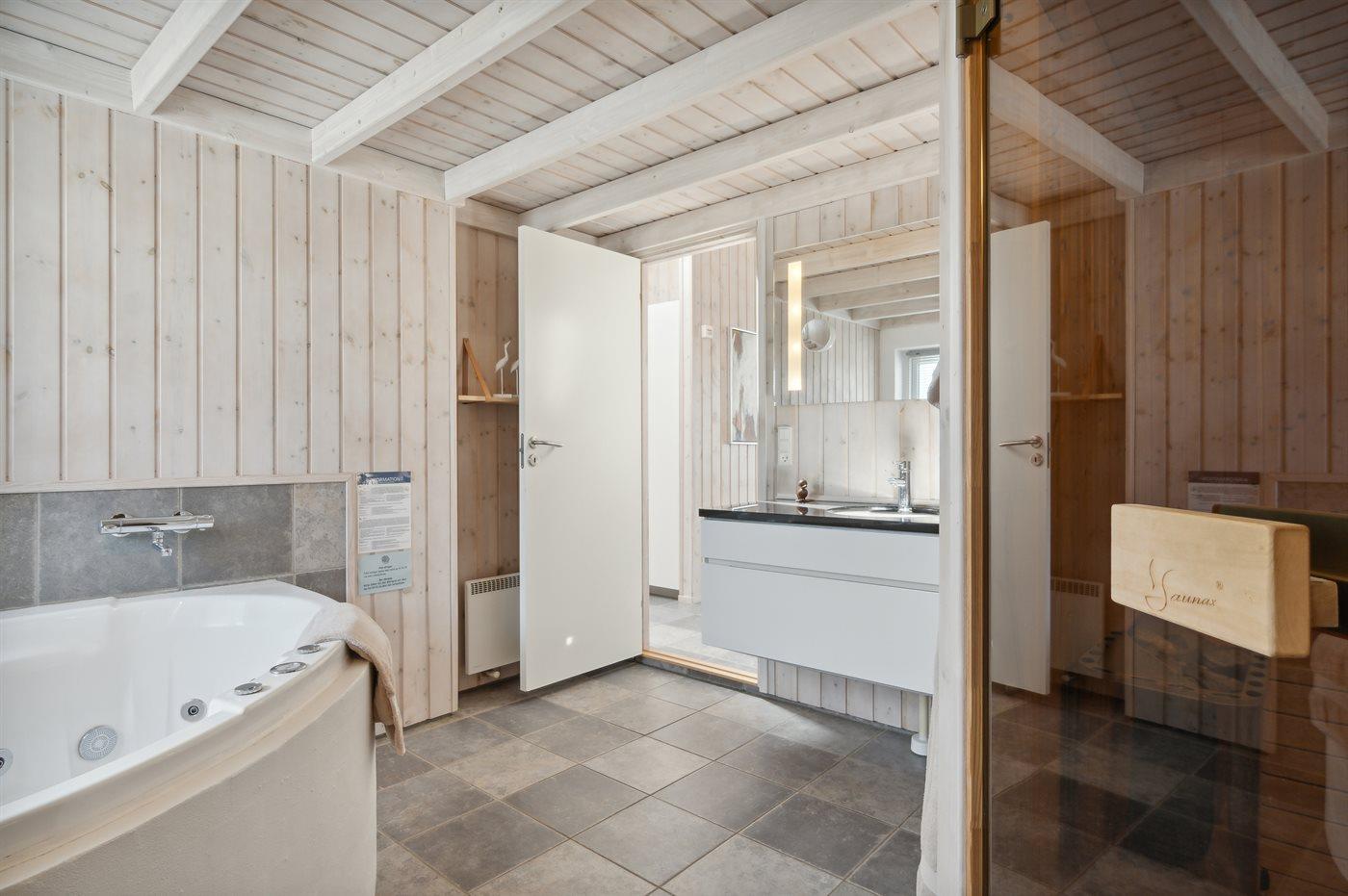 Der er 2 badeværelser med bruseniche og 2 toiletter. Der er gulvvarme på 1 badeværelse. I saunaen er der mulighed for afslapning.